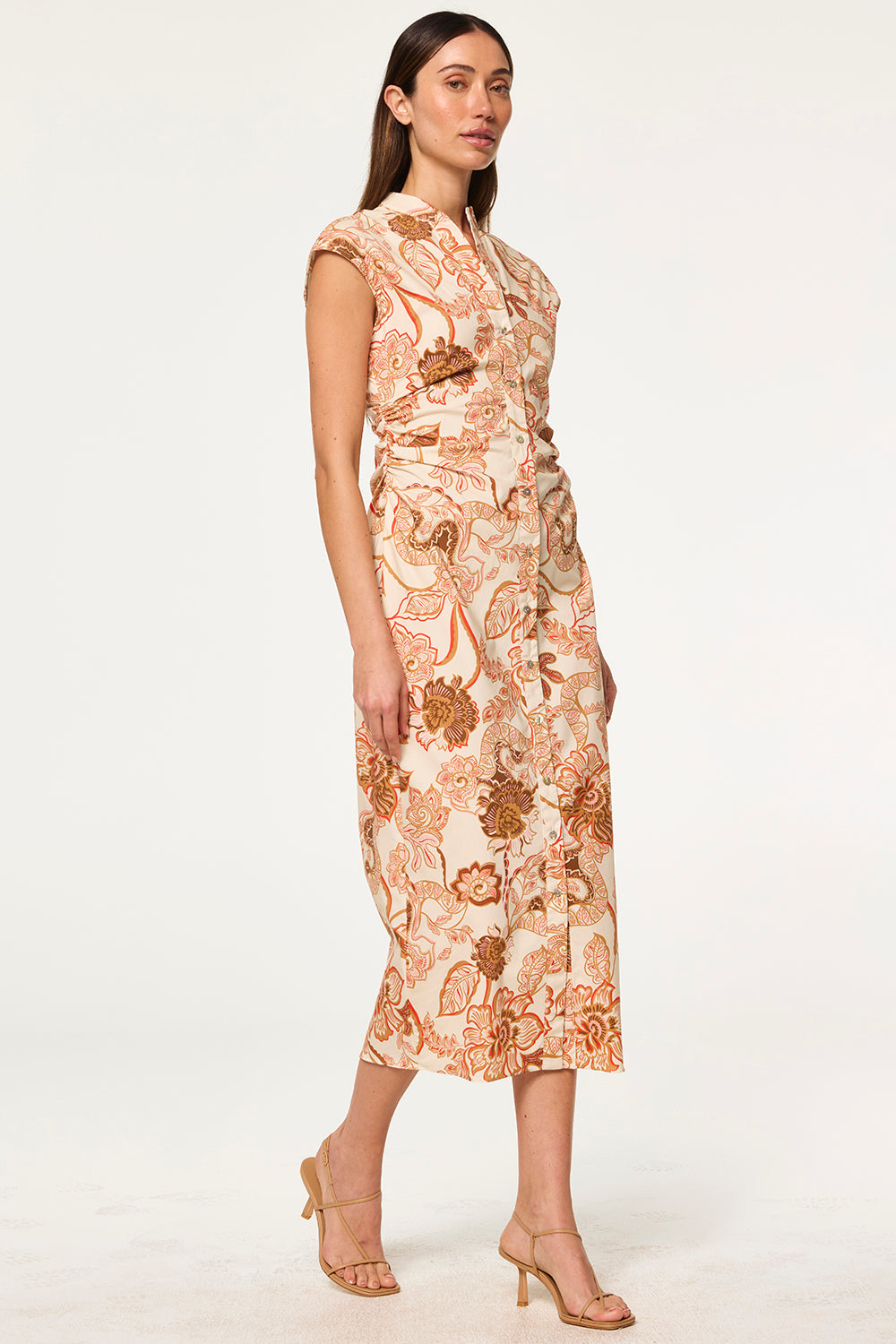 The Niara dress is an all-new midi silhouette perfect for the late summer to early fall transition. Cut in a Summer Batik printed stretch cotton poplin, it’s designed sleeveless with a full button front and a high neckline with a subtle V. A ruched waist creates a flattering fit that’s both effortless and refined.