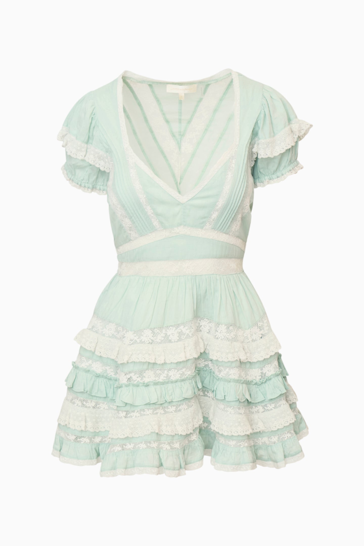 Introducing the Nivara Dress. Designed using a cotton voile fabric, this Victorian-inspired mini stuns with a pretty printed lace effect and intricate details like vintage-inspired laces stripped throughout. The dress begins with short puff sleeves, an open square neckline, smocking at back for easy pull on, and a fitted bodice that releases into a slight, handkerchief skirt, ruffle-tiered skirt.