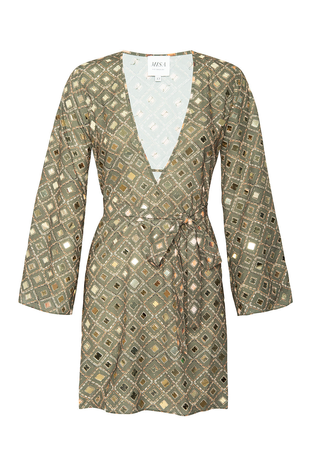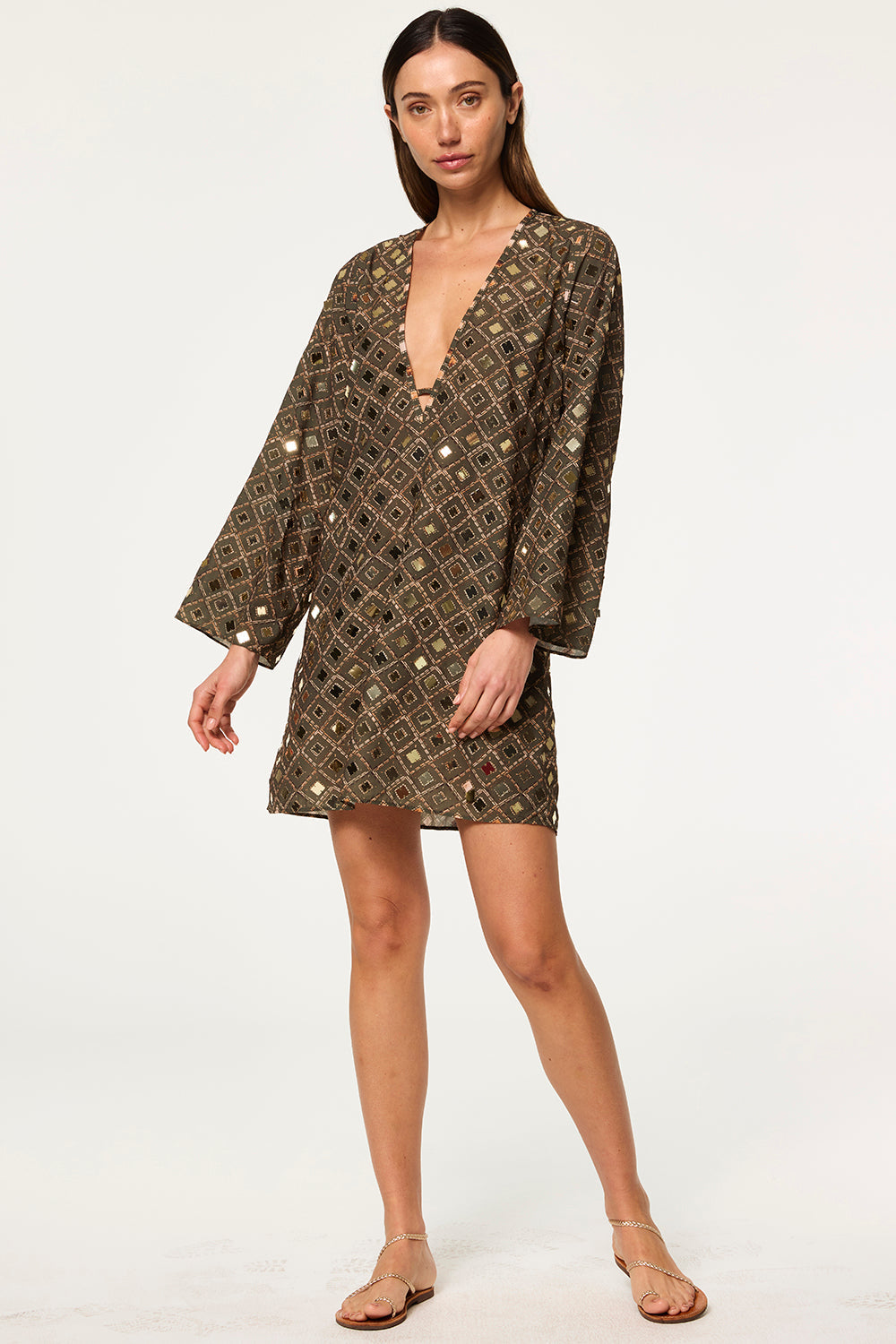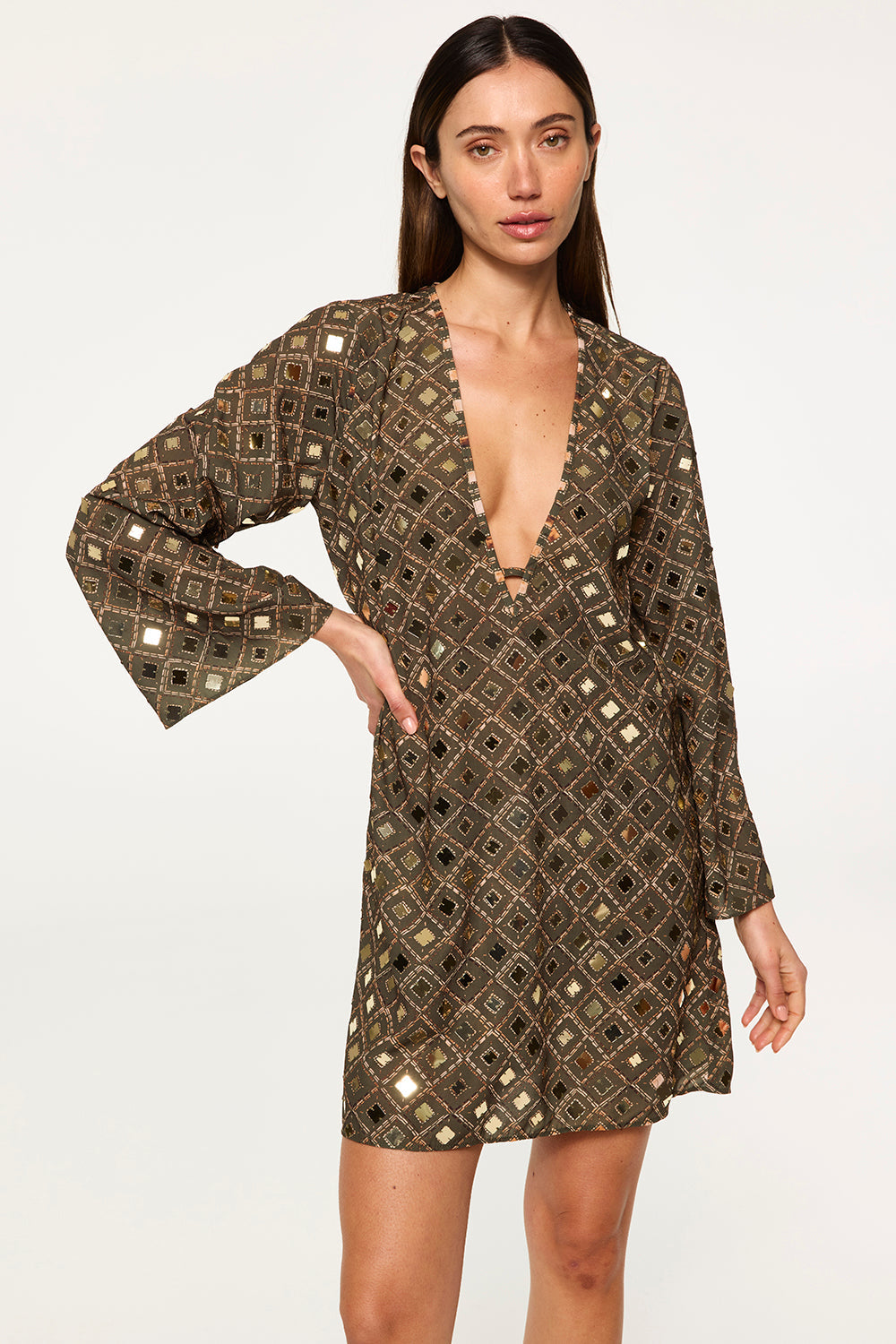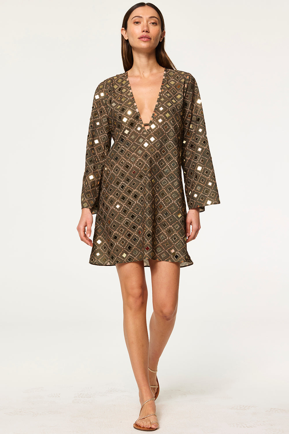 Nuala is a striking mini dress cut from the same olive fabric and fully adorned with sewn-on mirrored tile embellishments for a striking, light-catching effect. This effortless A-line silhouette features a deep V-neckline, long flared sleeves, and a slipover fit. Wear it loose or cinch the waist with the optional self-tie belt. A chic standout style to take you through summer and beyond.