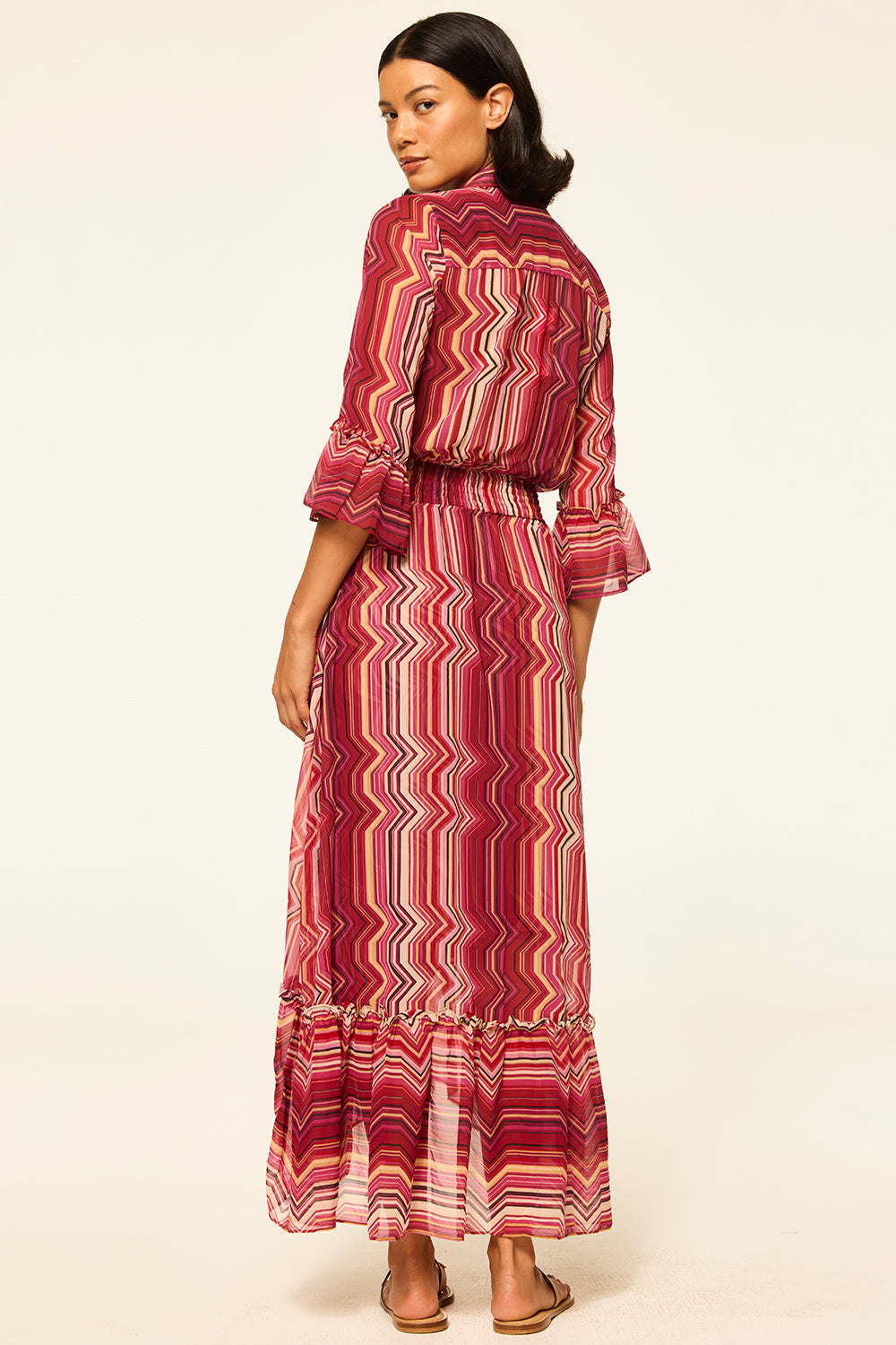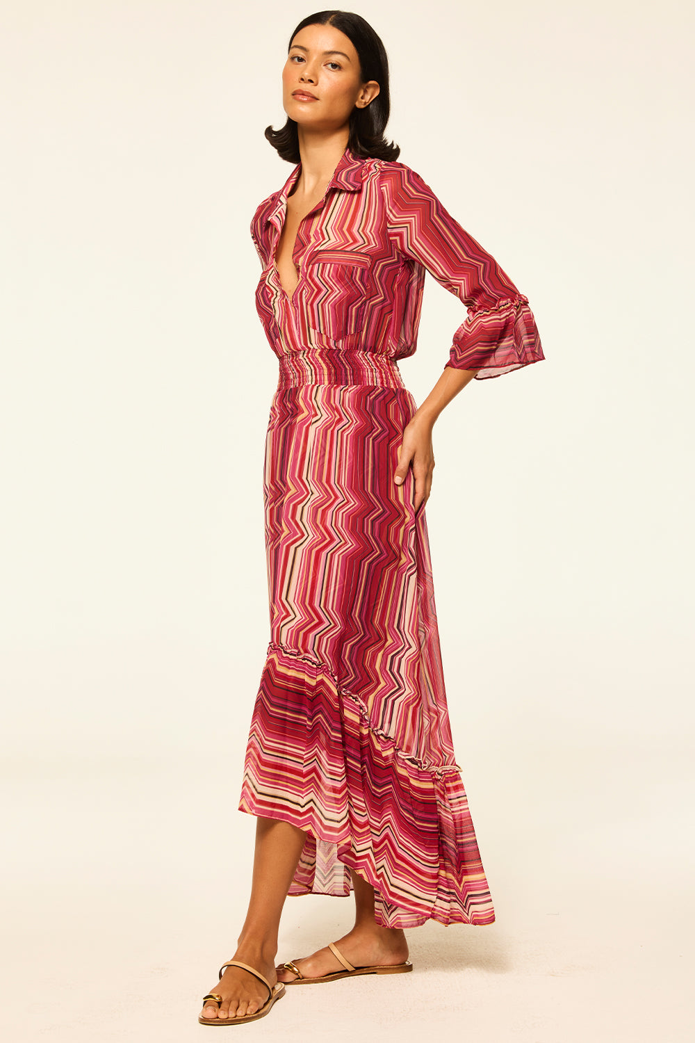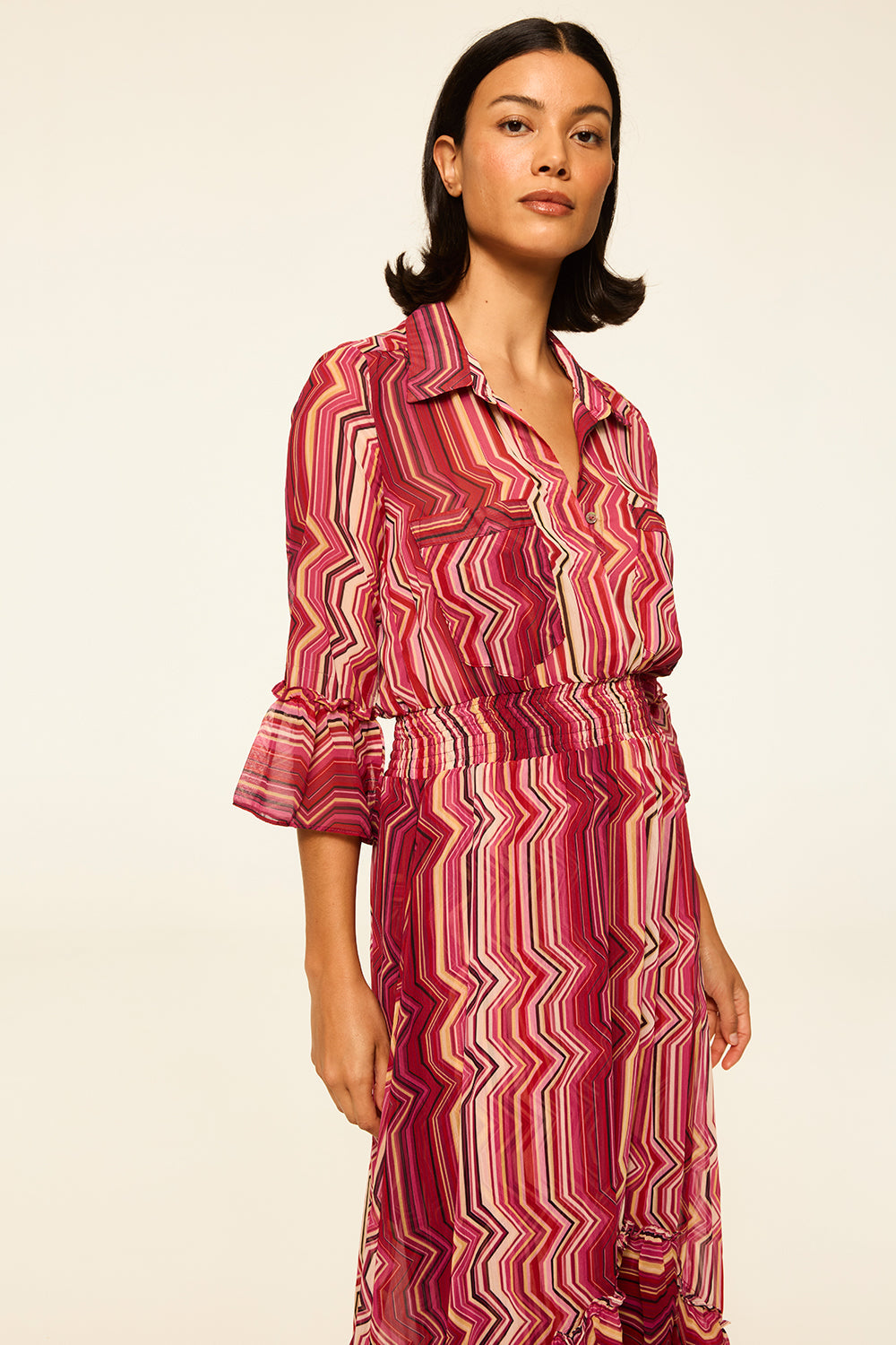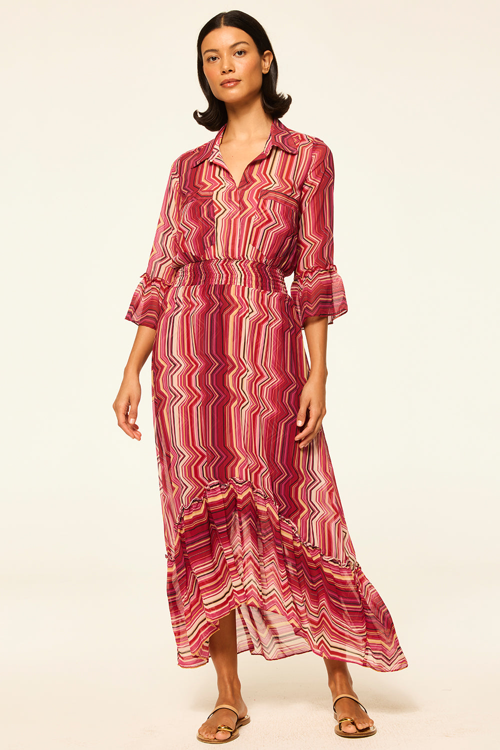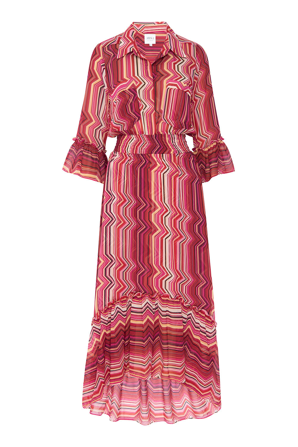 Our best-selling Ofelia shirt dress is back in a striking La Banda Crimson print chiffon. This versatile silhouette elegantly transforms from daytime to evening. Featuring an elastic waistband, double pockets at the chest, and loose ruffles on the three-quarter sleeves and a wide ruffle at the slightly high-low hem. Pair with boots in the cold months and transition to sandals for your next warm-weather getaway.
