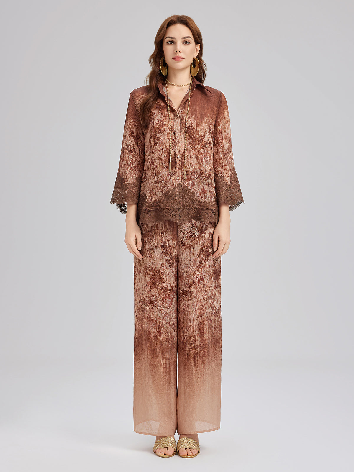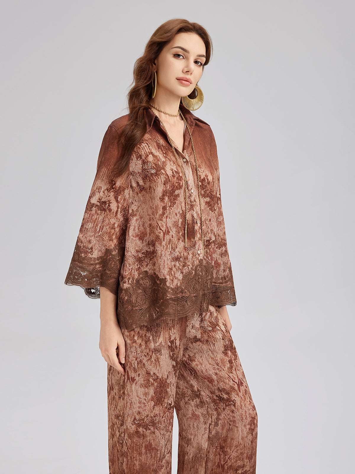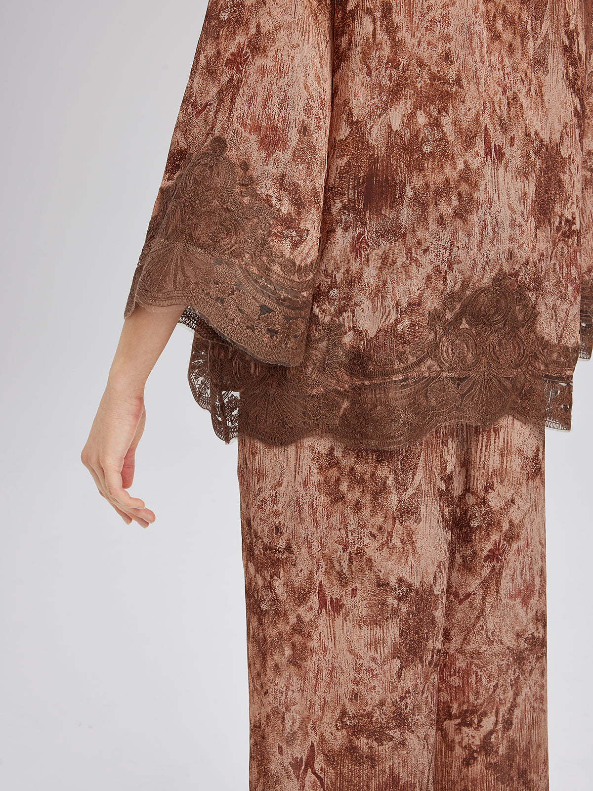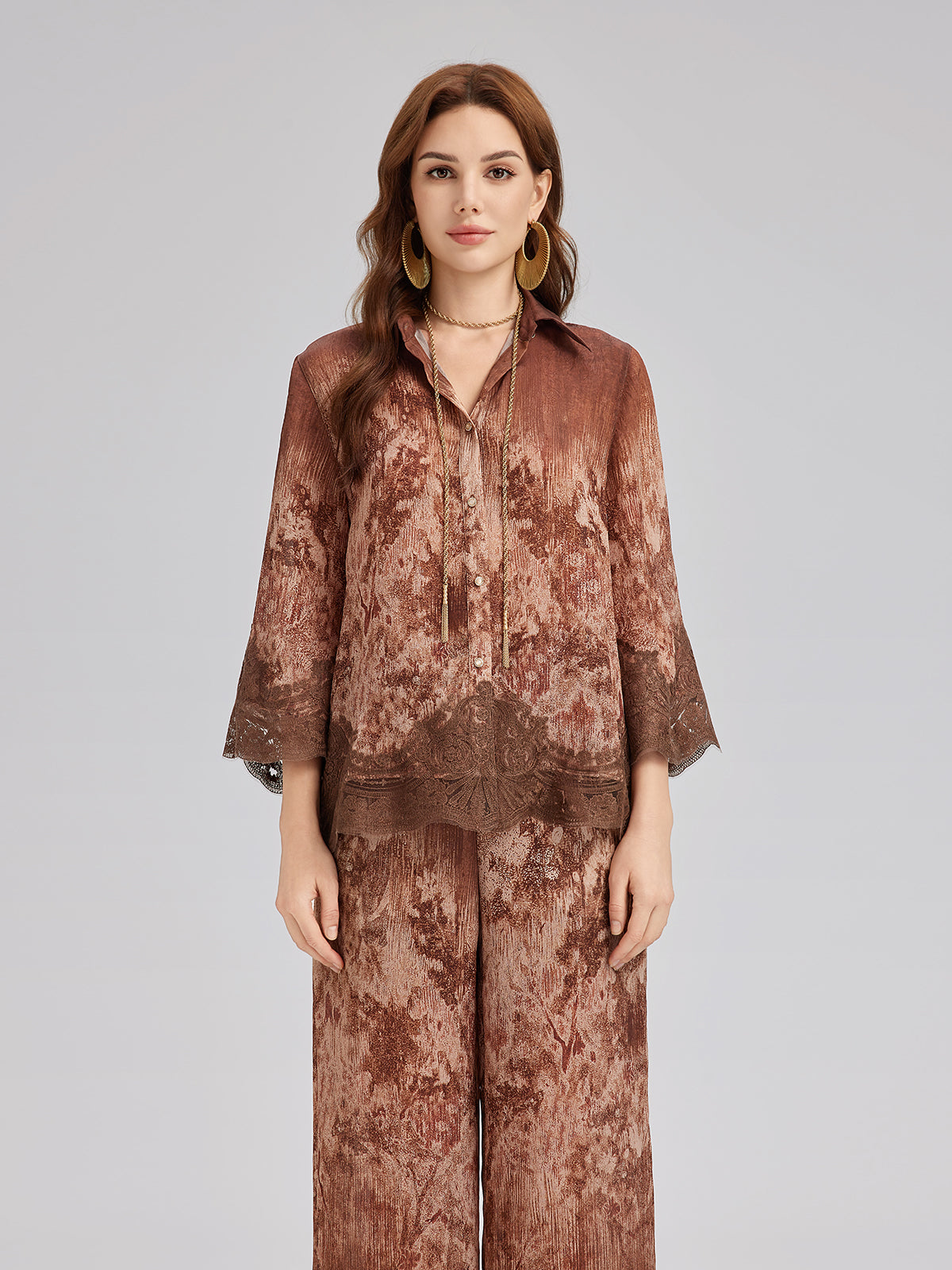 Ink-wash motifs inspired by Song Dynasty landscapes give each shirt a unique, fluid character. Sheer lace trims the edges with delicate patterns that flutter softly, lending lightness and a hint of romance. The fabric’s natural texture ensures breathability and quick-drying comfort, embodying effortless, relaxed elegance.