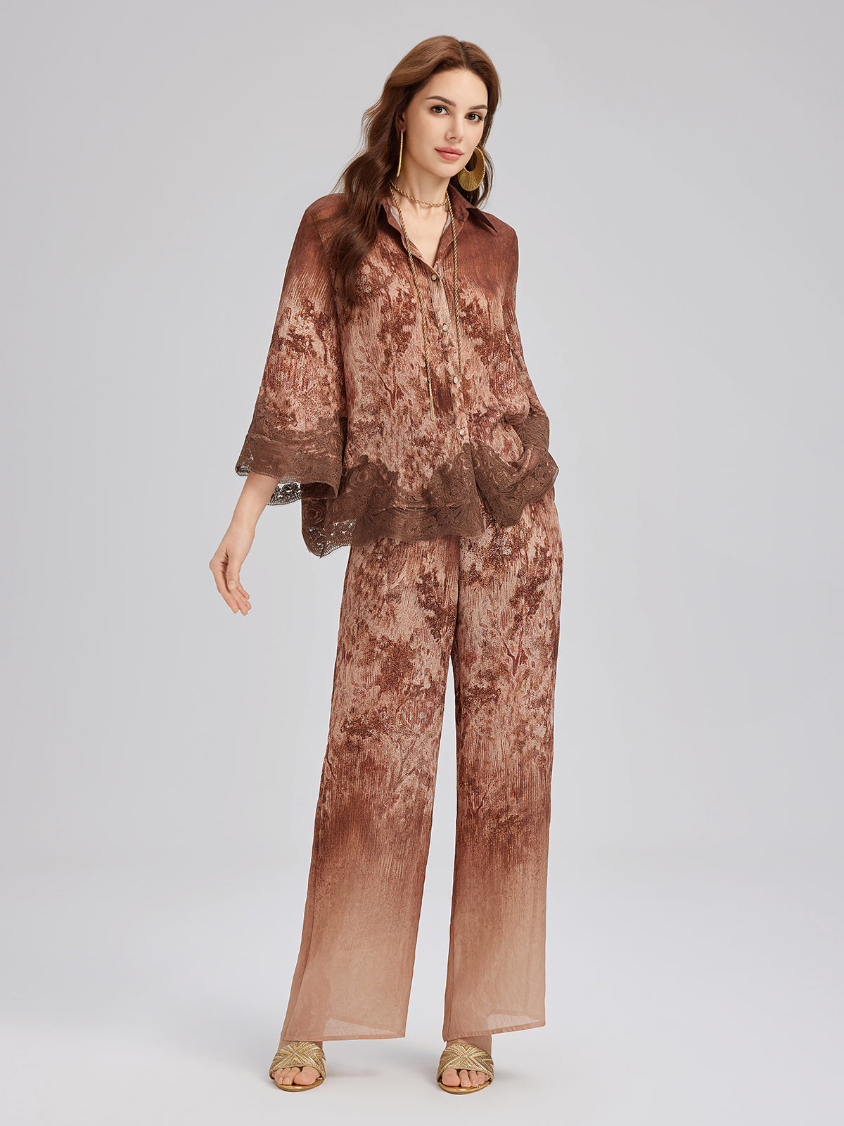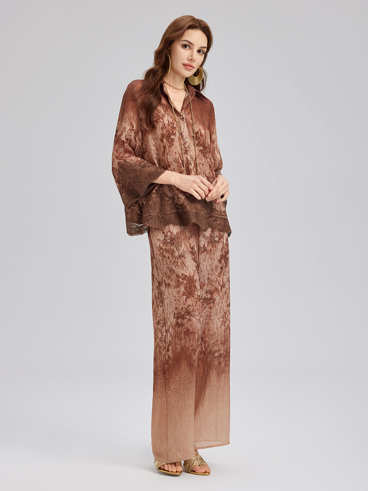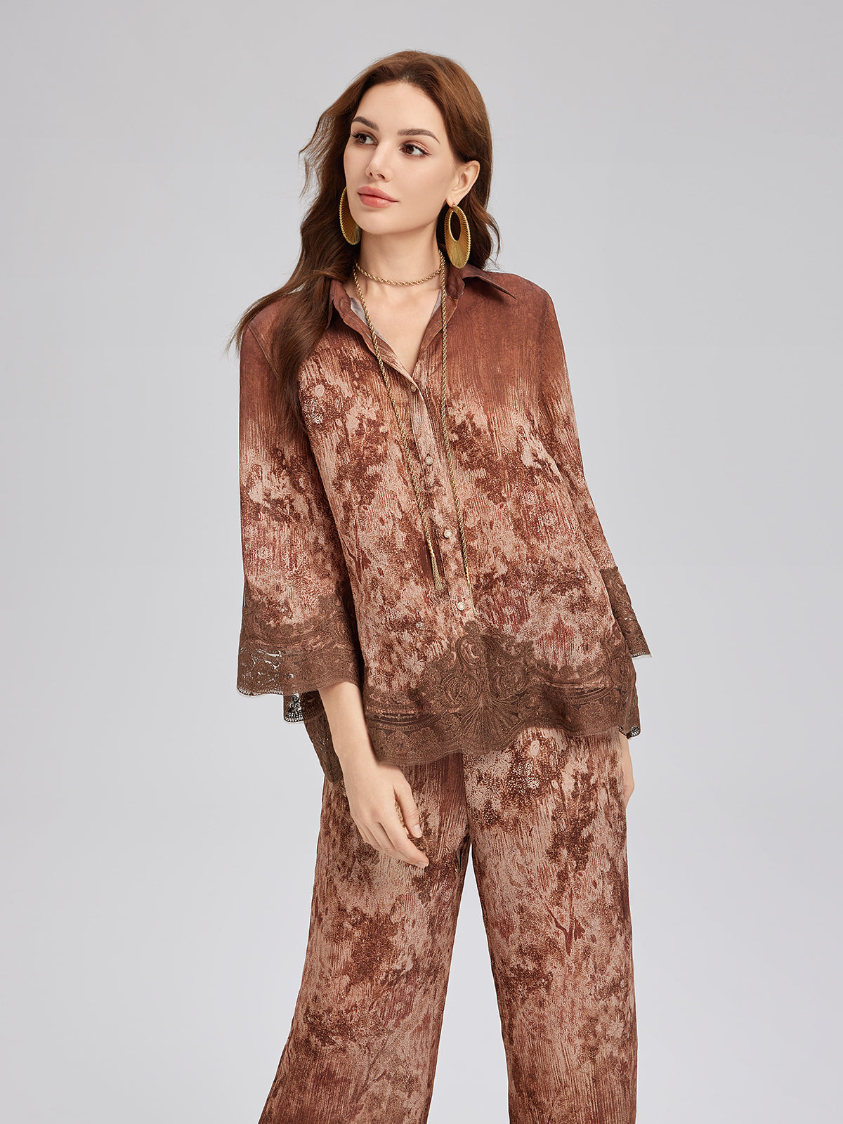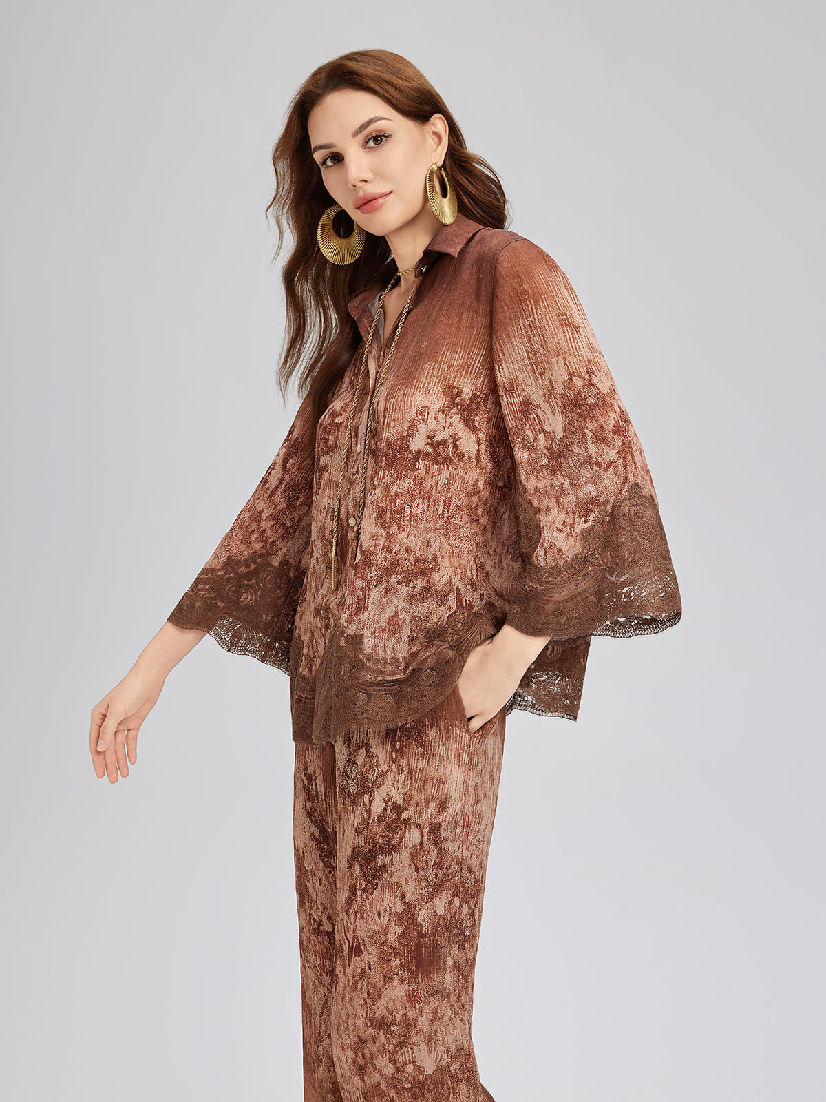 Ink-wash motifs inspired by Song Dynasty landscapes give each shirt a unique, fluid character. Sheer lace trims the edges with delicate patterns that flutter softly, lending lightness and a hint of romance. The fabric’s natural texture ensures breathability and quick-drying comfort, embodying effortless, relaxed elegance.