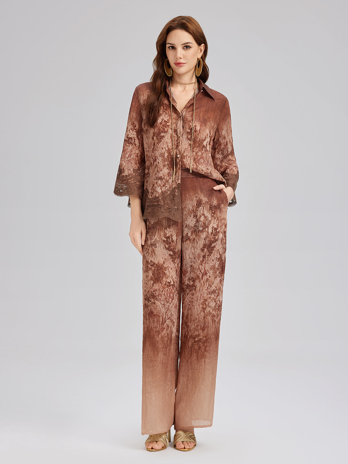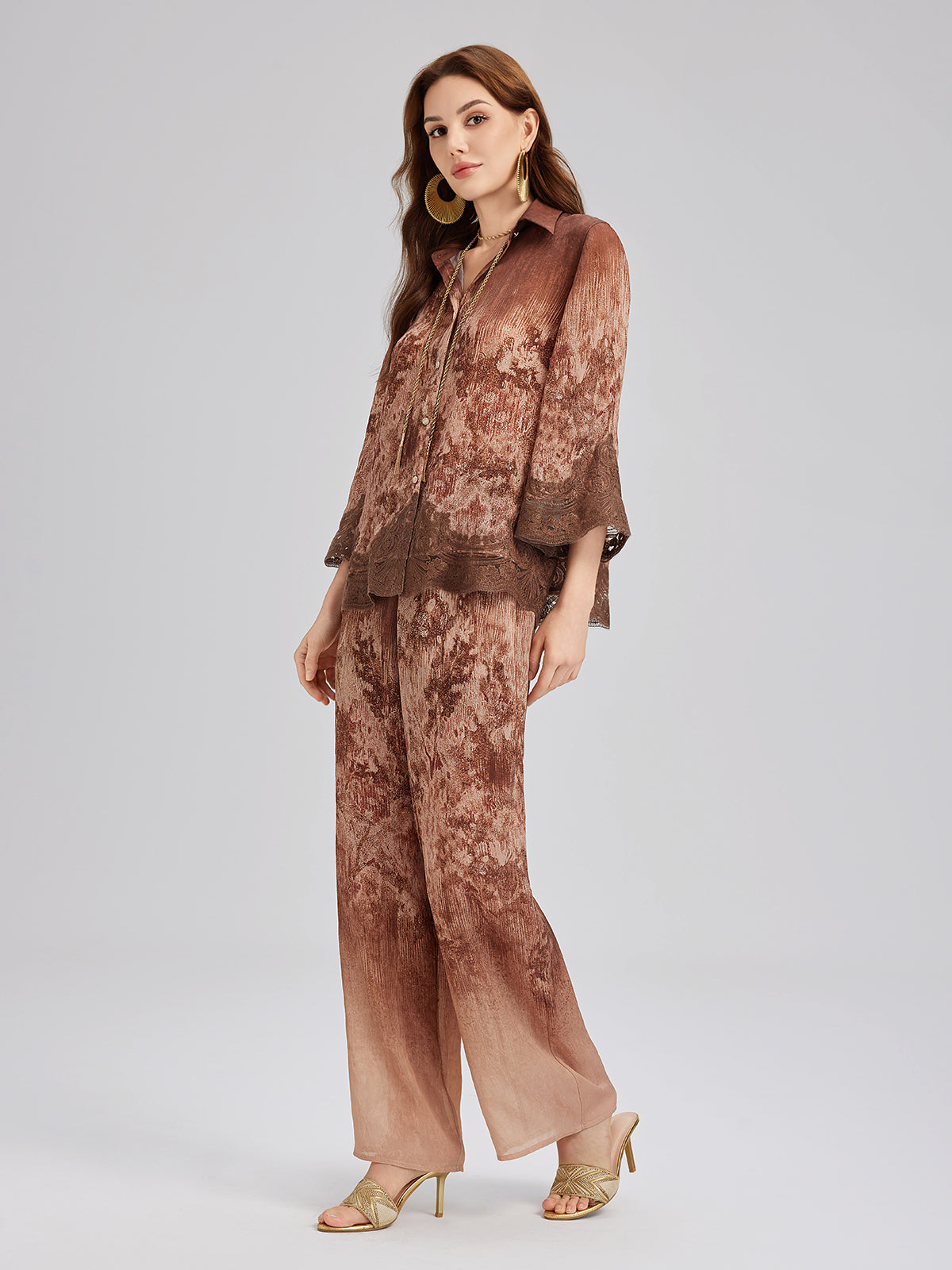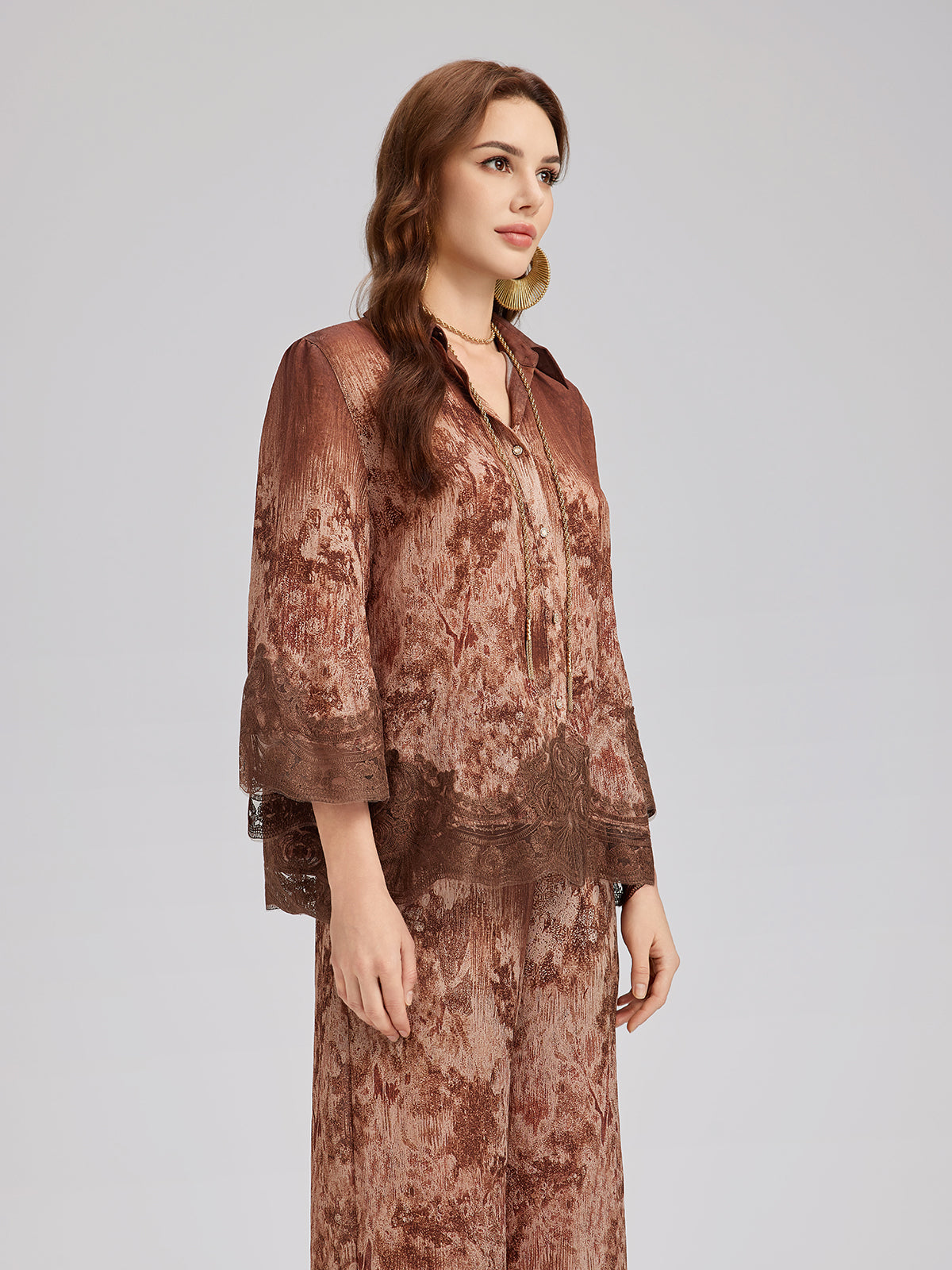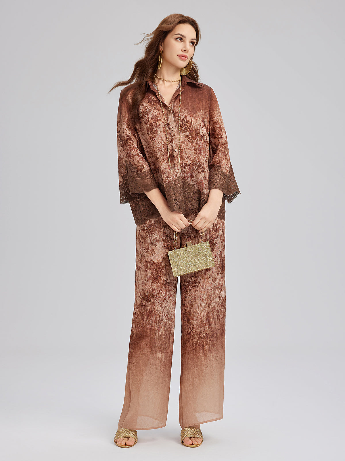 Ink-wash motifs inspired by Song Dynasty landscapes give each shirt a unique, fluid character. Sheer lace trims the edges with delicate patterns that flutter softly, lending lightness and a hint of romance. The fabric’s natural texture ensures breathability and quick-drying comfort, embodying effortless, relaxed elegance.