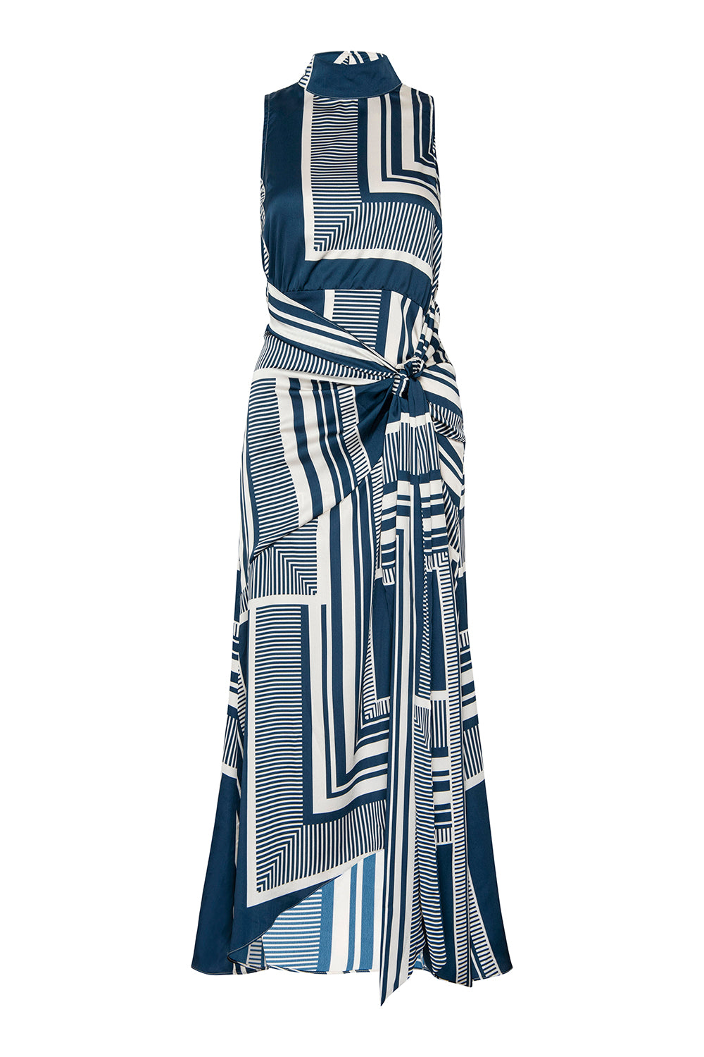 Our new Ophira dress is a standout transitional style cut from a modern linear geo printed satin. Sleeveless with a fitted bodice and high mock neckline that has a keyhole button-back closure at the neck and a hidden back zip. Midi length with a wrap-front that ties off-center. Slightly asymmetrical hem with side front slit. Pair with a neutral strappy heel for your next event or dress down with a pair of flats.
