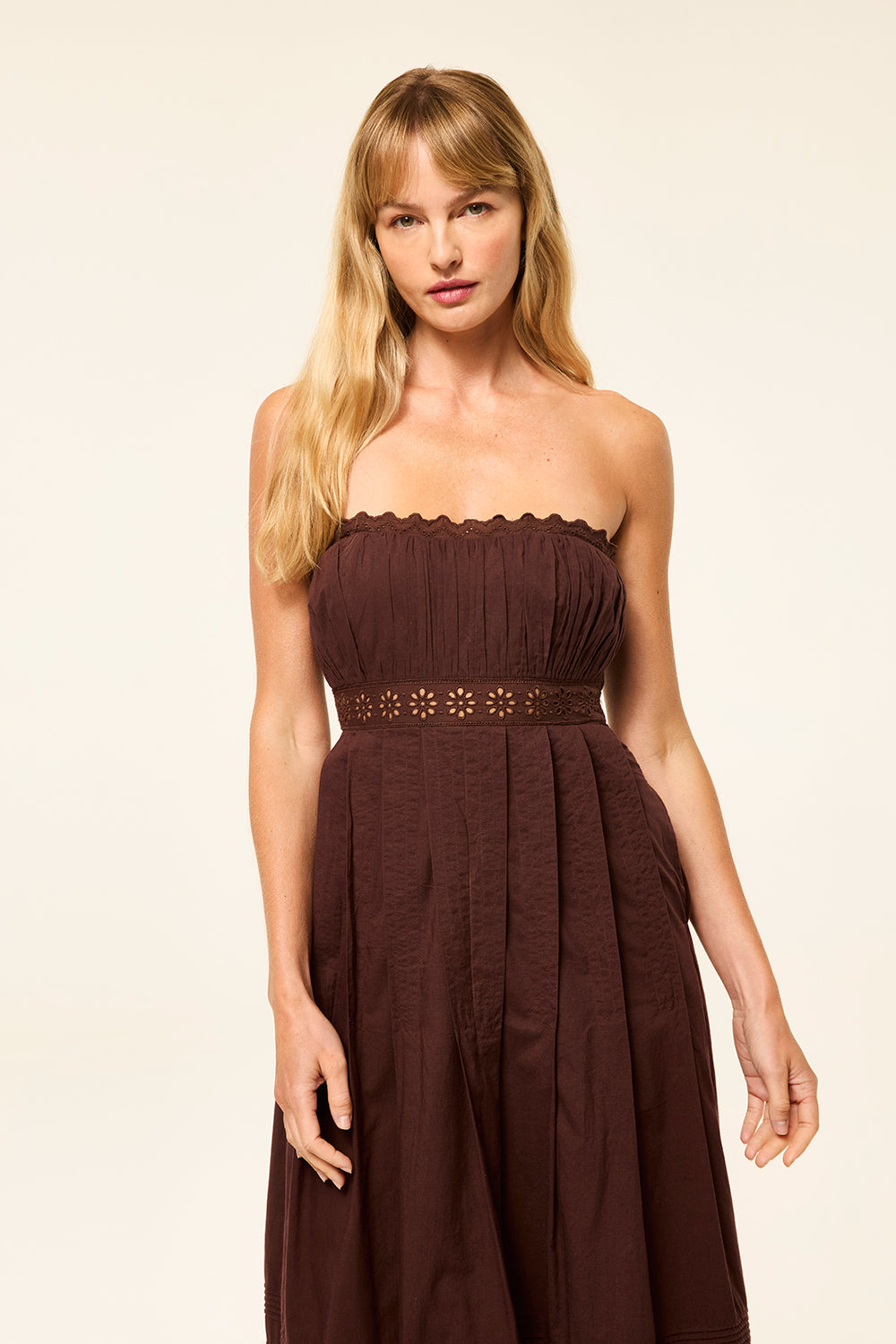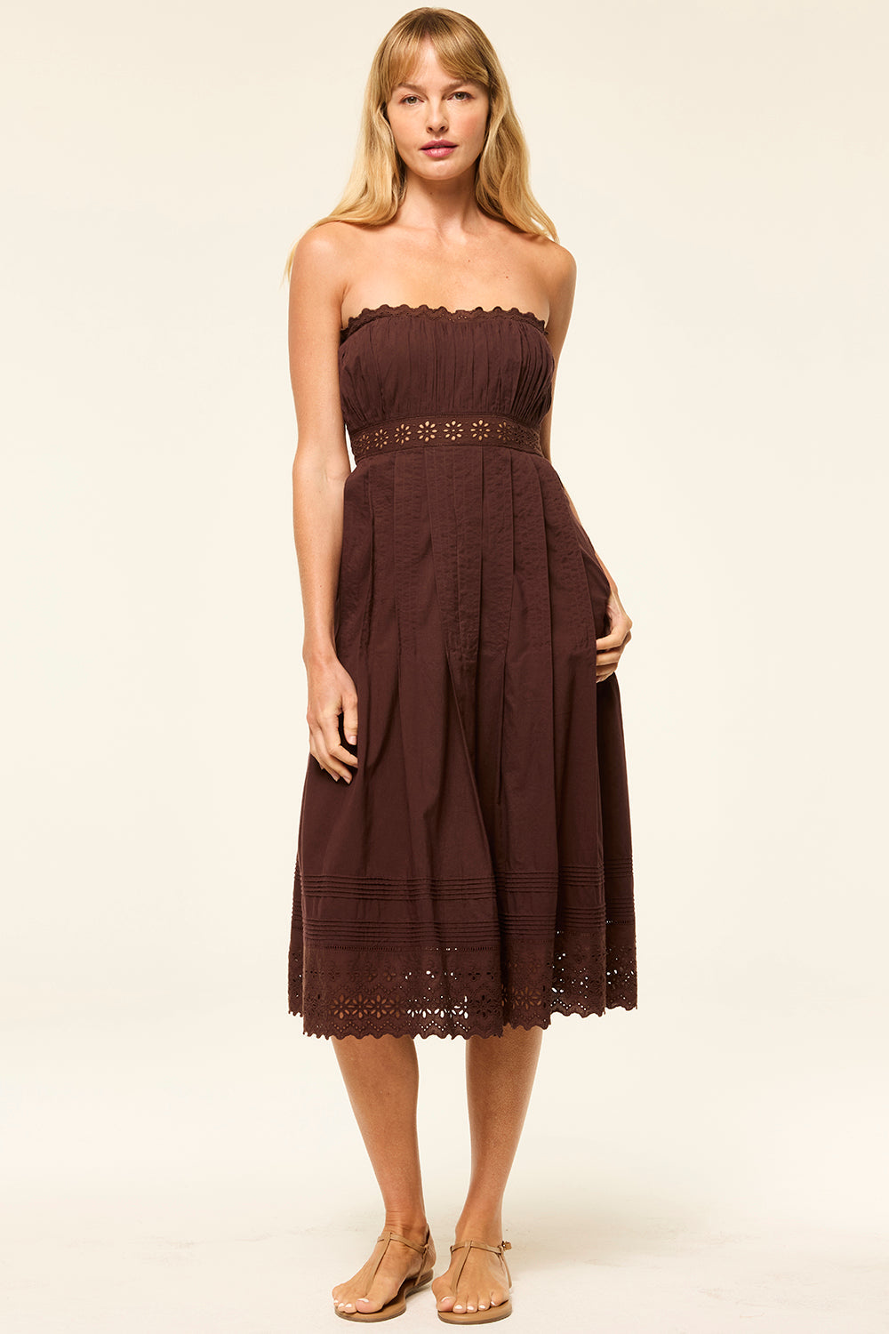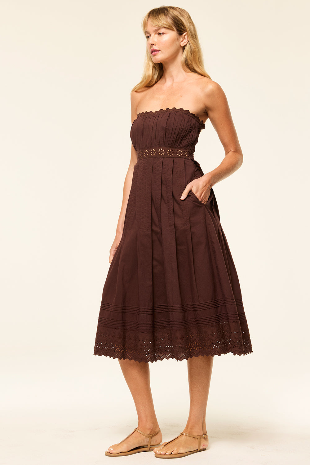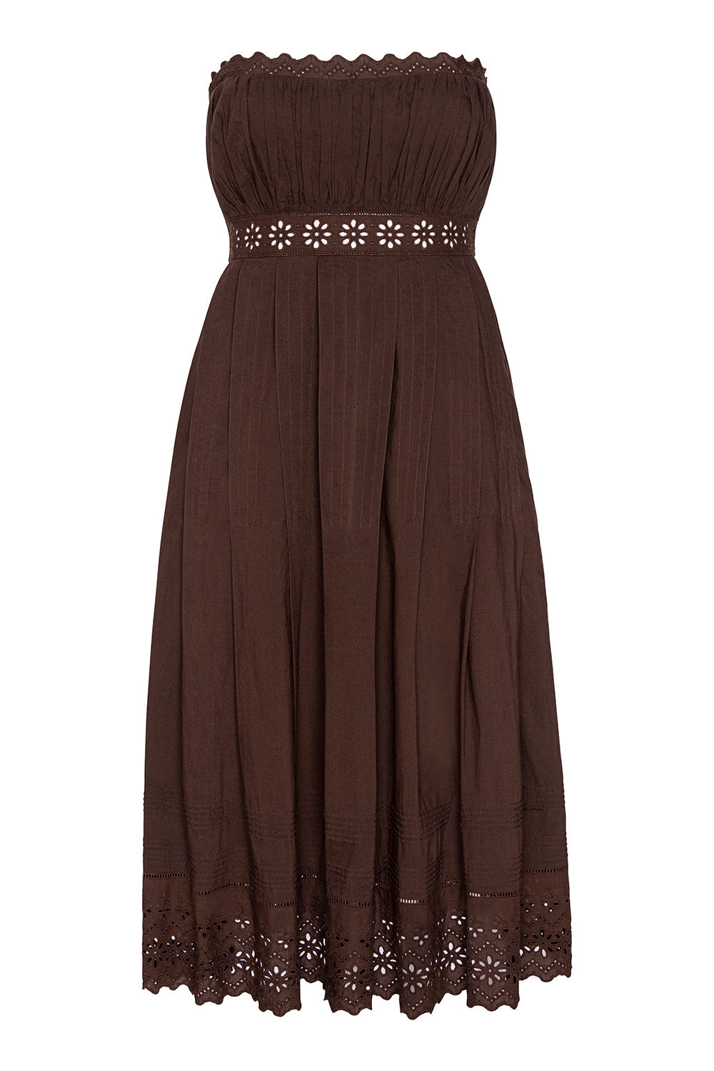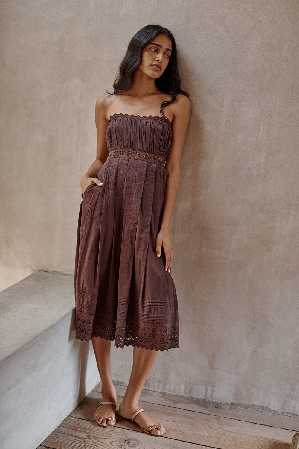 The Persis dress is a timeless strapless midi cut from soft brown cotton. A delicate scalloped eyelet trims the bustline, leading to a pleated bodice with floral eyelet embroidery and soft gathers through the waist. The A-line skirt falls into loose pleats, finished with pintuck accents and additional eyelet detailing at the hem. Complete with a hidden side zip and side slit pockets, it’s effortless with flat sandals by day or elevated with strappy heels for evening.