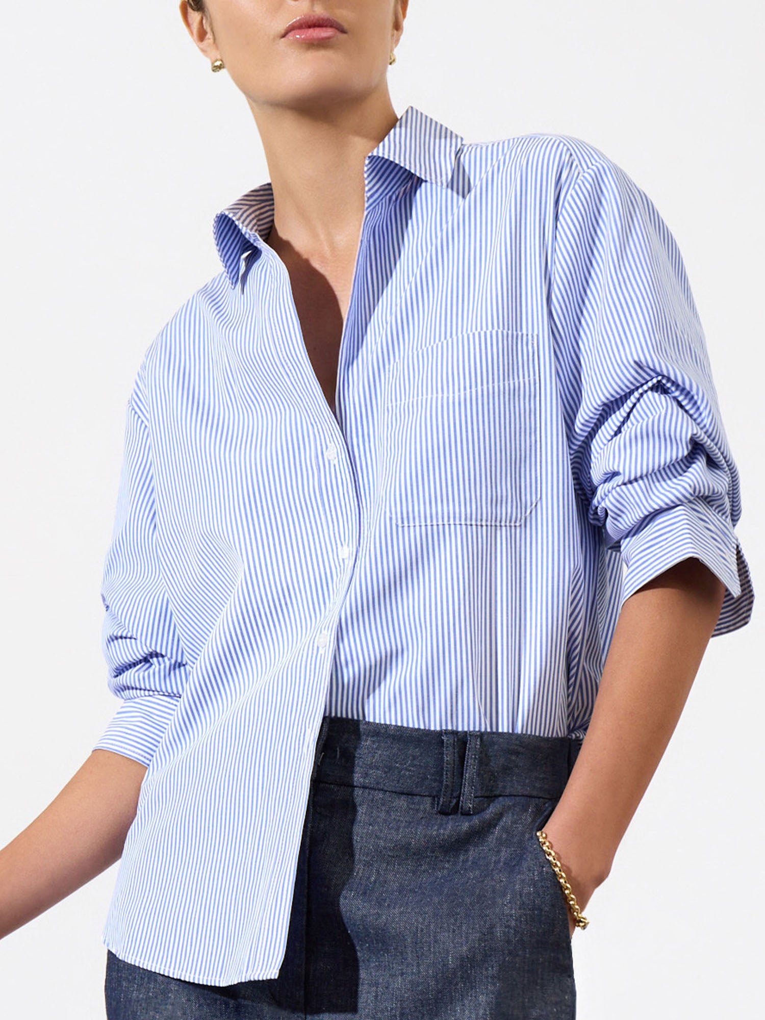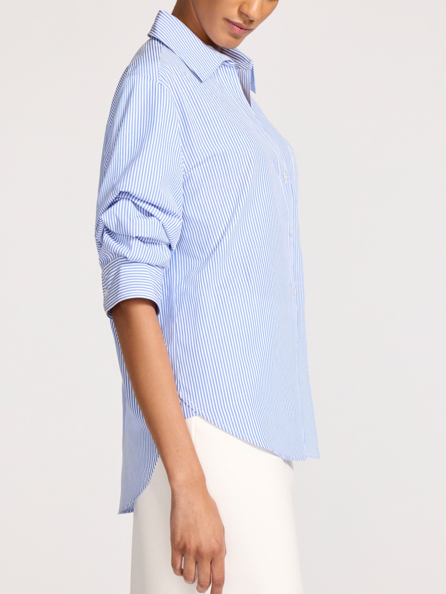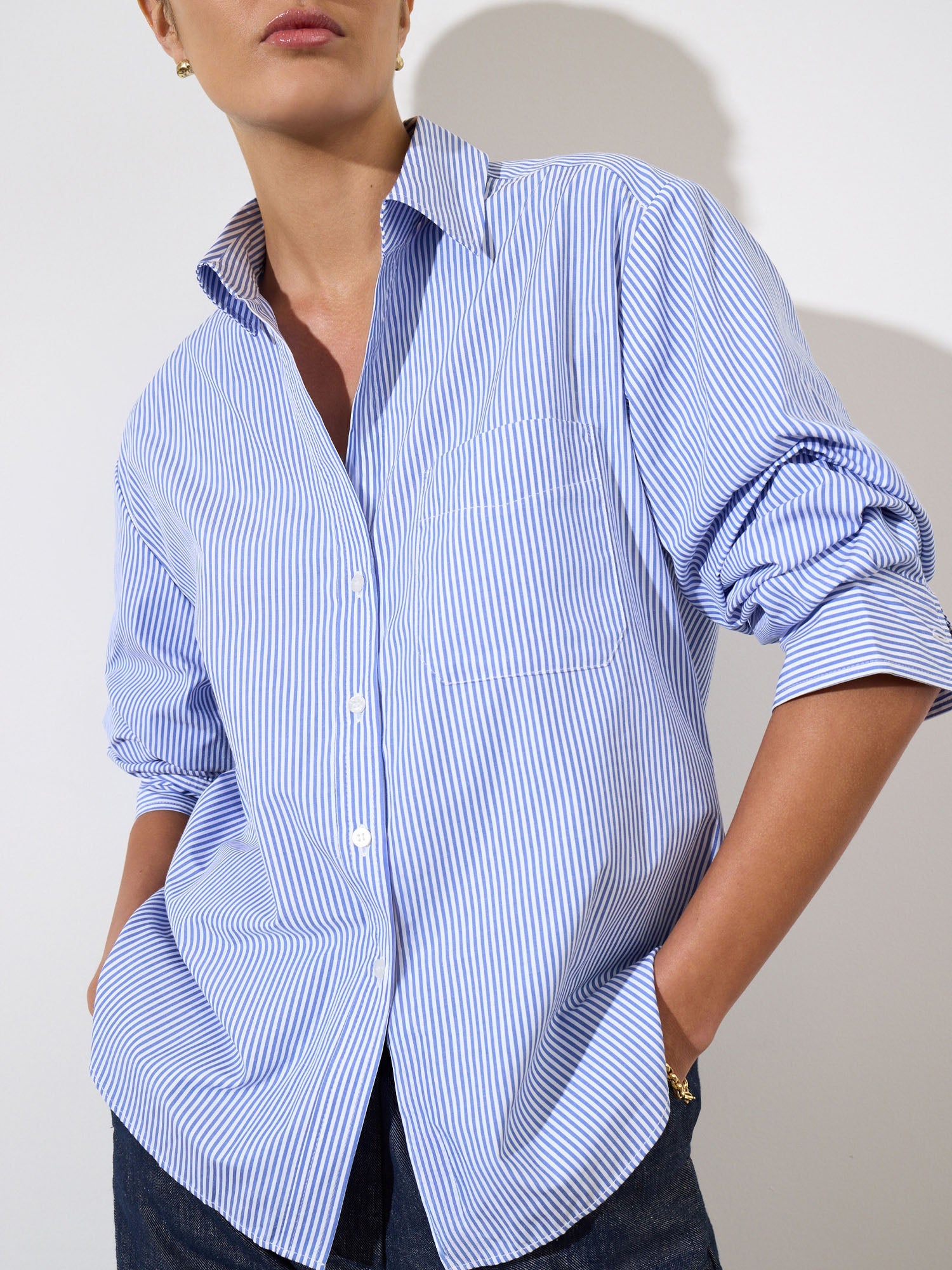 The newest addition to our essential Shirt Collection, our Pia Shirt has the same silhouette as our bestselling Everyday Shirt, now featuring a pre-styled scrunched sleeve giving it a more sensual sensibility than our most-loved cotton shirts. In a relaxed fit, that makes it effortless, this button front shirt features special details like subtle grosgrain trim on the placket and a locker loop on the back yoke.