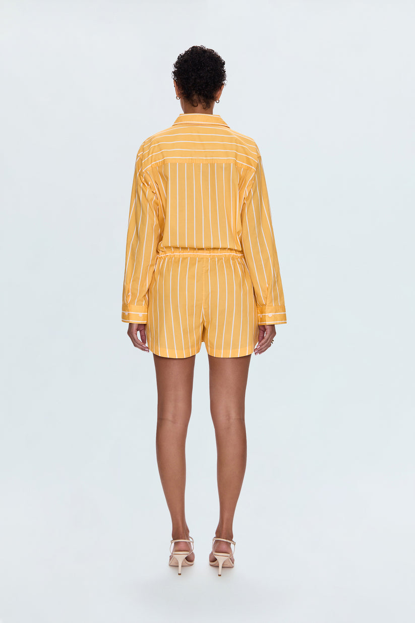 Expertly designed for versatility, the Pistola Amelie Romper combines sophistication with casual comfort. The collared, button-up bodice transitions seamlessly into relaxed shorts, while the adjustable drawstring waist ensures a customized fit. Crafted from lightweight cotton poplin, this breezy romper in Papaya Stripe delivers a vibrant yellow hue enhanced by crisp white pinstripes—perfect for effortless seasonal styling.