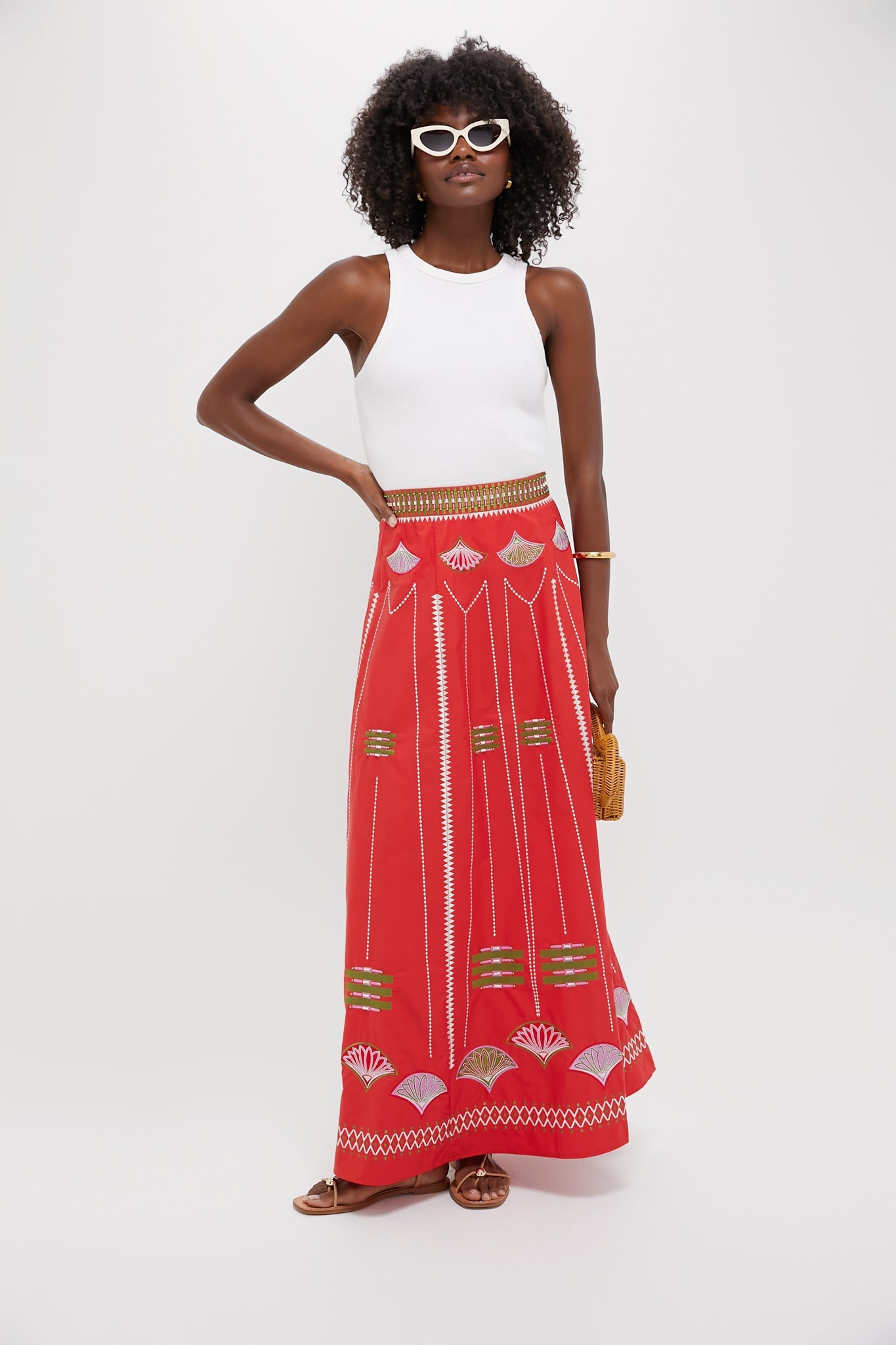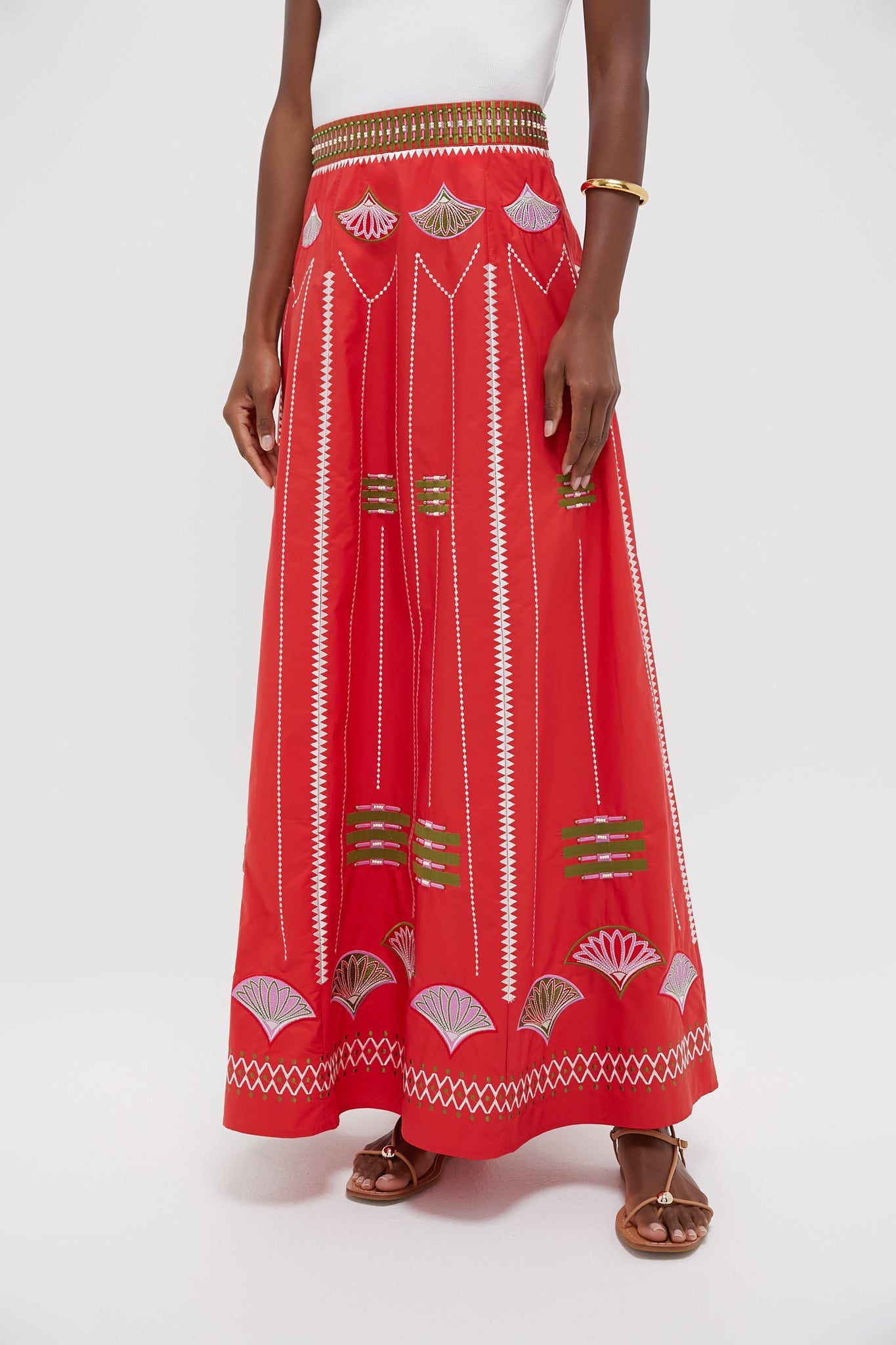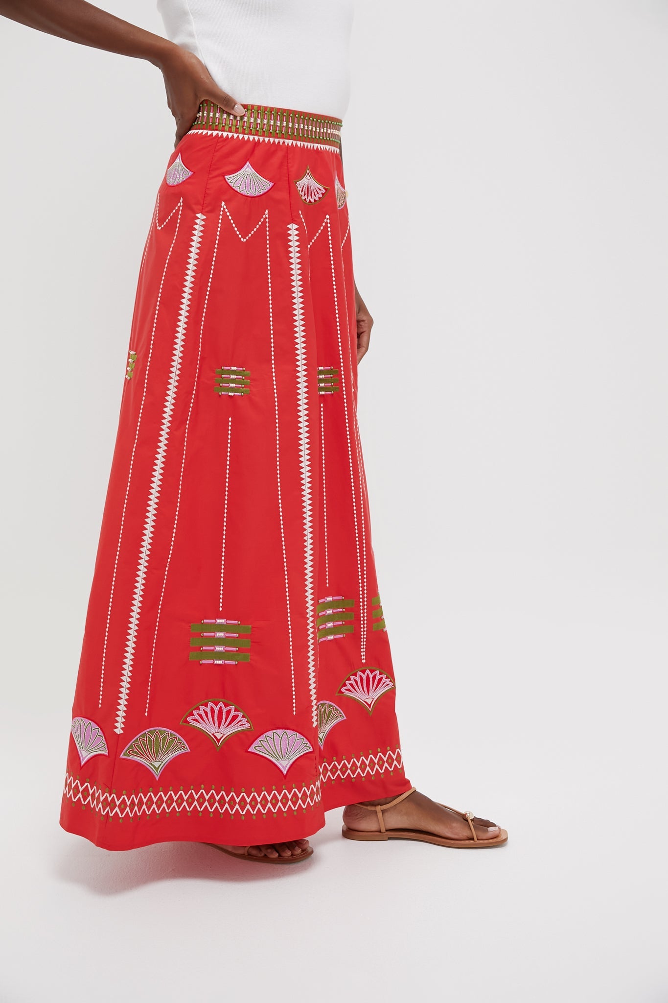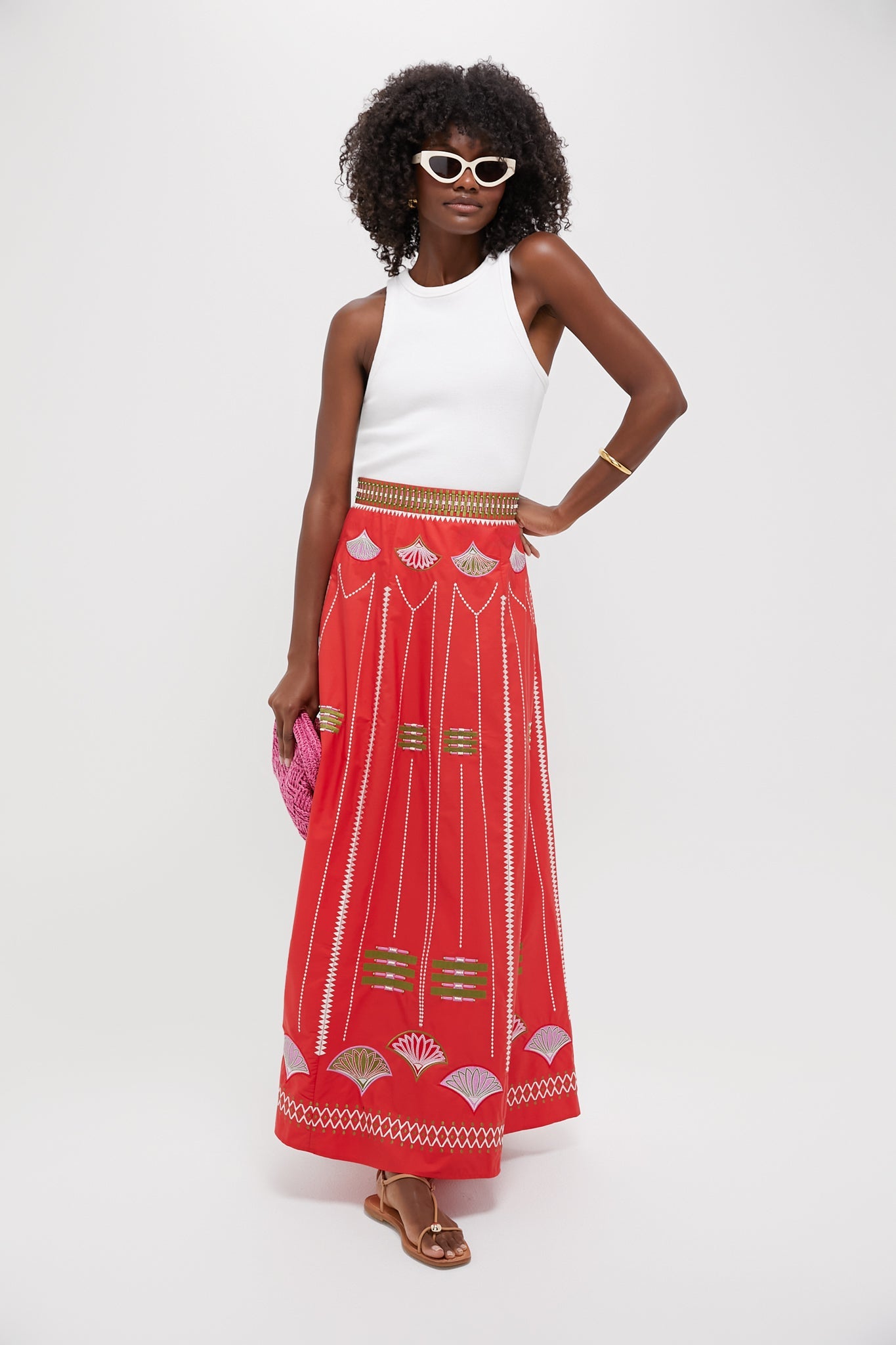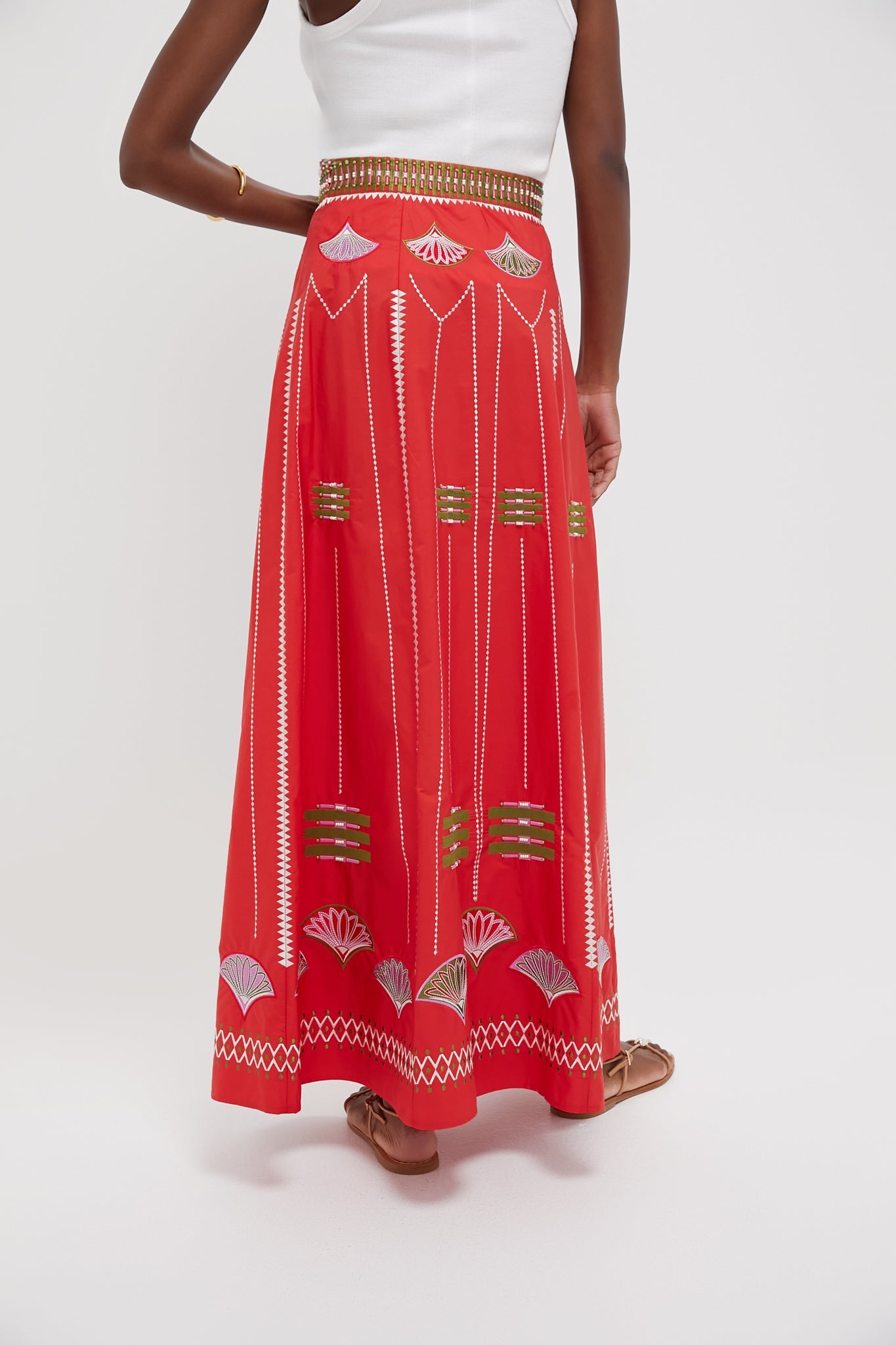 Adorned with intricate Japanese Peacock embroidery on a lipstick Red backdrop, the Camille Skirt captures the vibrance of a bustling, lantern-lit street. Perfect for warm weather dressing we styled it with a white tank, sandals, and gold jewelry!