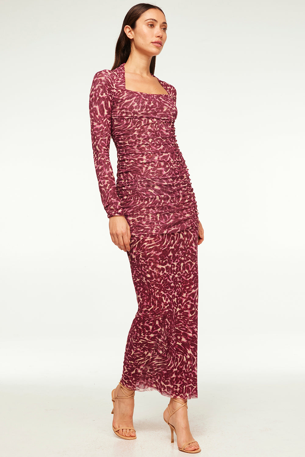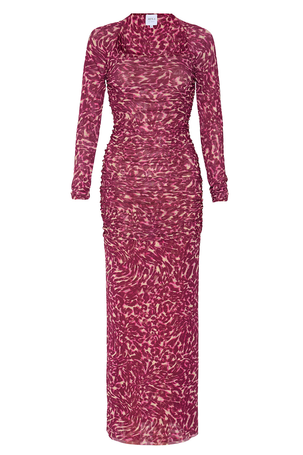 The Ronda dress in leopard fuchsia mesh is the perfect on-trend piece for your fall/holiday wardrobe. Double lined. This maxi silhouette features long fitted sleeves, a square neckline and ruching to hug and accentuate your curves.