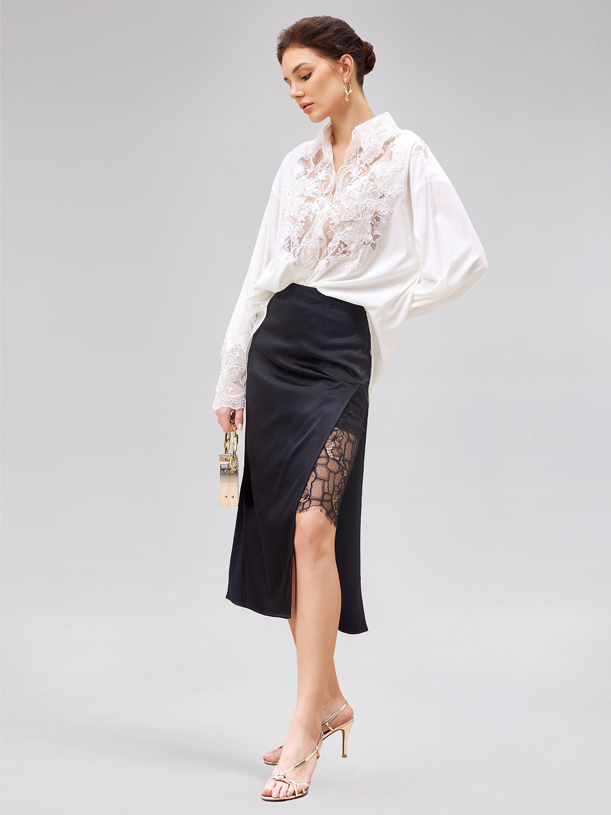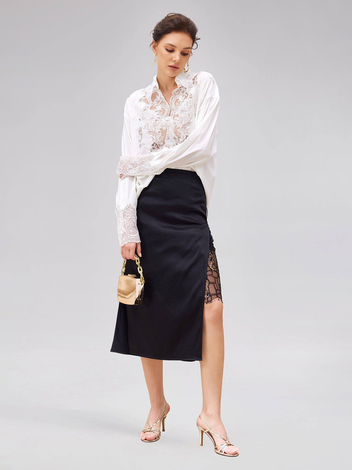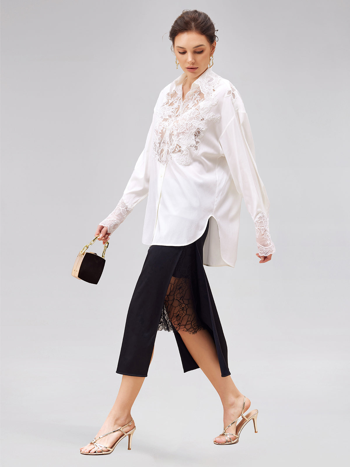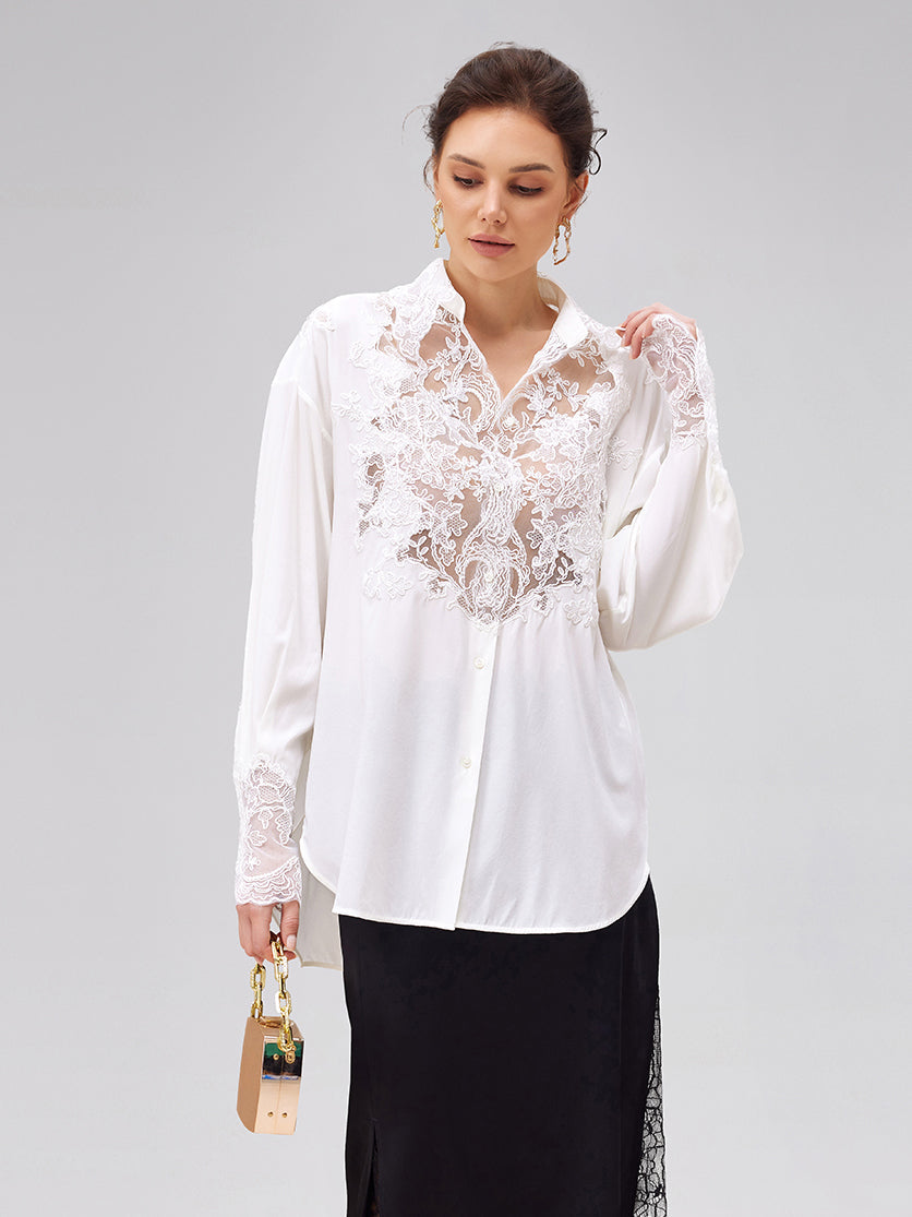 Romantic and elegant silk blouse with delicate lace embroidery. Exquisite embroidered, elegant lace, and airy hollow-out design for a feminine and breathable style. Perfect for spring and summer.