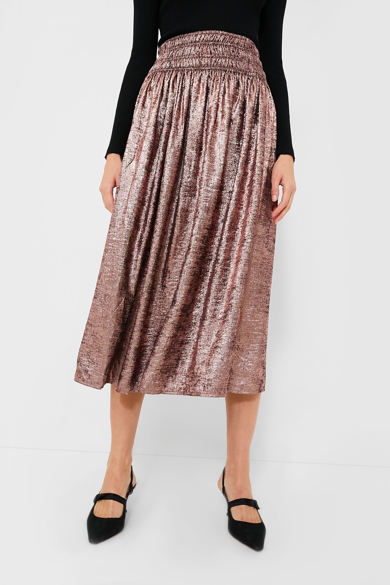 Go beyond basic with the Viola Skirt in Rose Gold. This eye-catching piece features a beautiful flowy drape and a comfortable smocked elastic waistband for a stylish snug fit. Perfect for special occasions or a touch of glamor in your everyday look, wear it with tucked-in blouse and heels for a sophisticated and chic ensemble, ensuring you shine with confidence.