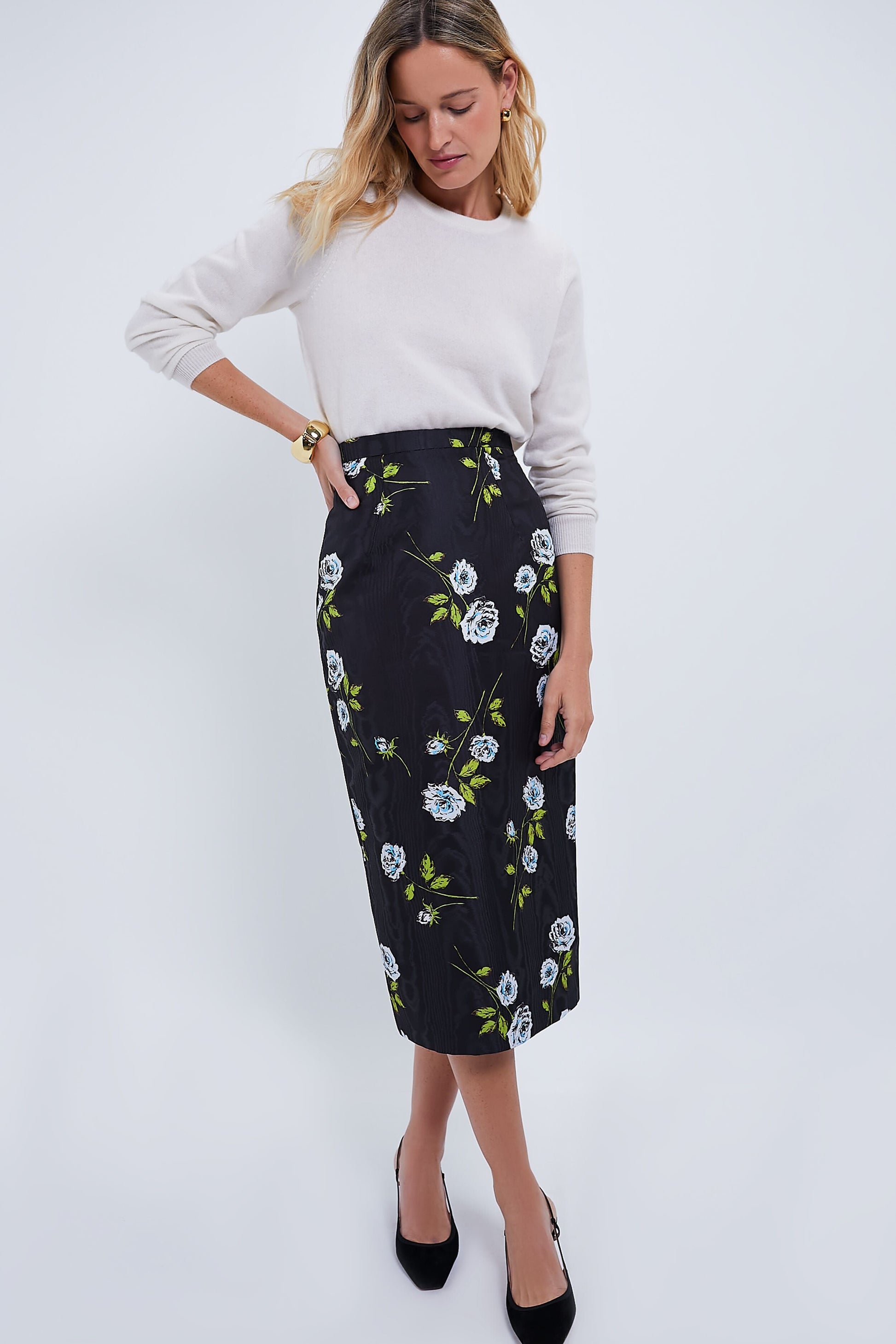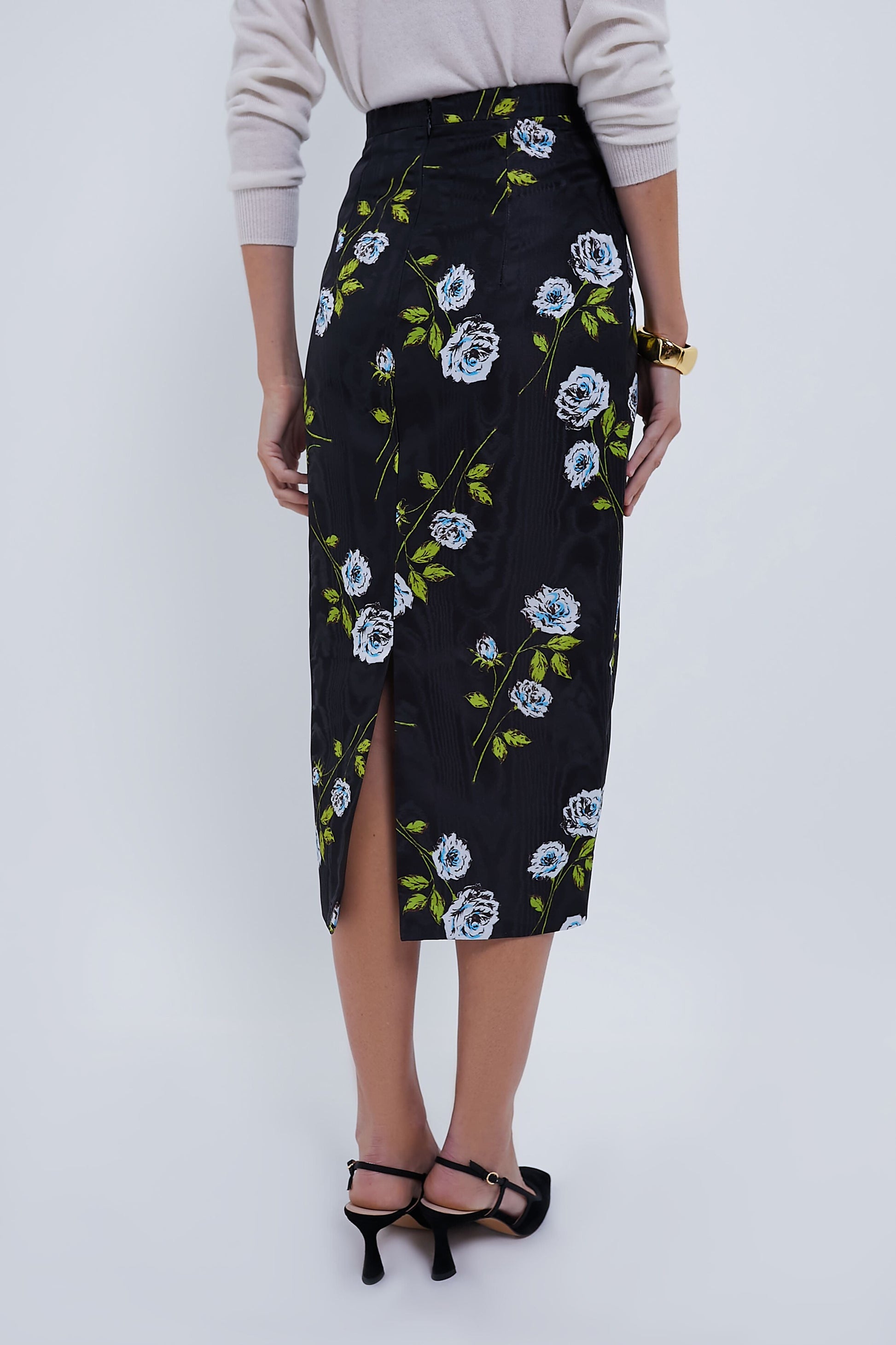 The Lorelei pencil skirt follows the Emilia Wickstead feminine tailoring, featuring a black moire base adorned with a delicate white rose stem flower motif print. With its high-waisted design, wide waistband, and back vent, this skirt exudes sophistication and grace, offering both style and comfort for any occasion. Pair with a white button down or body suit and heels for any and all formal occasions.