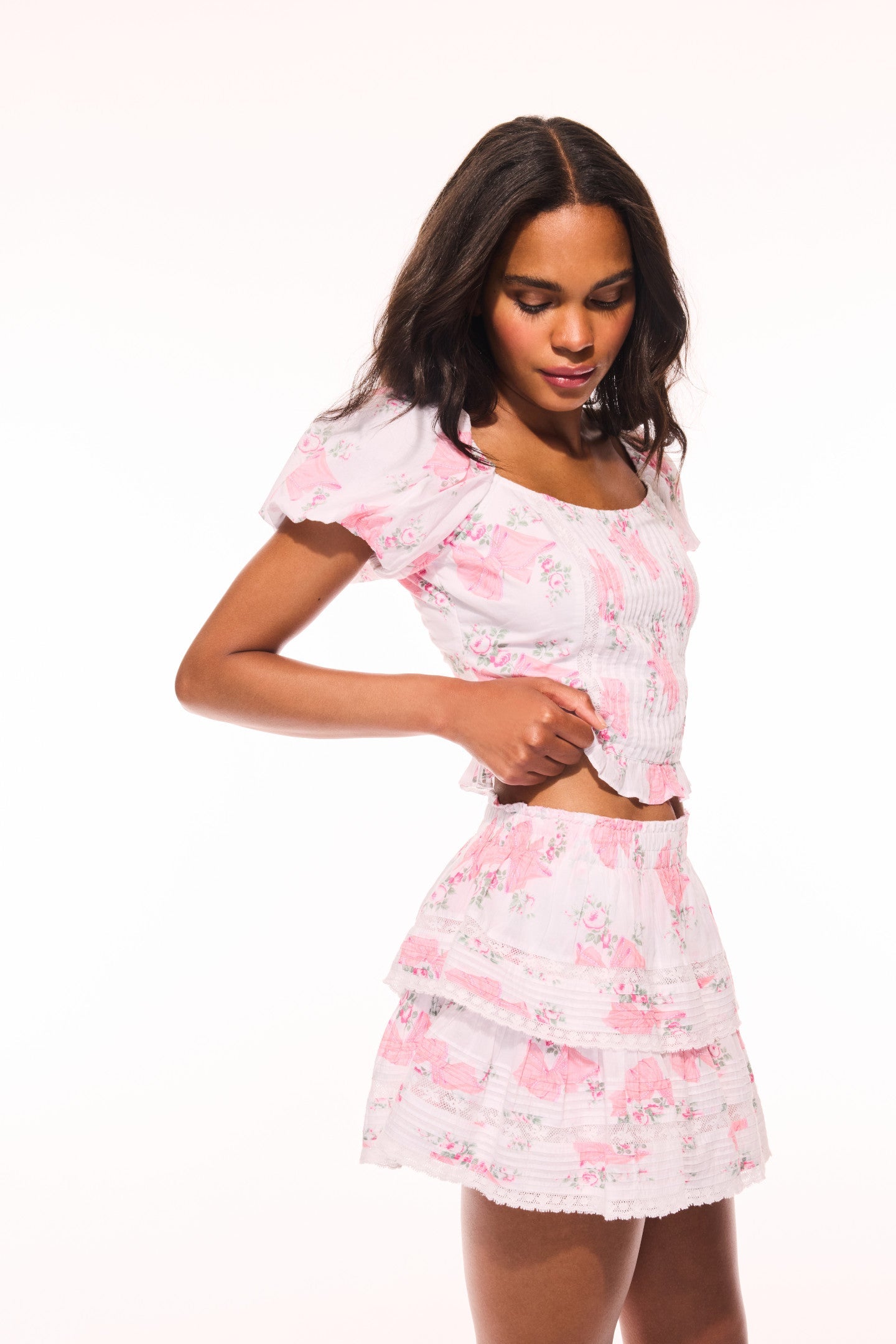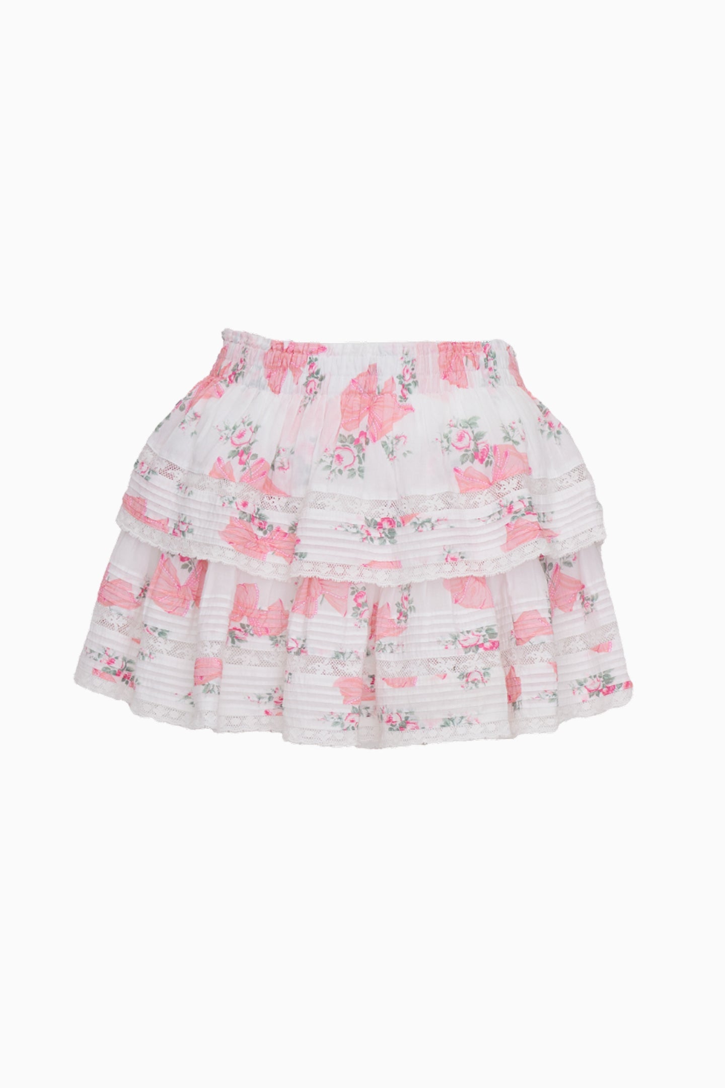 Our best-selling Ruffle Mini Skirt returns as part of our Heirloom Print Capsule featuring our signature Rosa Beaux print made-to-match our Hair & Body Perfume Mists. She features intricate inset lace trims and allover pintuck details. The elasticated waistband offers flexibility in comfort and styling. Tiered ruffles exude effortless femininity. The mini is finished with a frayed, raw hem for added playfulness.