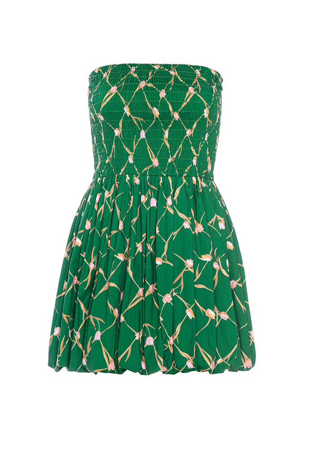 Our effortlessly chic Sadie Mini Dress is crafted from lightweight cotton in a vibrant Tulip Lattice print, featuring a stunning green hue. This pull-on style boasts a flattering, fully smocked strapless bodice paired with a playful bubble hem skirt. Perfect for the season, this versatile dress can easily be dressed up or down for any occasion.