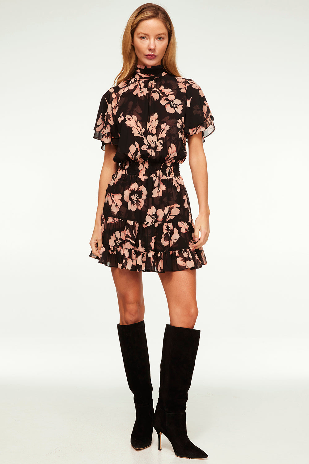 The perfect date night dress for this season and beyond, the Saffie is a mini silhouette handcrafted from a timeless Auric Flora printed chiffon on black ground. A sleek, high neck silhouette features a flirty open back detail with an adjustable tie closure and the elastic waistband leads into a ruffle-trimmed skirt.