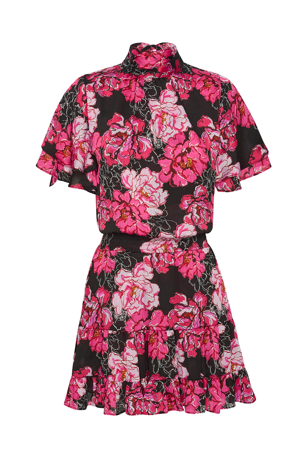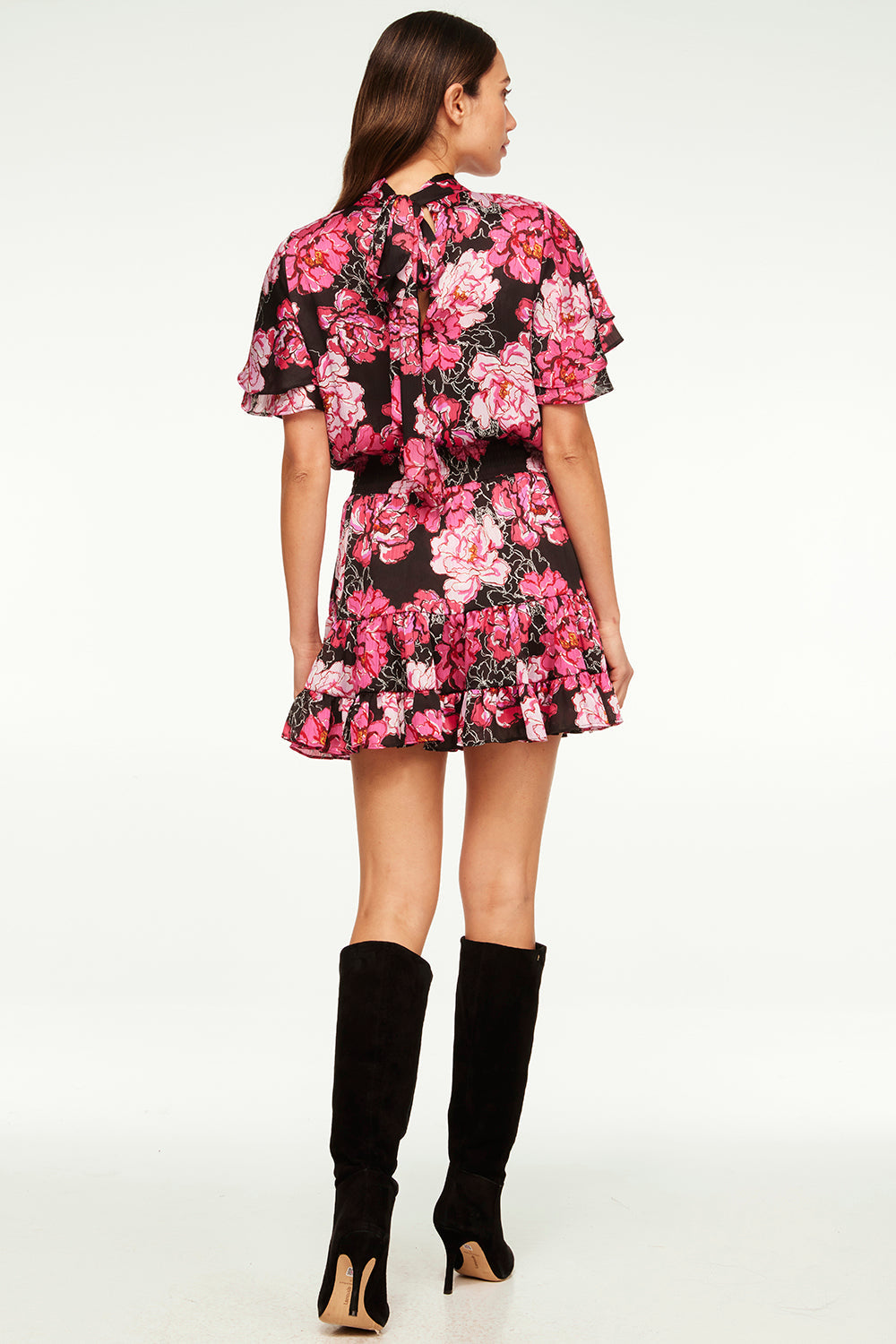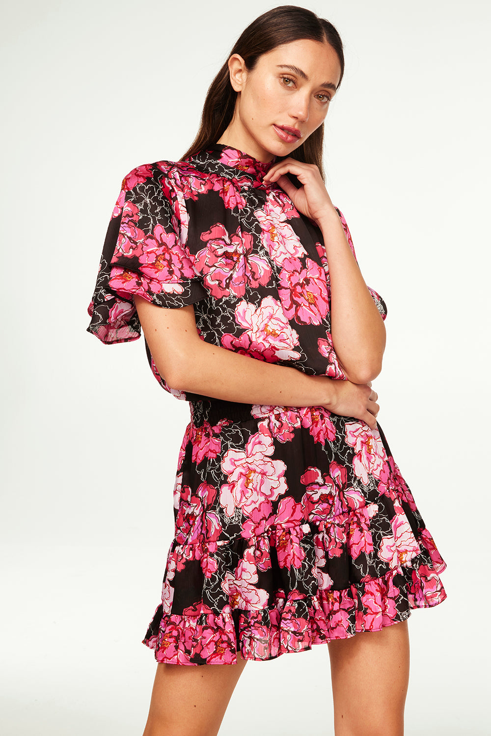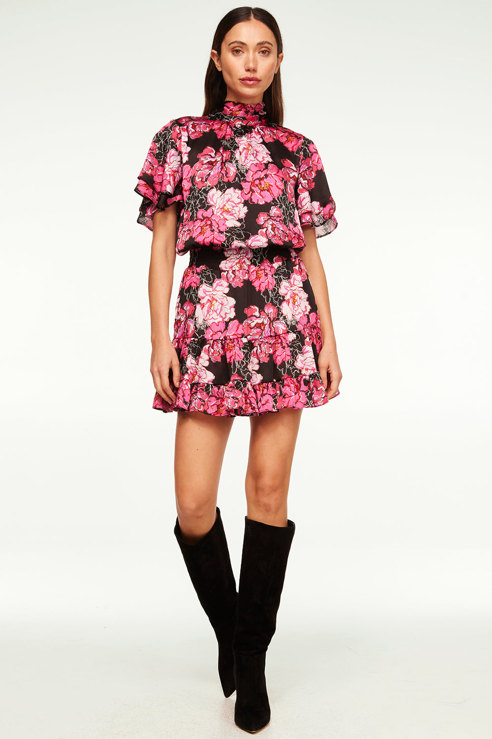 The perfect date night dress for this season and beyond, the Saffie is a mini silhouette handcrafted from Pink Peony printed satin. A sleek, high neck silhouette features a flirty open back detail with an adjustable tie closure and the elastic waistband leads into a ruffle-trimmed skirt.