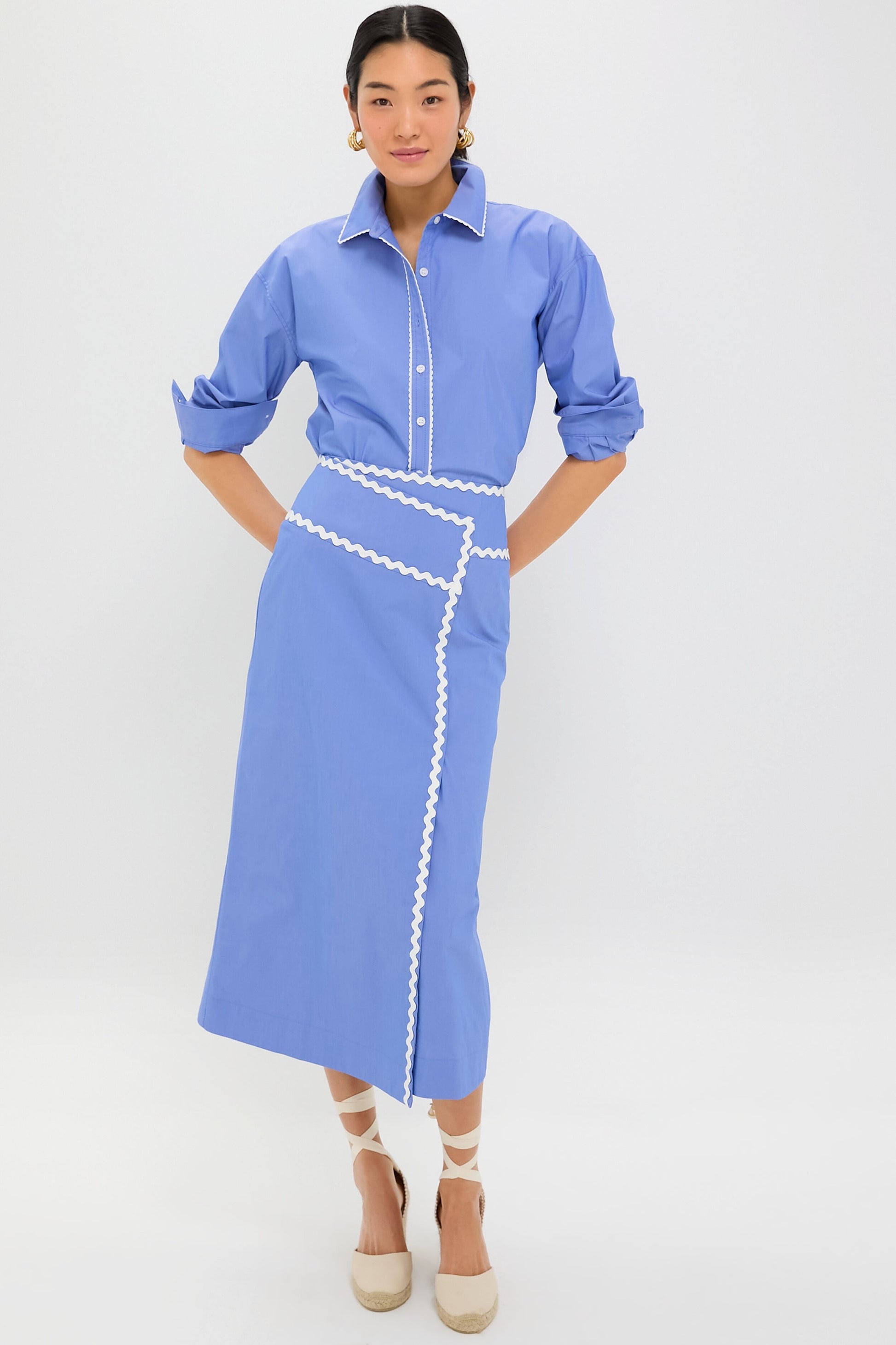 It doesn't get better than the Marcy Maxi Skirt. With a faux wrap silhouette and white ric-rac trim decorating the crisp, wrinkle-resistant fabric, this elegant style will effortlessly take you from the boardroom to dinner with friends. Pair with a simple white blouse or with the matching Sail Blue Cropped Jasper Button Down for a chic set.