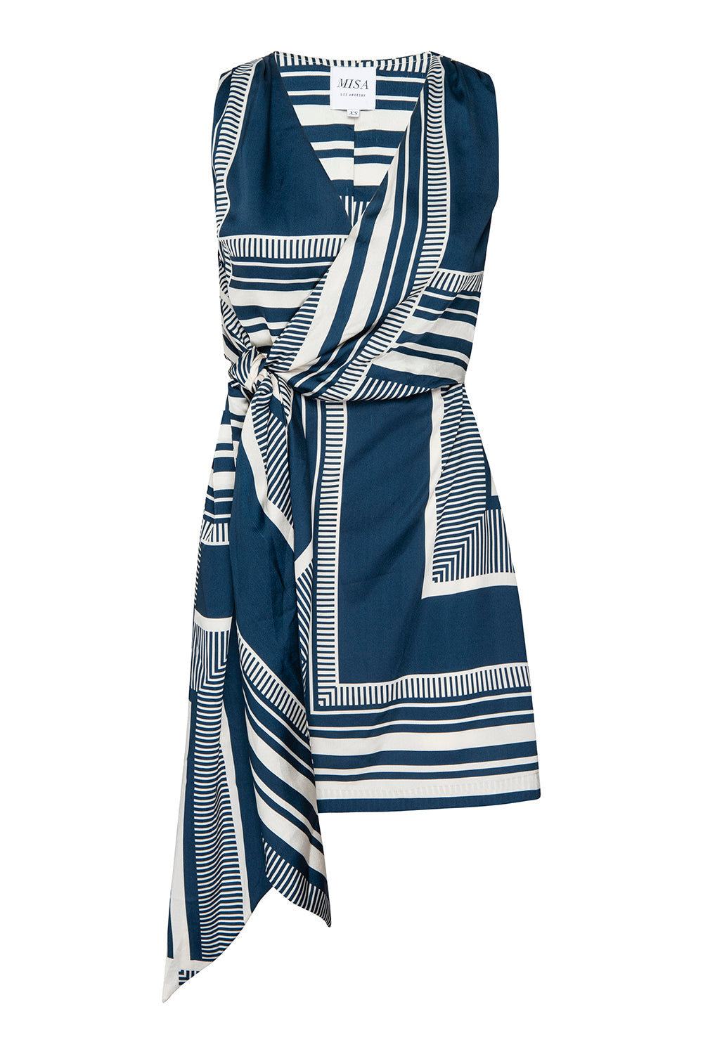 The Sakina dress is a satin wrap-style mini featuring our Linear Geo print. Sleeveless with a surplice neckline and a self-tie waist, it offers a flattering, easy-to-wear silhouette. Style with neutral wrap sandals for the perfect getaway look.