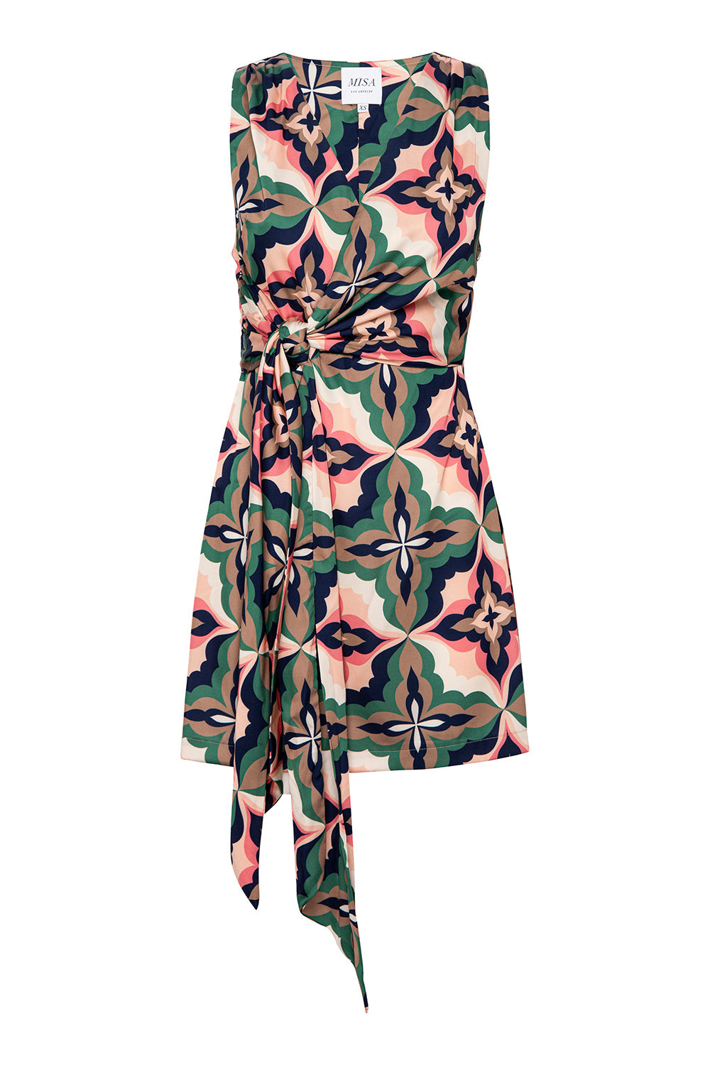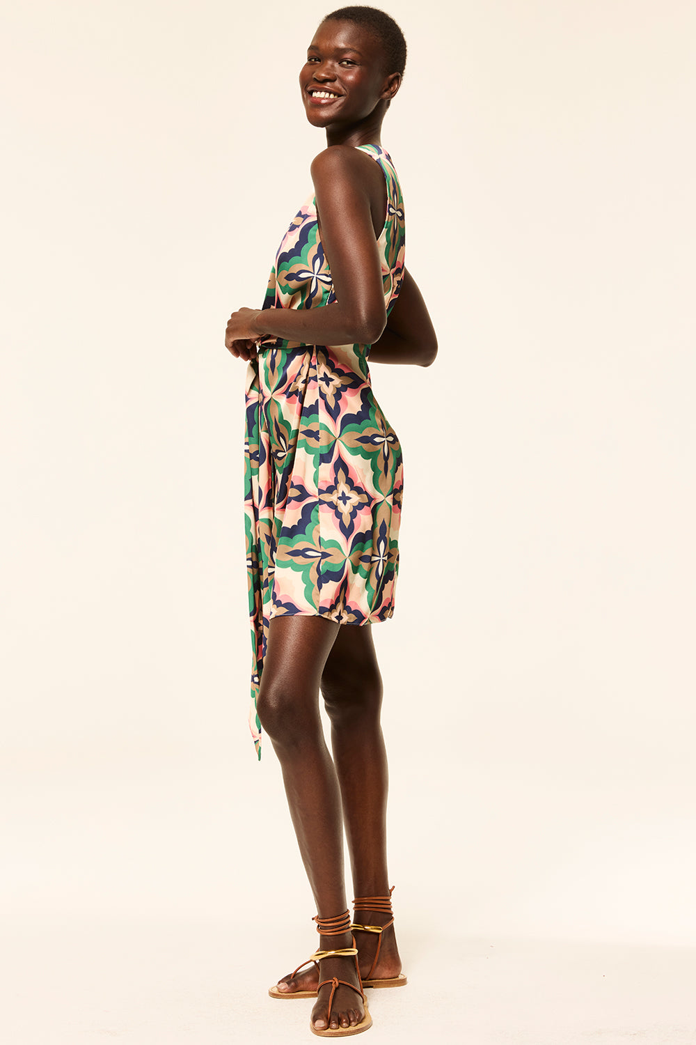 The Sakina dress is a satin wrap-style mini featuring our Prismatic Tile print. Sleeveless with a surplice neckline and a self-tie waist, it offers a flattering, easy-to-wear silhouette. Style with neutral wrap sandals for the perfect getaway look or dress up with heels for an evening out.