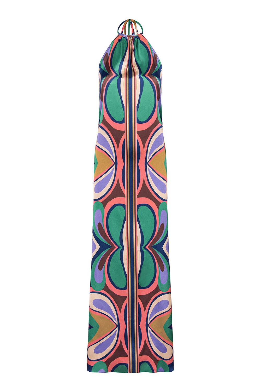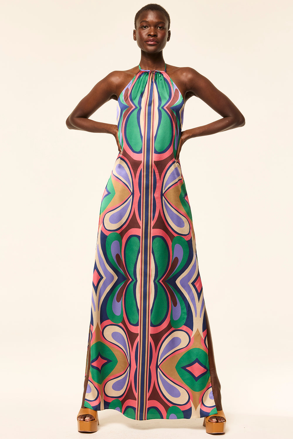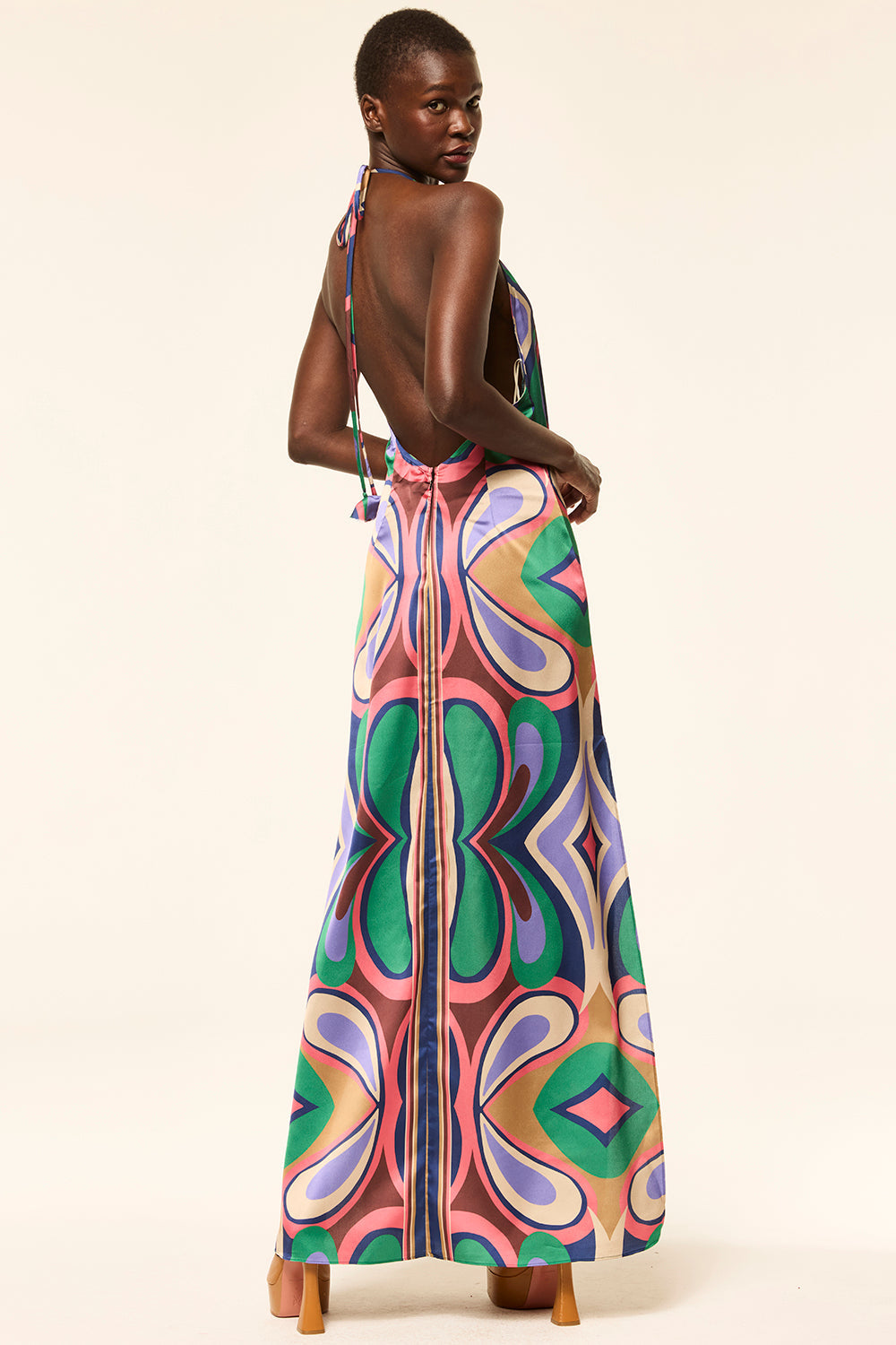 The Samantha Dress is a striking halter maxi cut from our luminous Butterfly Mirror–printed satin. The neckline ties with signature petal tassels, while a dramatic open scoop back flows into a sweeping skirt with double thigh-high slits. Finished with a hidden back zip, it’s perfect dressed down with flat sandals for a warm-weather escape or elevated with strappy heels for your next event.