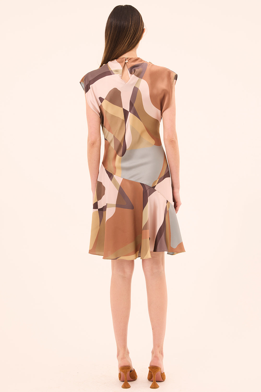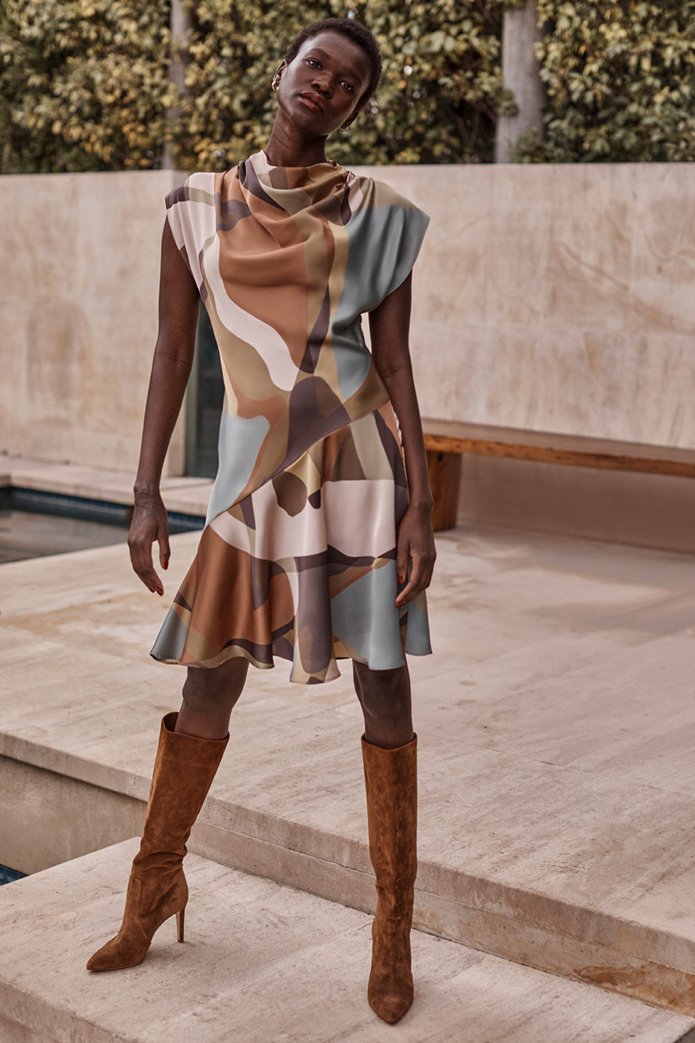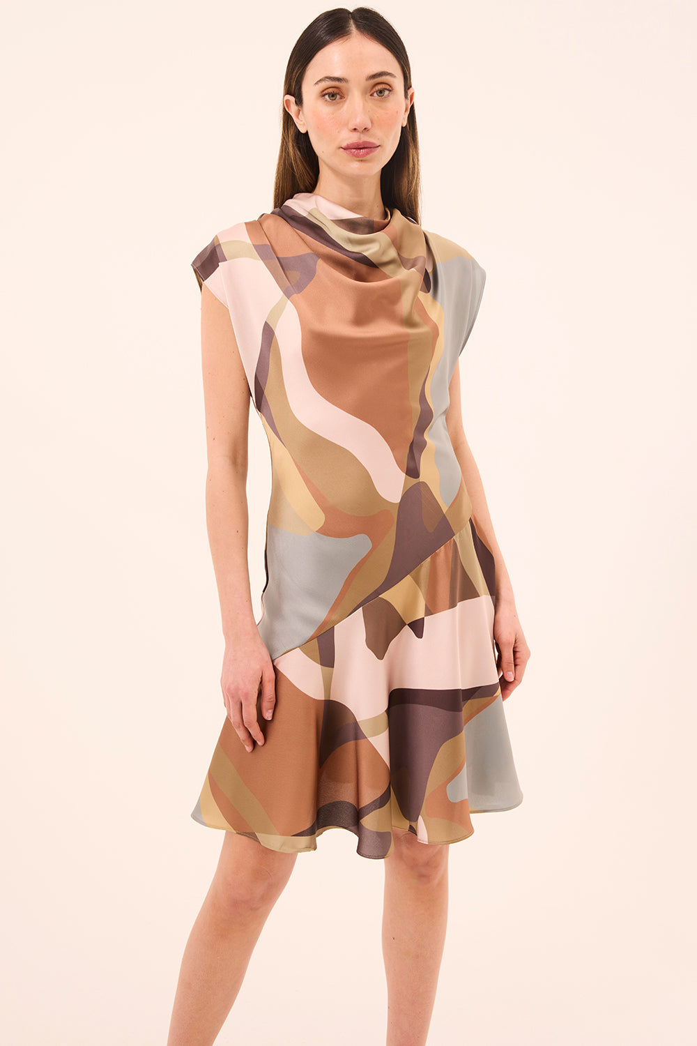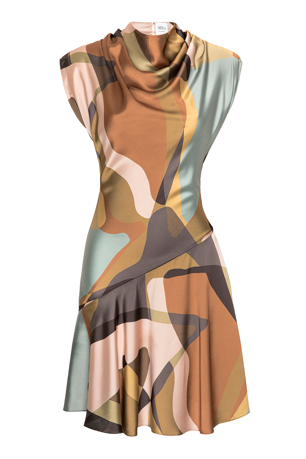 Sandy is a chic new mini silhouette that falls just above the knee, cut from our Desert Abstract satin. Featuring a high cowl neckline, capped sleeves with wide armholes, and a button-back keyhole closure, it’s finished with a hidden side zip for a seamless fit. A diagonal front seam creates an asymmetrical effect, while the loose pleated skirt adds movement. A modern, versatile style perfect for the transitional season.