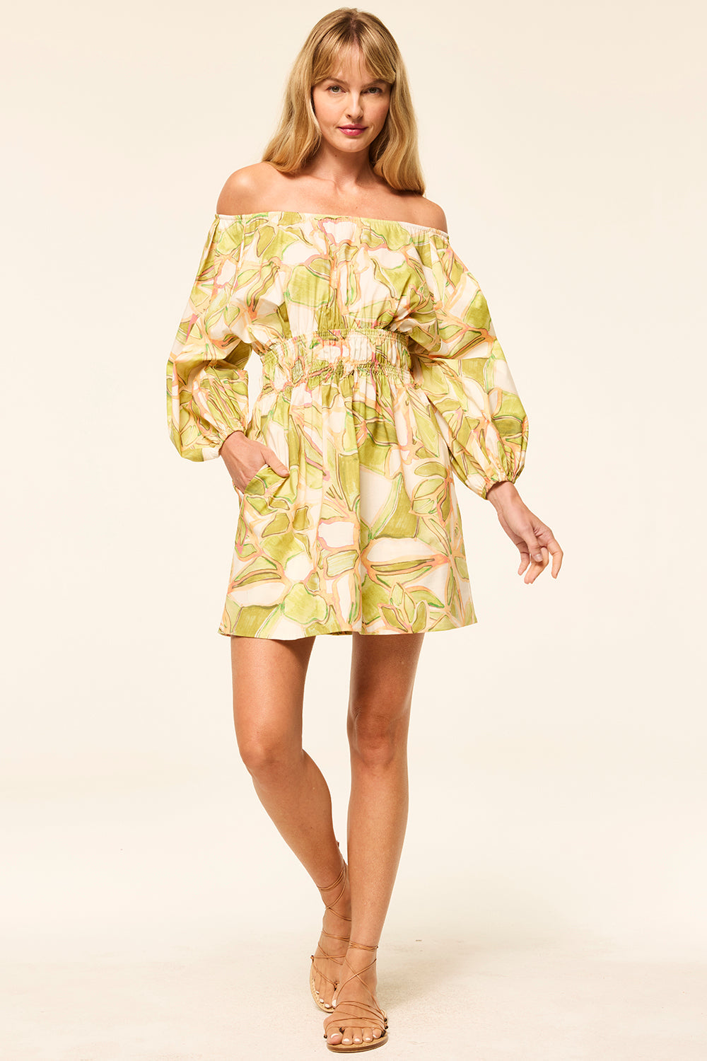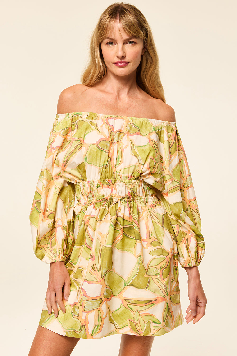 The Senia dress is a breezy mini cut from cotton in a soft Chartreuse Abstract print. This versatile off-the-shoulder silhouette features voluminous long sleeves, a gathered smocked waist, and hidden side slit pockets. Designed to be worn on or off the shoulder, it’s the perfect day dress or pack-and-go piece for effortless style.