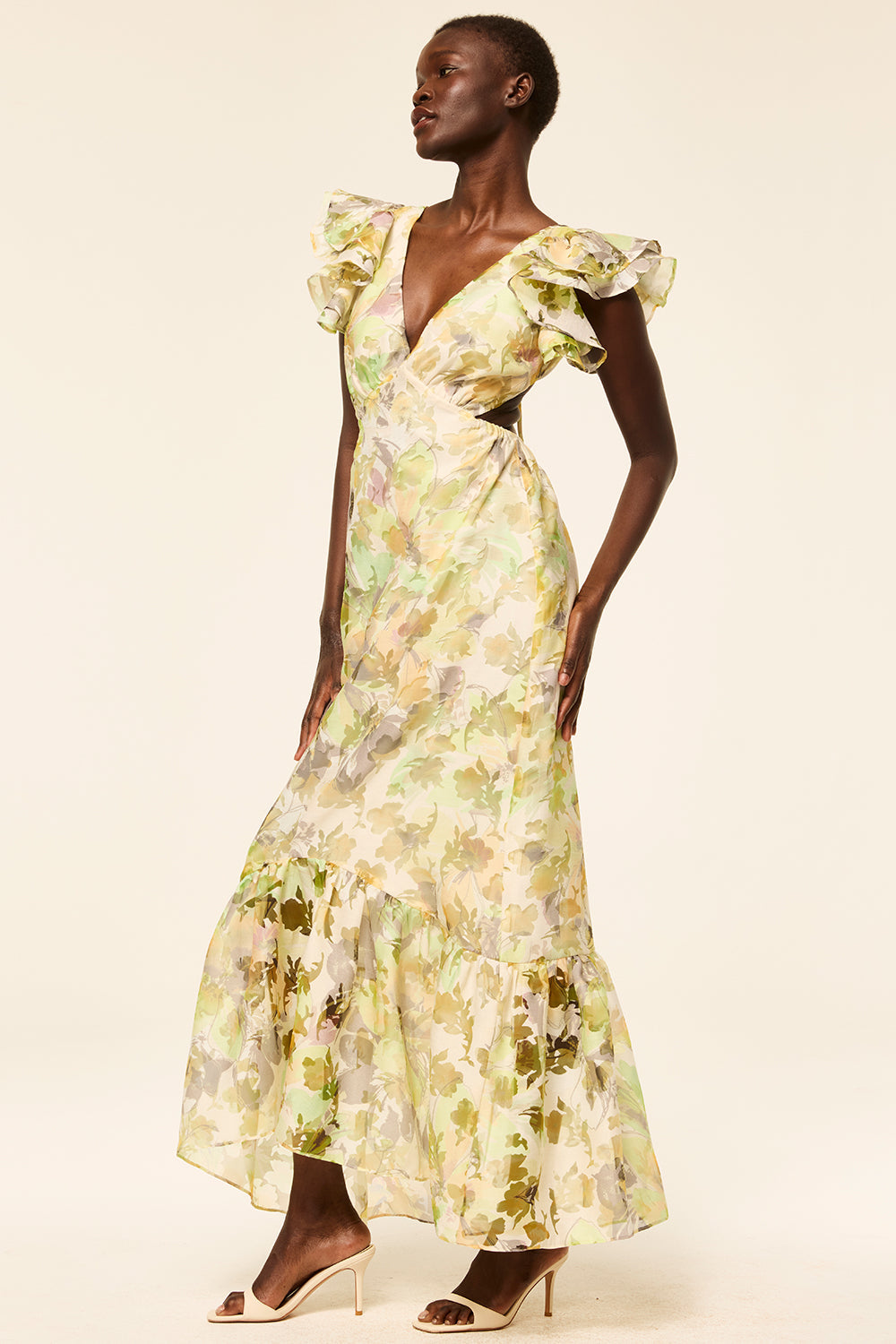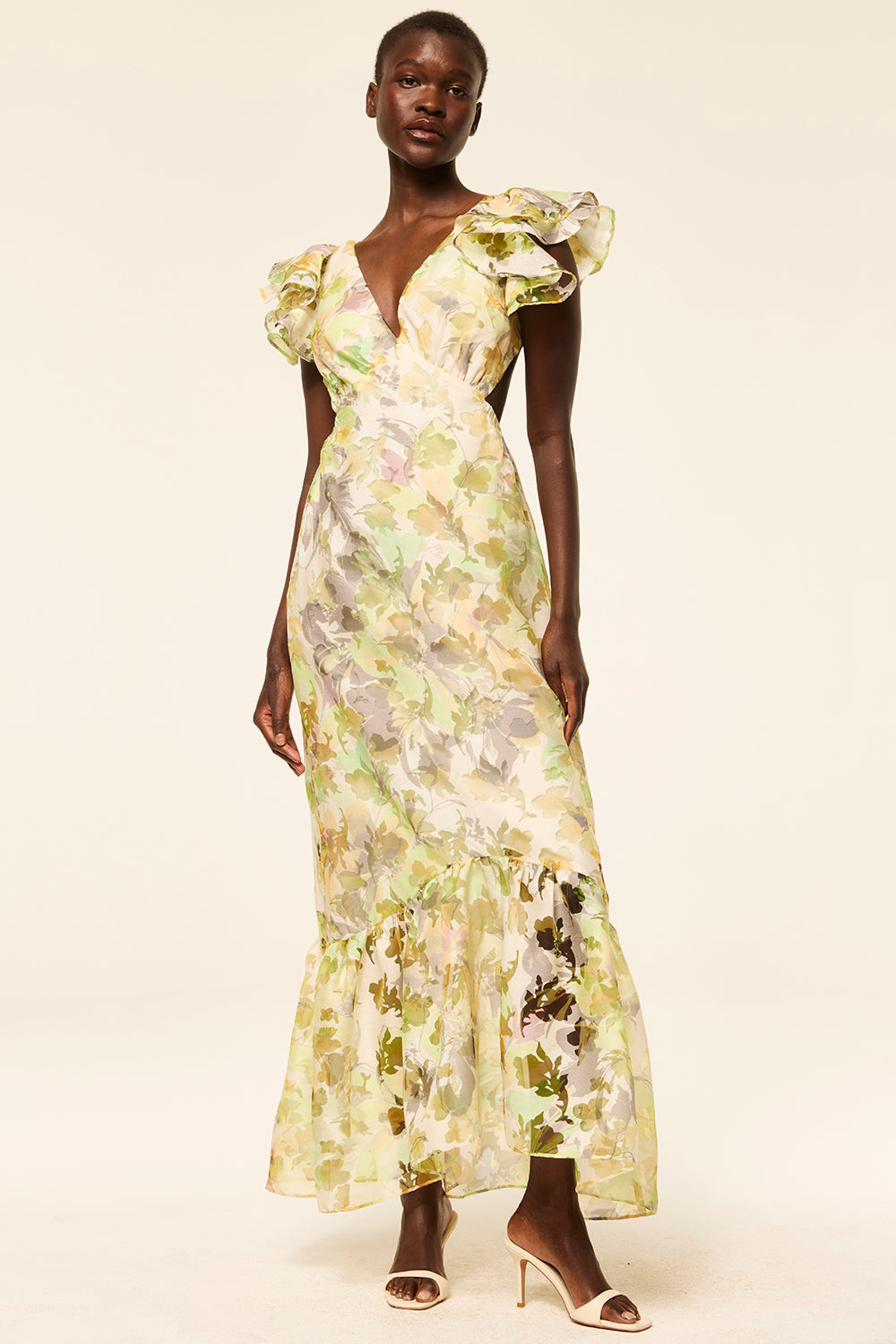 Our new Septima maxi dress is a stunning option for every special event on your calendar this season and beyond. Cut from a dreamy burnout Lucent Blooms printed fabric, this dreamy silhouette features a deep v neckline and short ruffle tiered sleeves with a flattering open back and petal tassel tie closure. Fully lined to the knee with a gorgeous sheer, wide ruffle, asymmetric hem.