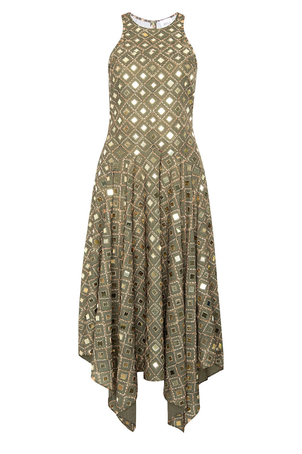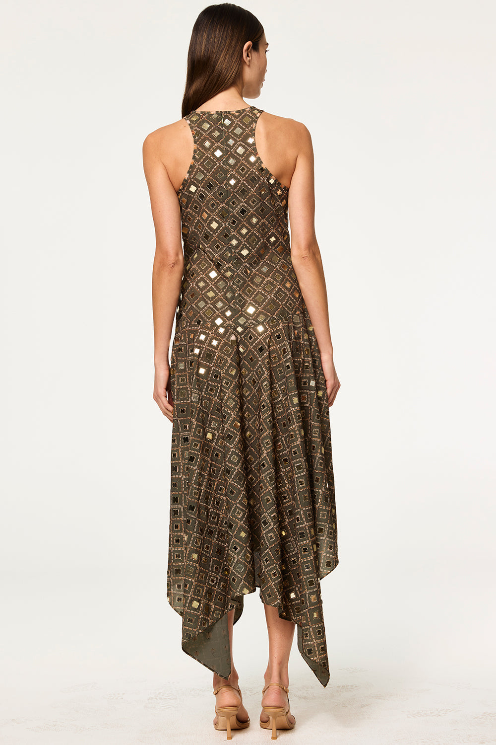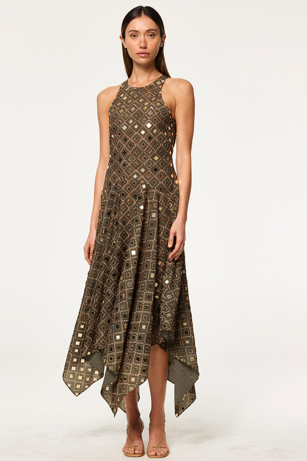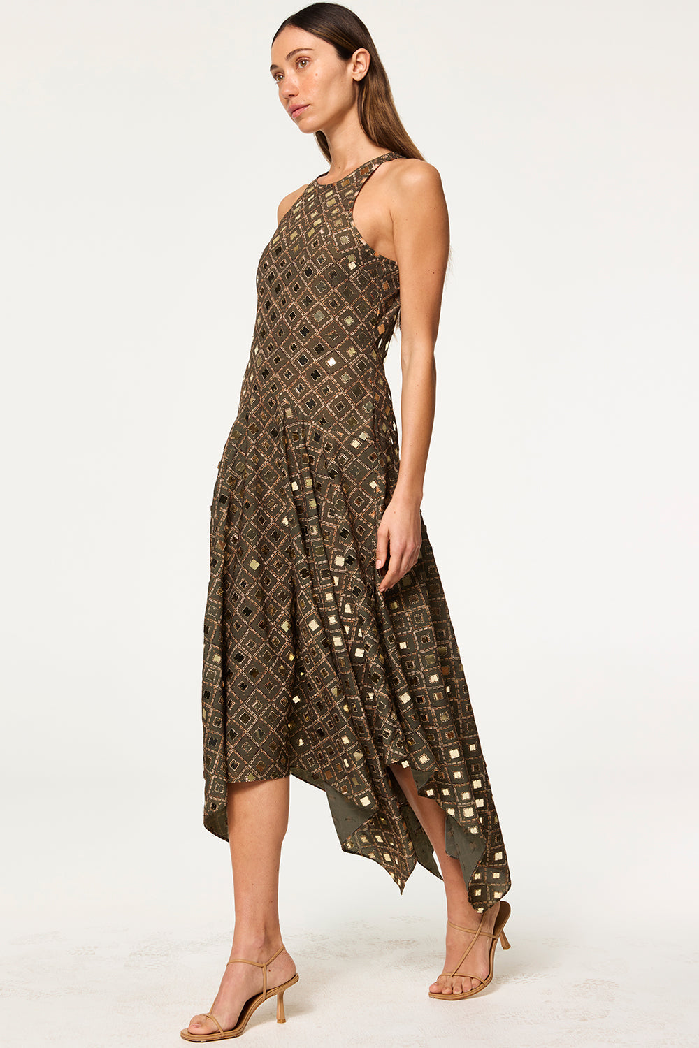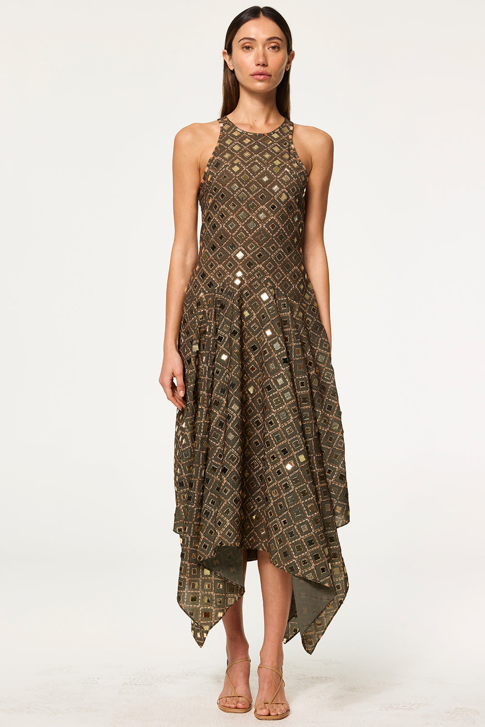 Shirley is a standout midi dress cut from olive fabric and fully embellished with sewn-on mirrored tile details for a high-shine finish that catches the light beautifully. Fitted through the bodice and waist, the silhouette flows into a staggered handkerchief hem with subtle flare. Designed with a sleek high halter neckline, sleeveless cut, and racerback, it’s finished with a hidden back zip closure. A bold yet versatile piece—perfect for your next summer event or dressed down with flats.
