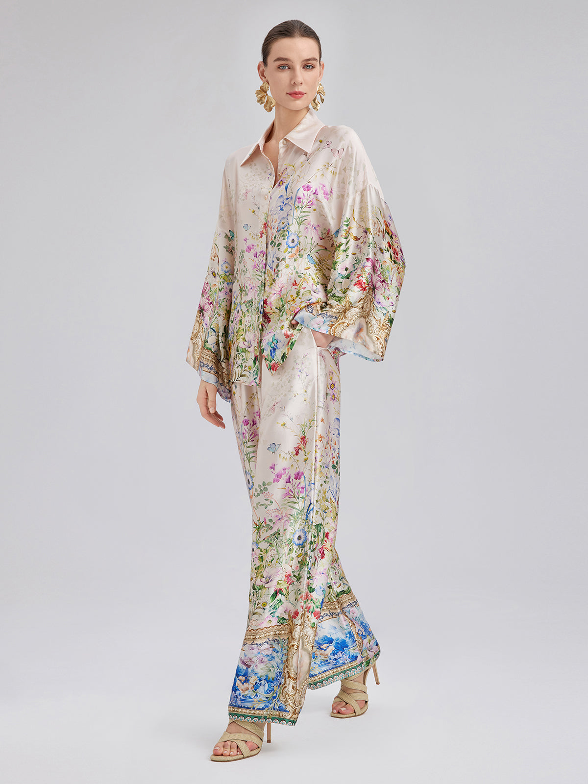 Made from 100% silk satin, this shirt offers a silky-smooth touch and understated luxury. Featuring floral prints with a hand-painted look, each flower is precisely positioned using advanced cutting techniques. The relaxed fit and slight bell sleeves flatter the figure effortlessly.