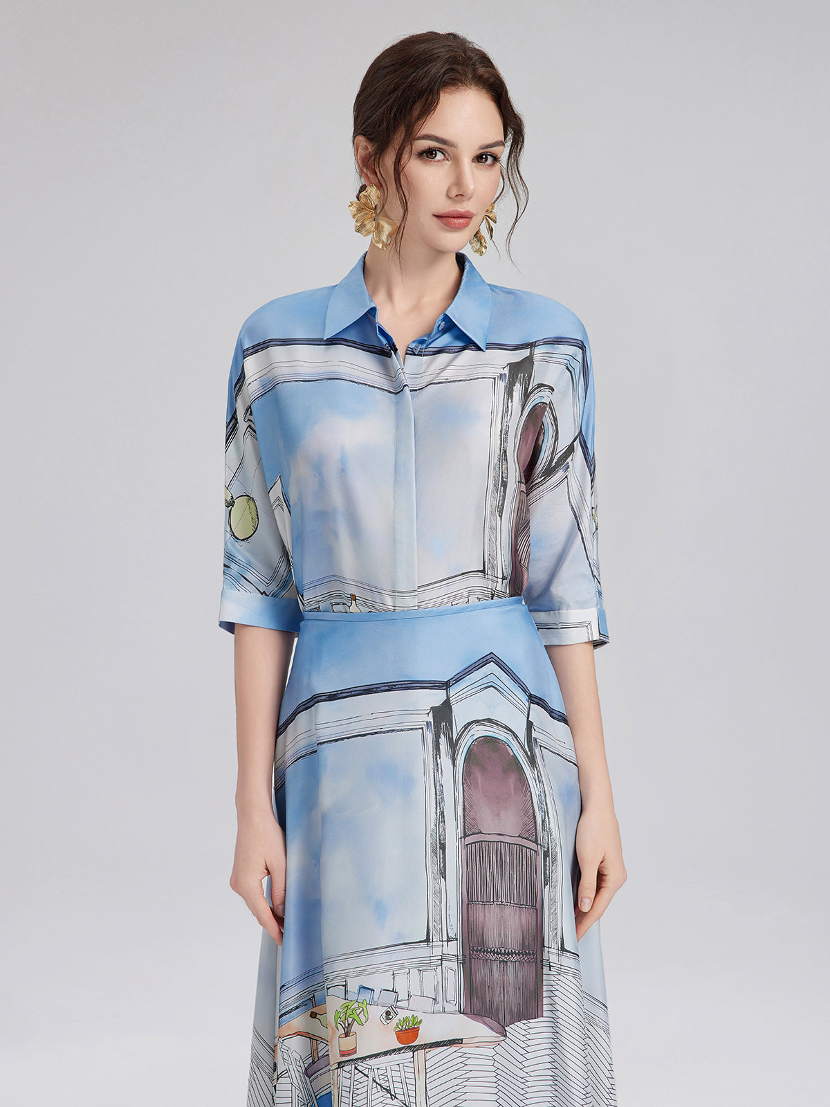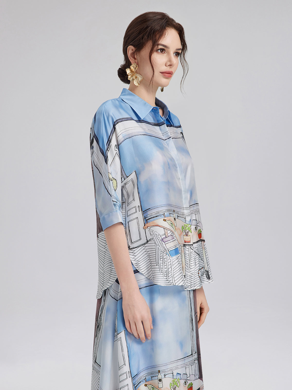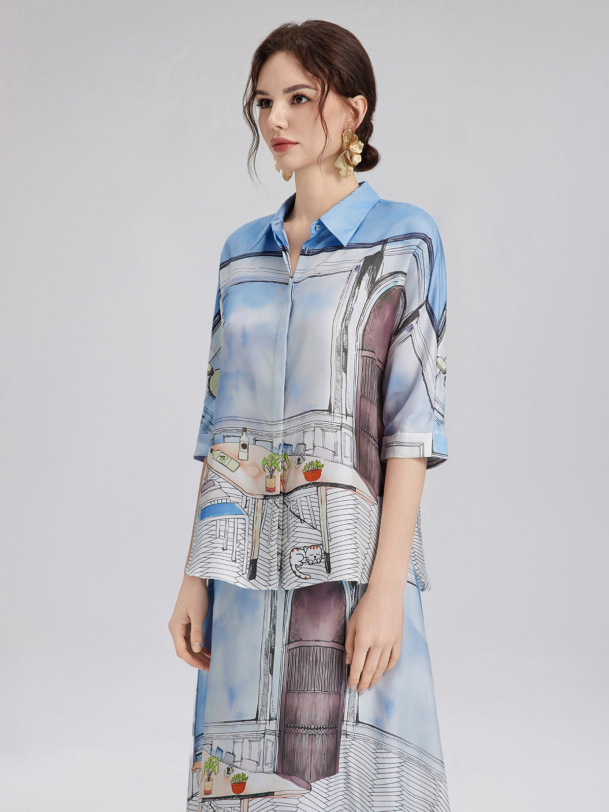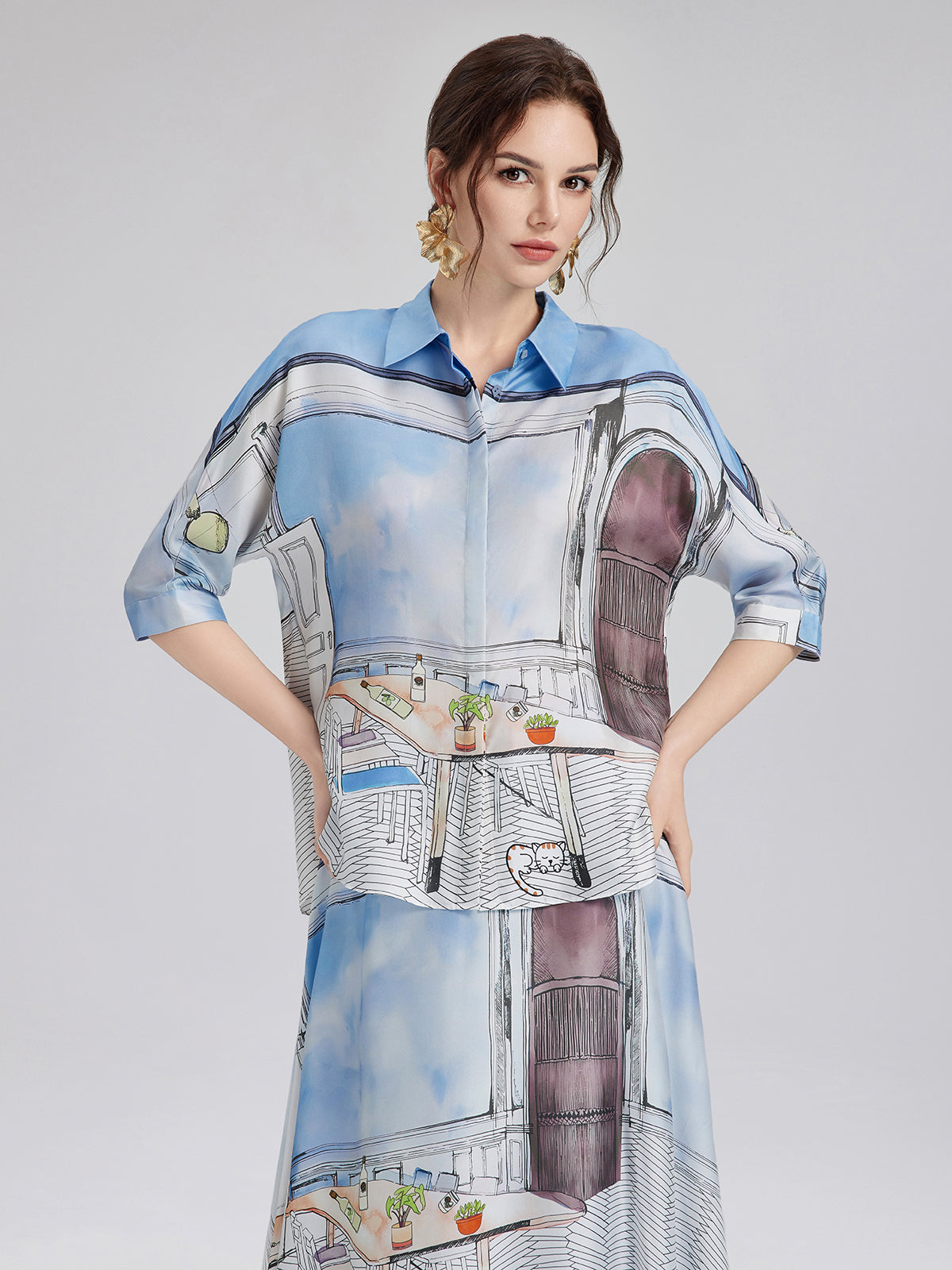 Crafted from premium silk twill with clean, symmetrical pattern alignment using precise silk panel-matching, this shirt blends soft blues and whites for a calm, fresh look ideal for spring and summer. The relaxed cut with short sleeves ensures comfort and versatility—easy to wear for both casual and polished moments.