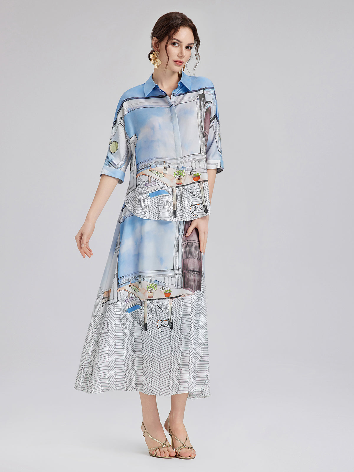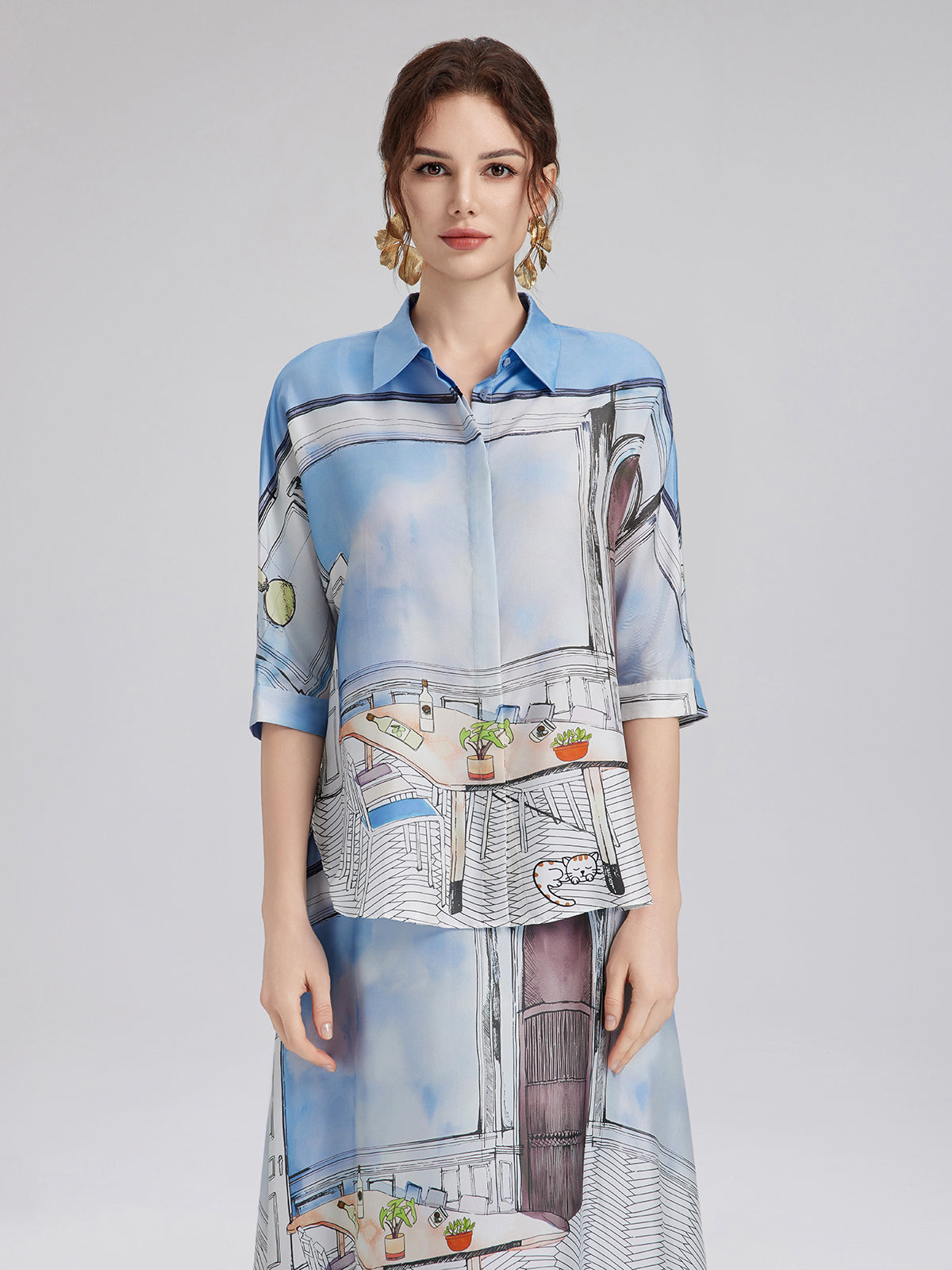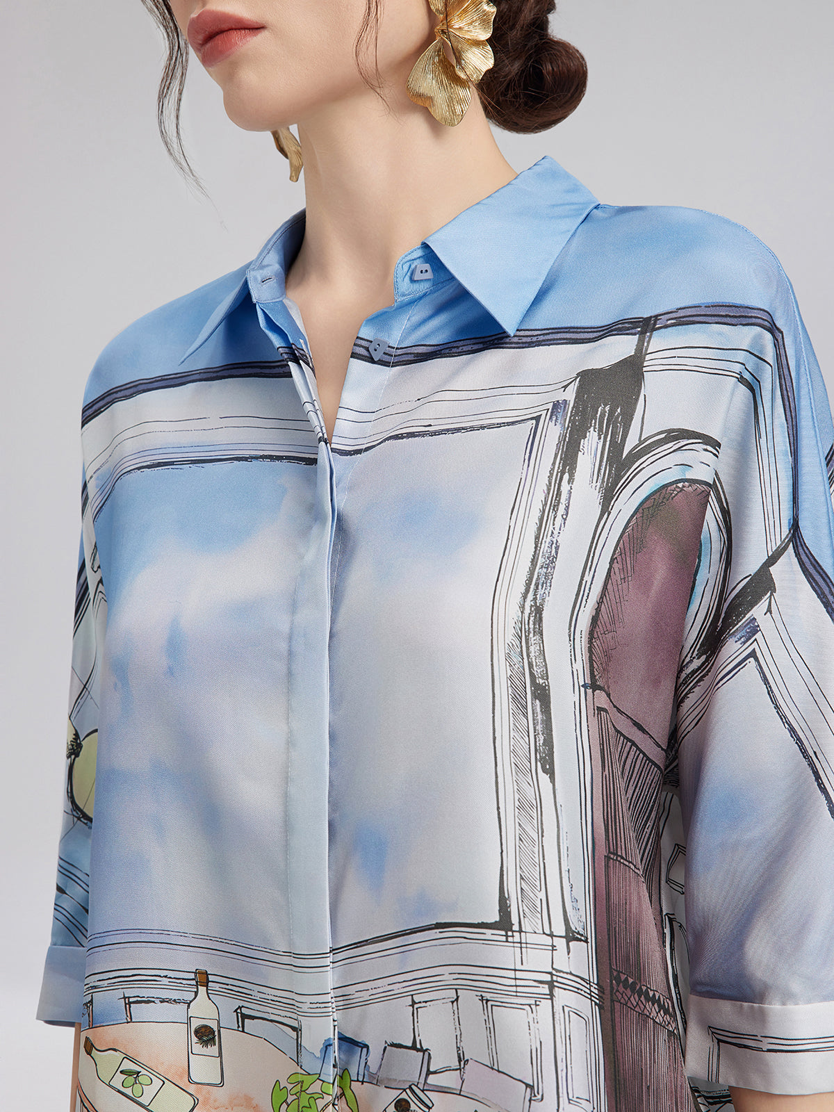Crafted from premium silk twill with clean, symmetrical pattern alignment using precise silk panel-matching, this shirt blends soft blues and whites for a calm, fresh look ideal for spring and summer. The relaxed cut with short sleeves ensures comfort and versatility—easy to wear for both casual and polished moments.