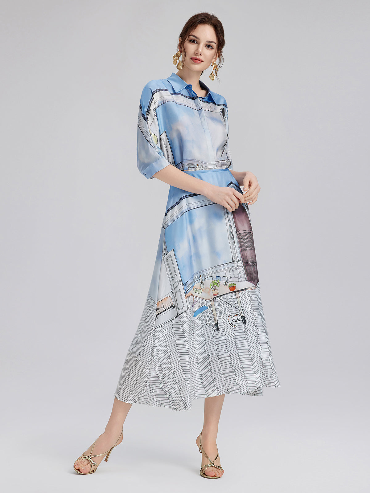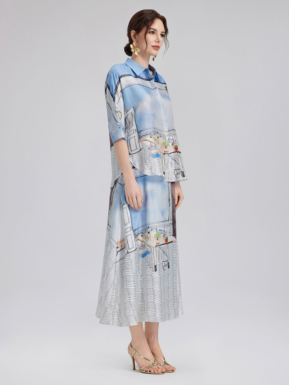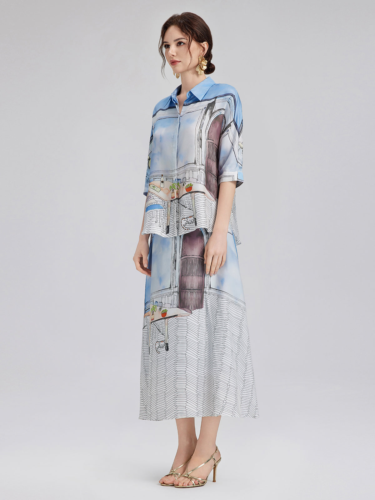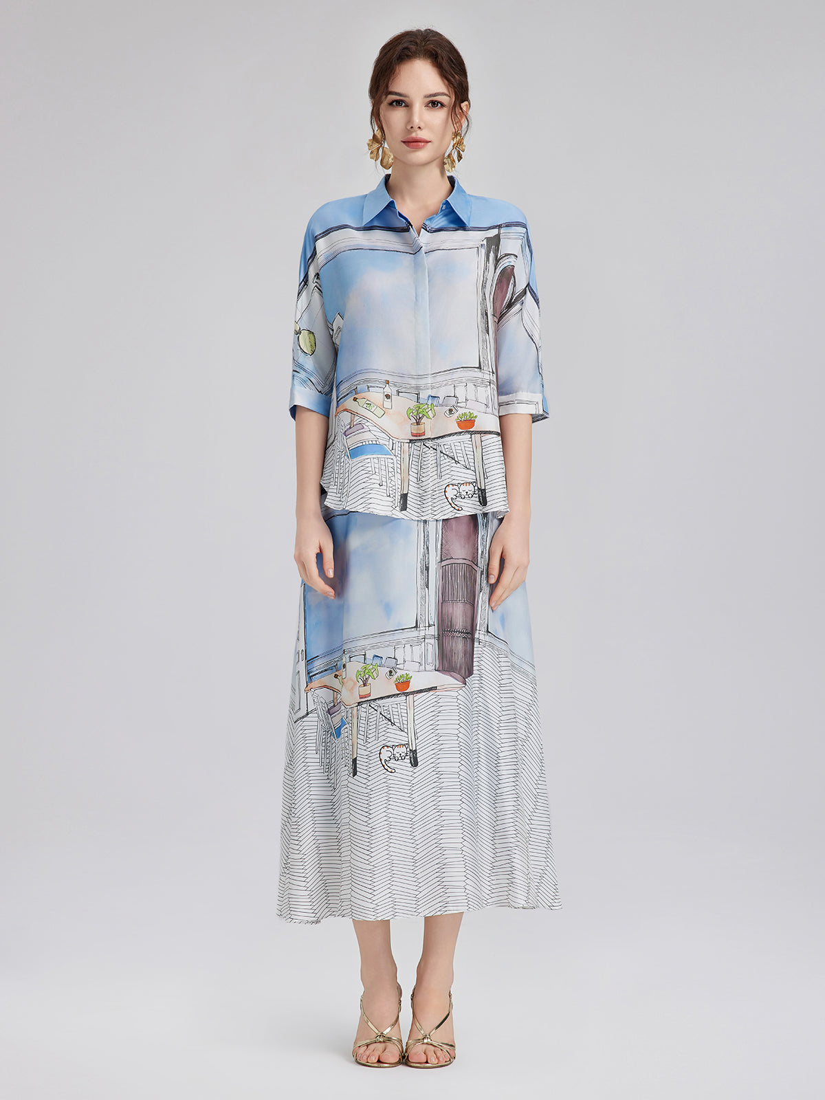 Crafted from premium silk twill with clean, symmetrical pattern alignment using precise silk panel-matching, this shirt blends soft blues and whites for a calm, fresh look ideal for spring and summer. The relaxed cut with short sleeves ensures comfort and versatility—easy to wear for both casual and polished moments.