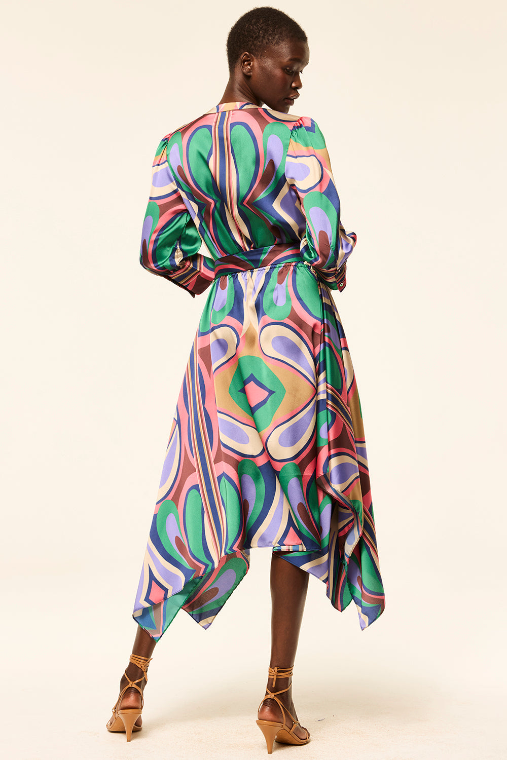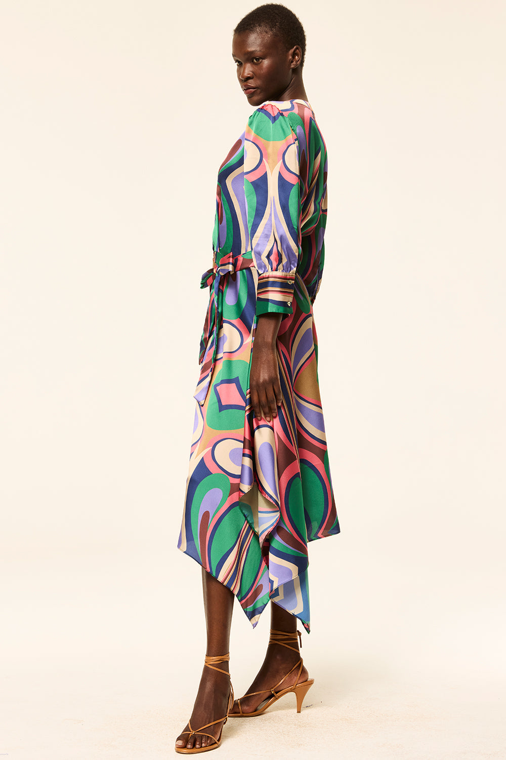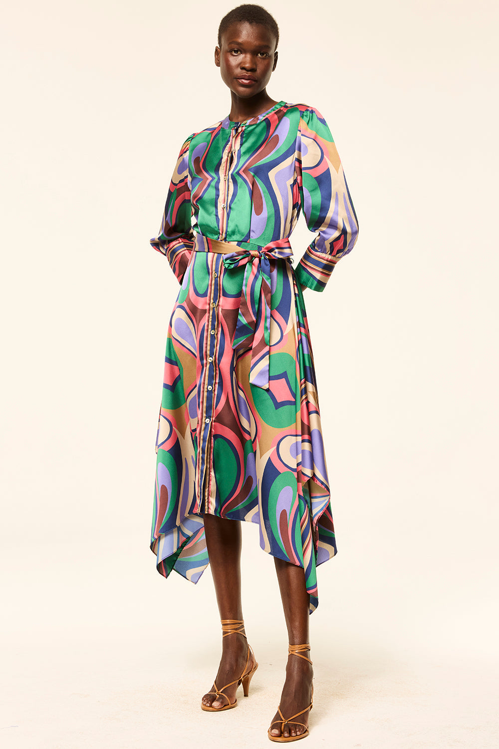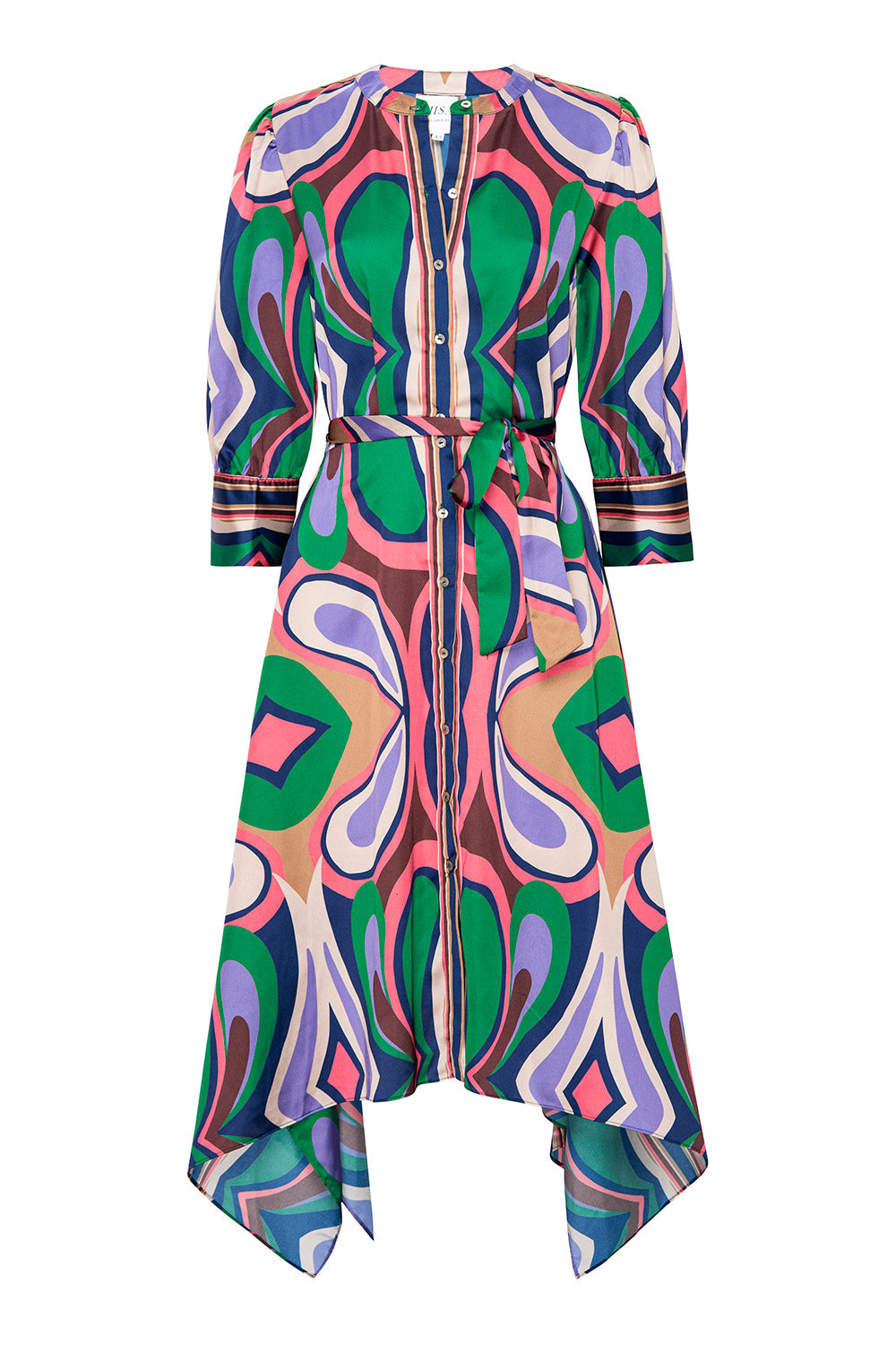 The Solmaz dress stuns in our Butterfly Mirror print, featuring a midi silhouette with a V-neckline, button front, and self-tie waist for a flattering fit. Three-quarter sleeves with button cuffs add a tailored touch, while a staggered handkerchief hem brings movement and ease. A beautiful piece that transitions effortlessly from one season to the next.