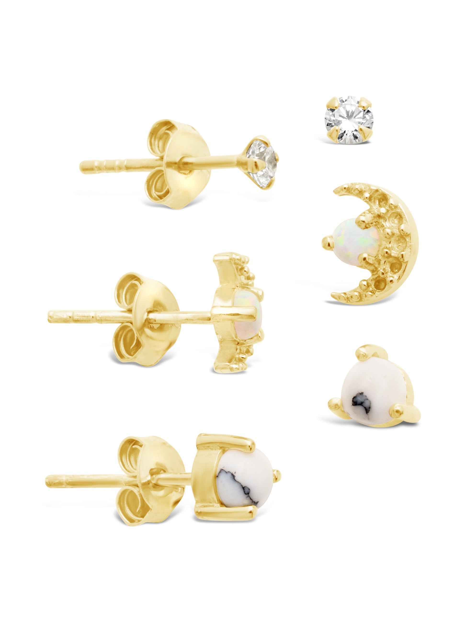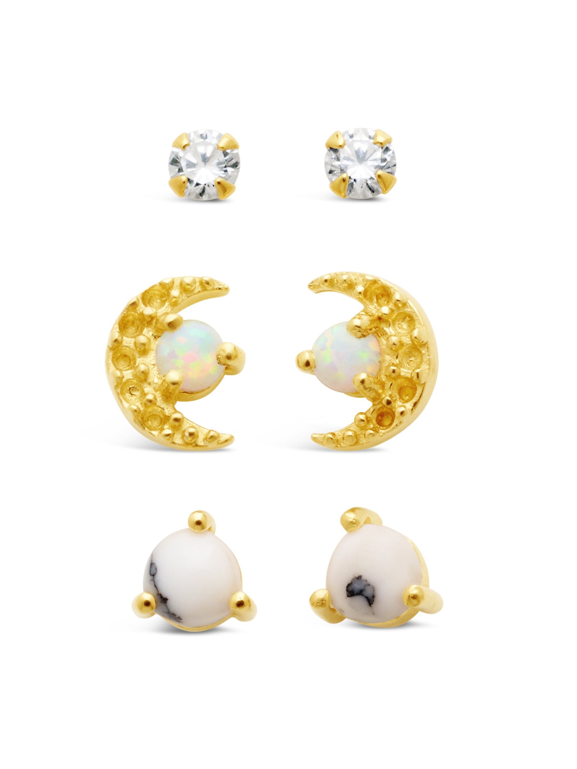 Add elegant and unique details to your outfit with the studs from this striking set! It includes one pair each of CZ studs, crescent moons with opals, and dainty marble stone studs. Available in gold and silver tones.