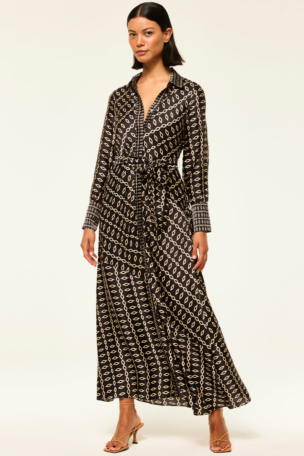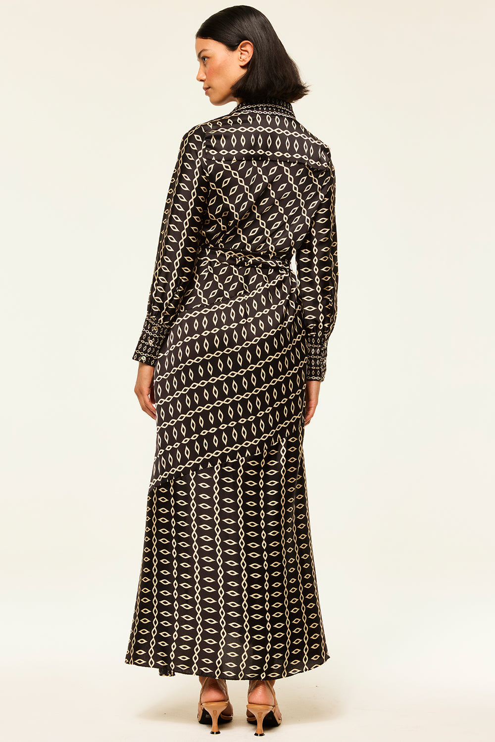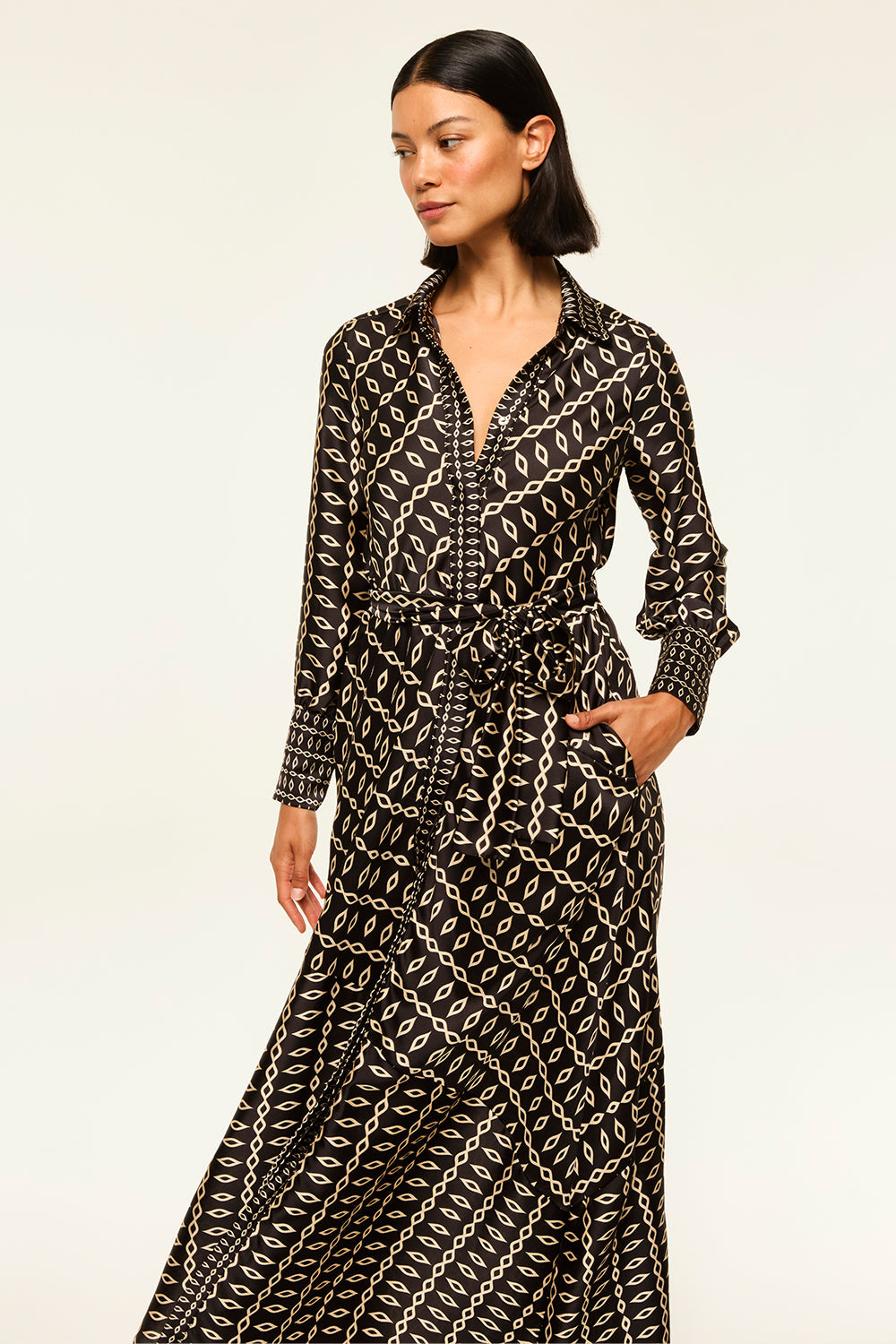 Stevie is an update on the classic shirt dress, rendered in a timeless Go West Geo printed satin on black ground. A fully covered button placket with spread collar and long sleeves with wide button cuffs. An optional self-tie belt. This versatile and universally flattering maxi length silhouette will carry you through fall into winter. Pair with everything from knee high boots to strappy heels.
