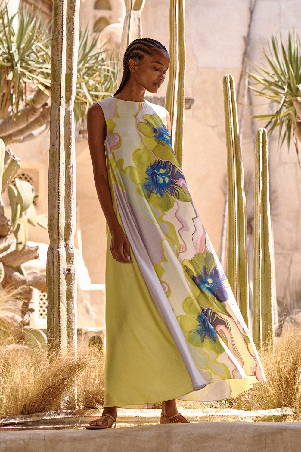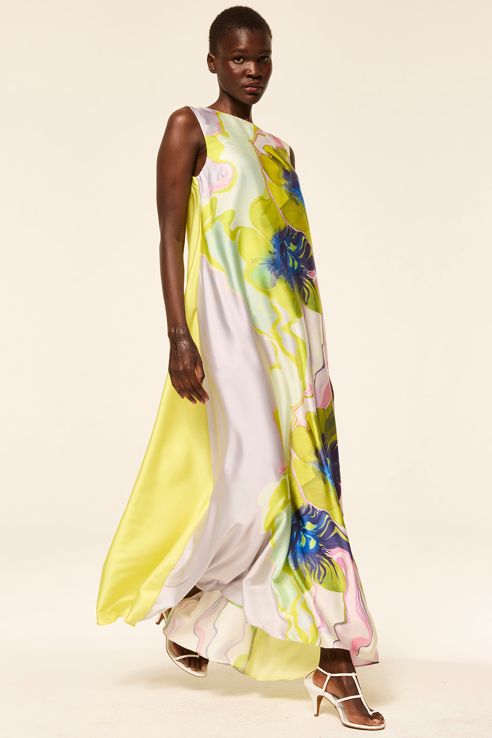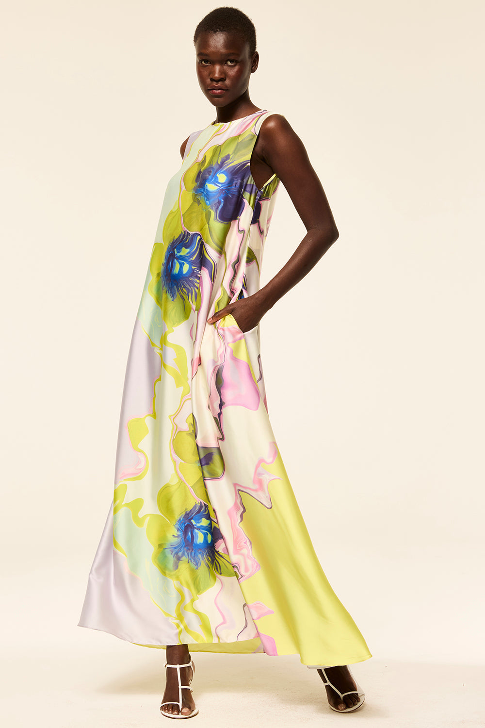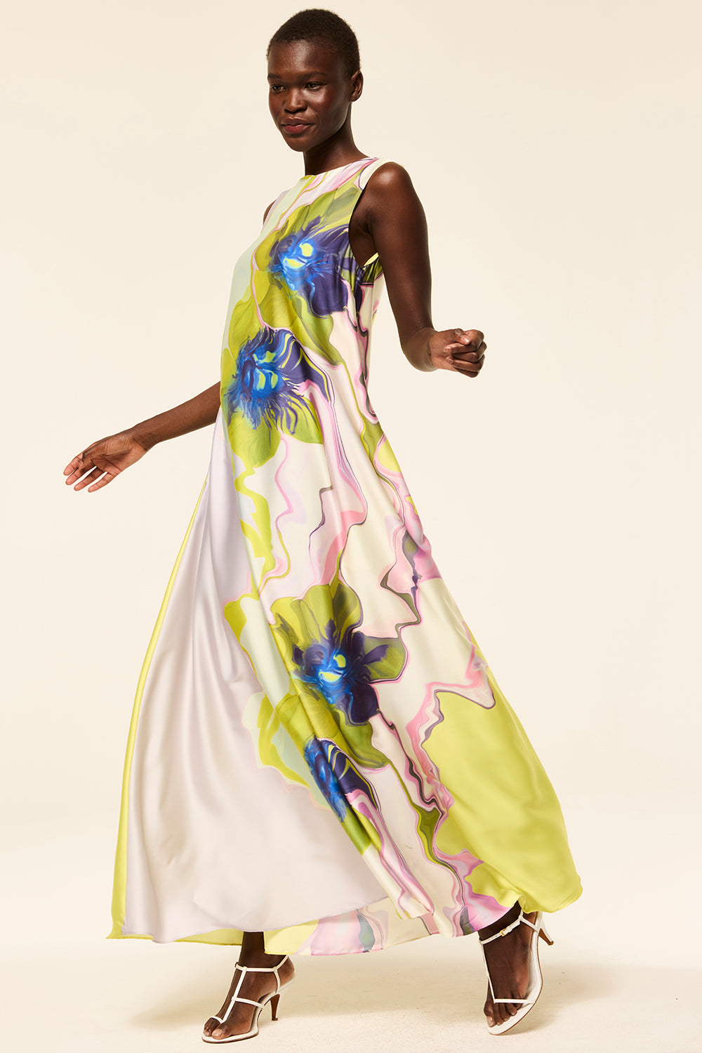 Our new Sylvie dress in Marble Flora satin evokes all things spring. This modern, flowing, sleeveless maxi dress features a crew neckline with keyhole button-back closure. Pair with a simple heel or flat for a look that will carry you through this season and beyond.