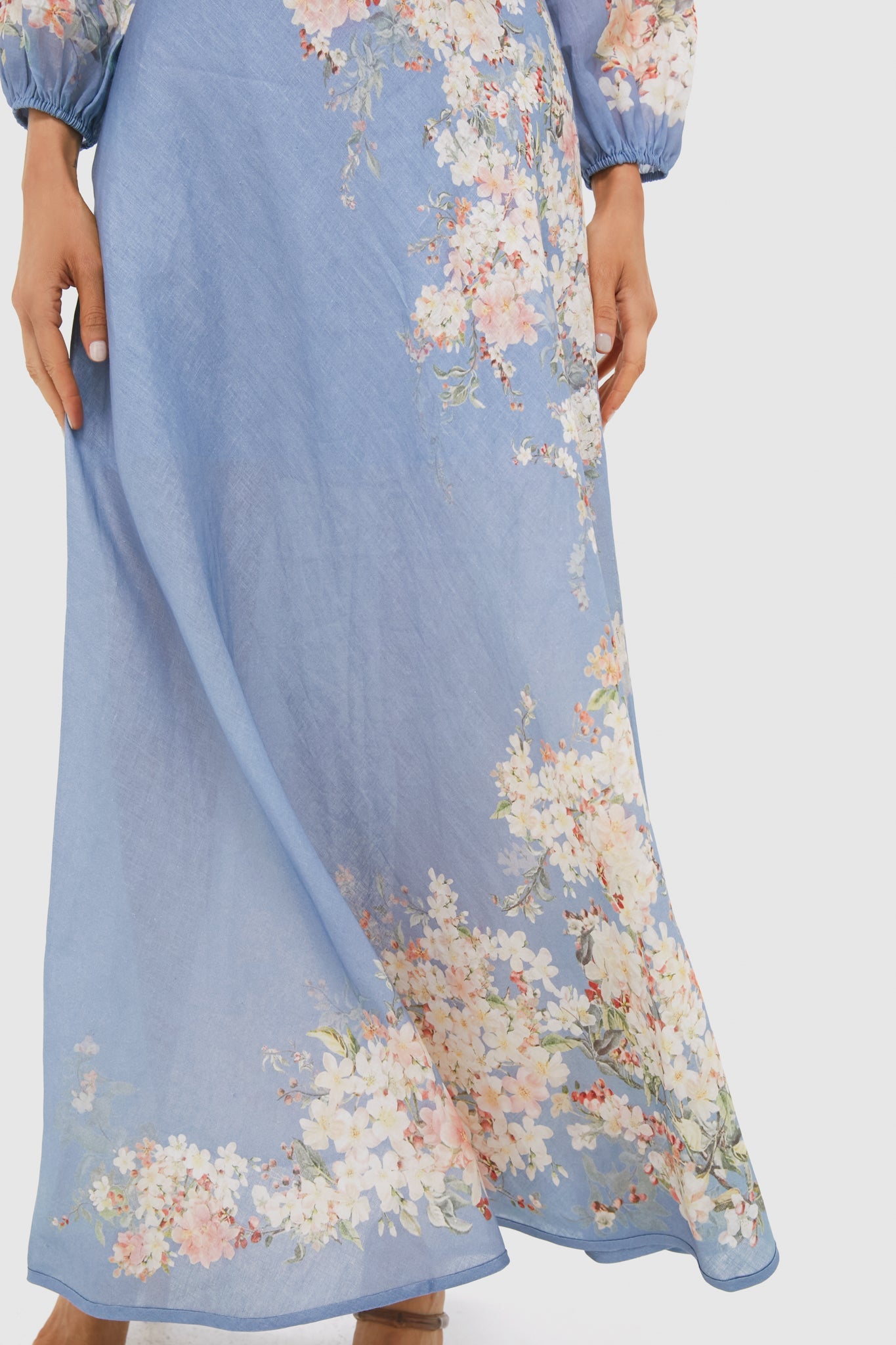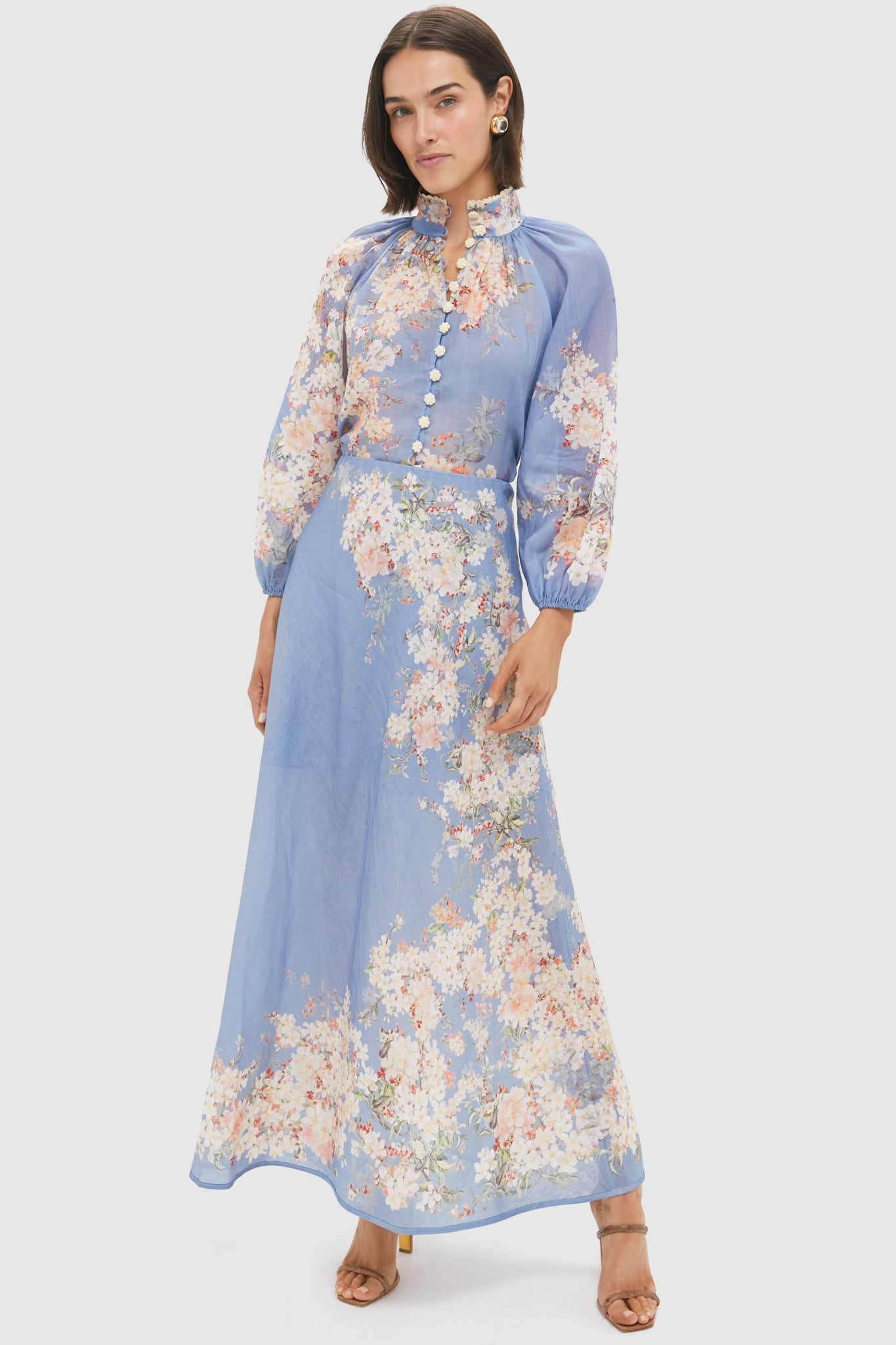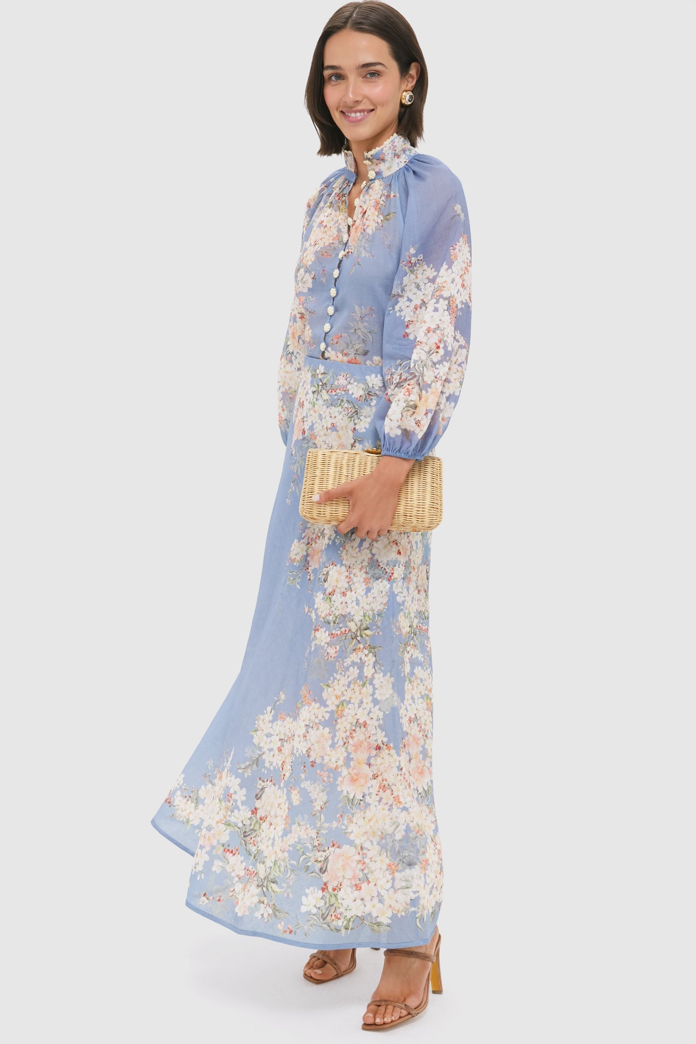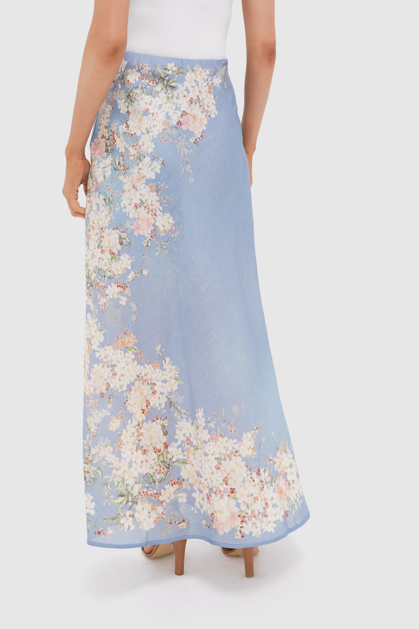 The Teal Blue Botanical Floral Cascadian Bias Skirt features a clean finish waistband and a soft A-line silhouette. Perfect for elevated luncheons, celebratory occasions, or anything in between, style with the matching Teal Blue Botanical Floral Cascadian Billow Blouse for a coordinating look!