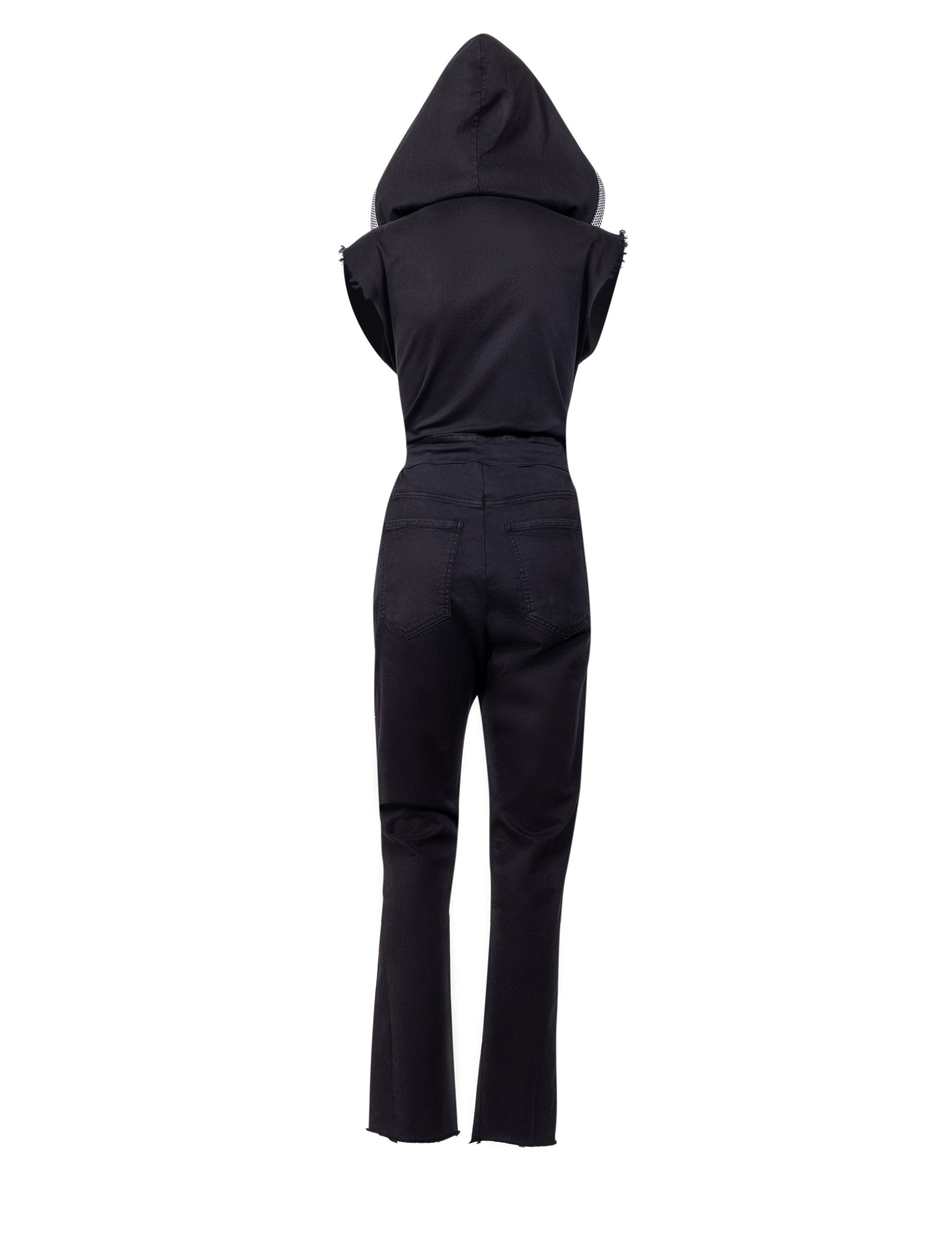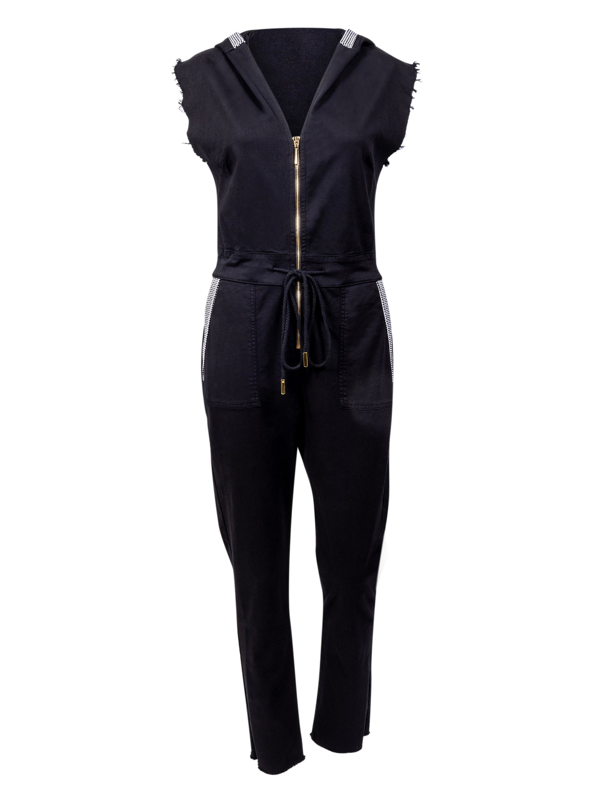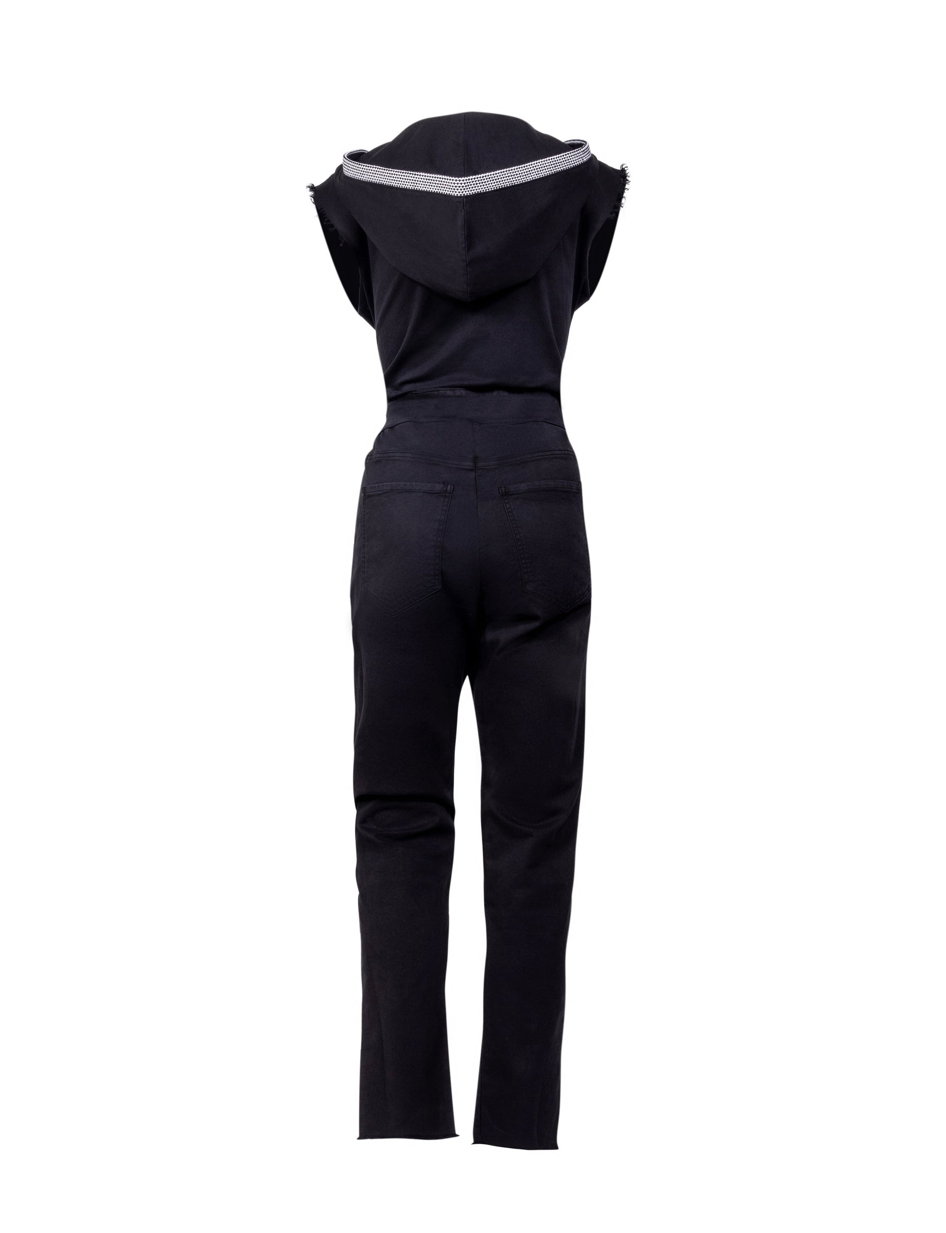 The luxurious fit and feel of this ultra soft stretch denim makes it an instant staple for any sustainable wardrobe. This sporty piece features a hood and front-slanted pockets trimmed with handmade organic cotton patterns imported from the Artisans of Union de Artesanos de Santo Tomás Jalieza Collective in Oaxaca, Mexico. The sleeveless style features raw edges with an ankle-length, tapered pant leg.