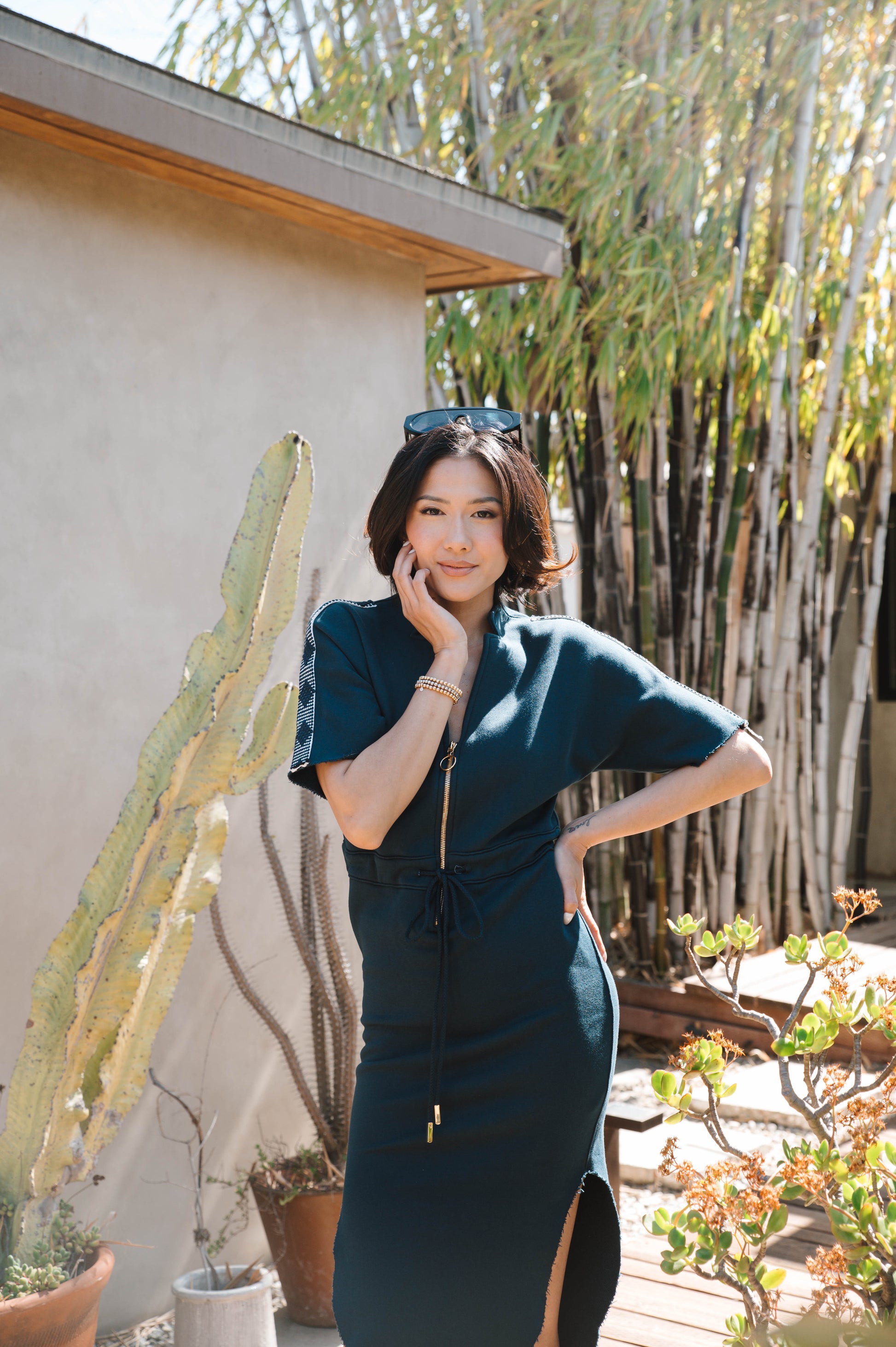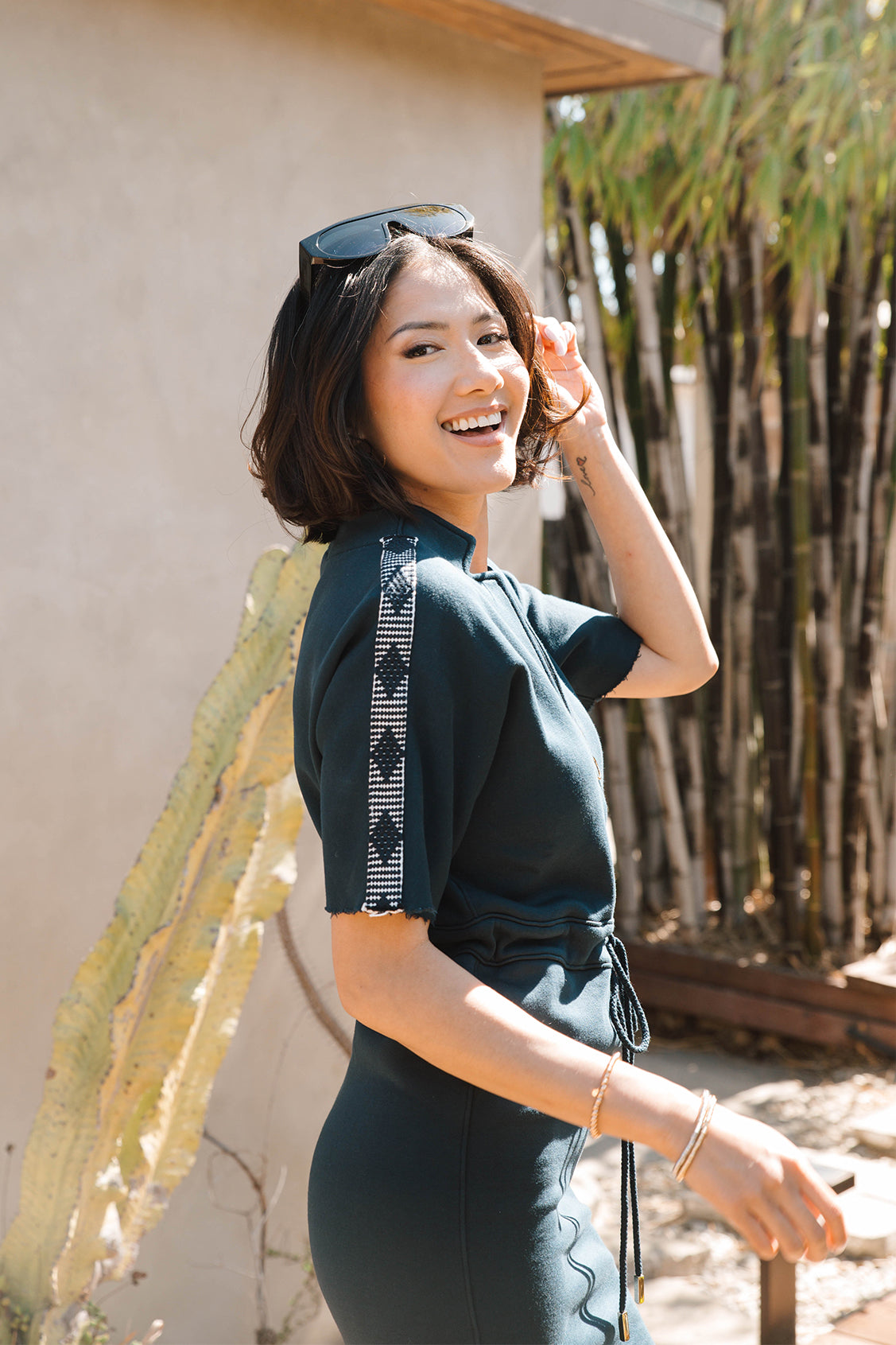 This sustainable organic cotton dress is ultra chic and comfortable with a welcomed seasonless breathability and stretch you can wear from morning to night. The sleeves feature a cotton trim from neck to edge of sleeve and handmade by the first collection’s Oaxacan Artisans. Note that the fit should start snug and it relaxes throughout the wear. Dress comes in black, white or carbon navy.