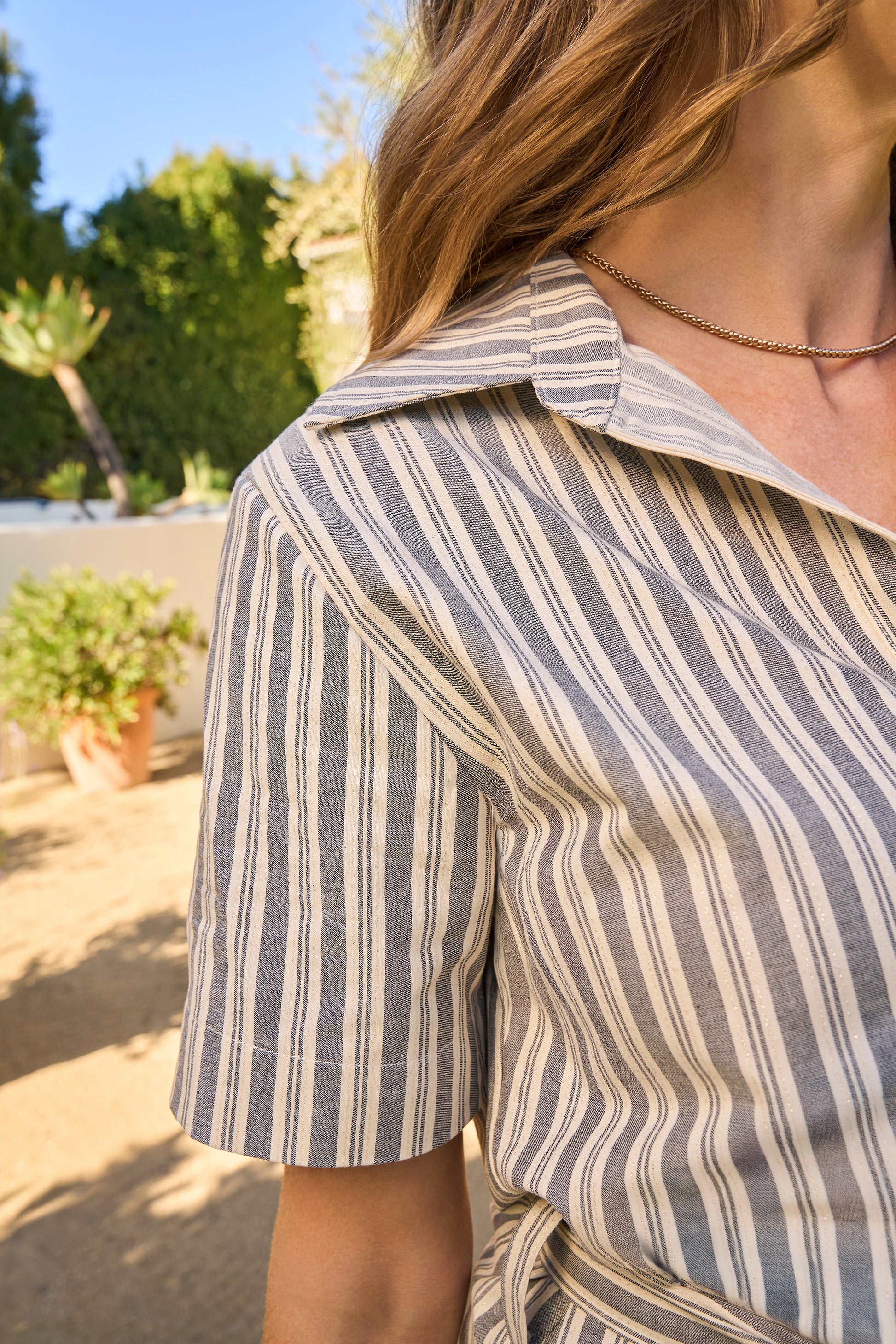 A modern classic re-imagined in our signature Italian cotton, The Robbi Shirt Dress brings crisp structure and soft comfort together in a versatile silhouette. Crafted from 97% recycled cotton, 2% viscose and 1% polyester, this breathable yet elevated fabric features understated vertical striping with a subtle gold thread woven throughout - delivering just the right amount of polish for day-to-night transitions.