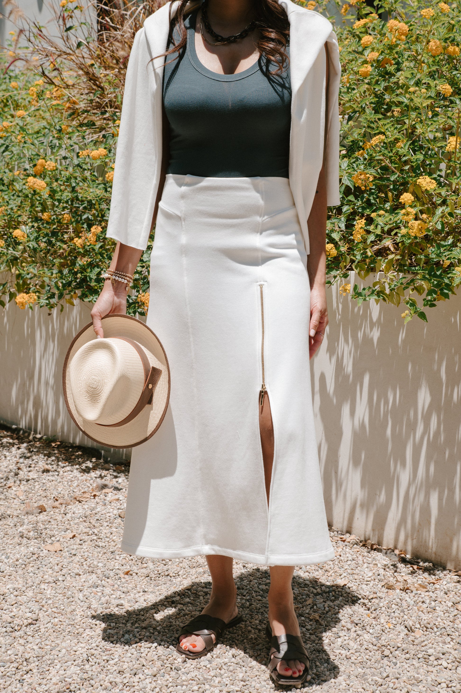 Crafted from premium Italian cotton terry, this skirt provides a soft, breathable feel that will keep you cool and comfortable throughout the warmer months. With its luxurious fabric, the Sia Skirt brings tailored elegance and versatile style, whether you're attending a casual brunch, a day trip, or simply enjoying a relaxing day out.