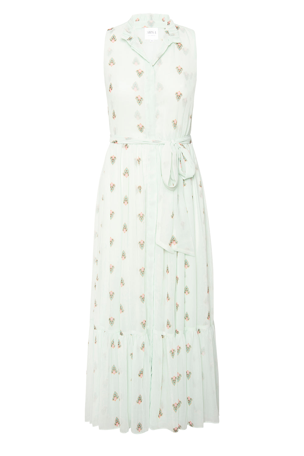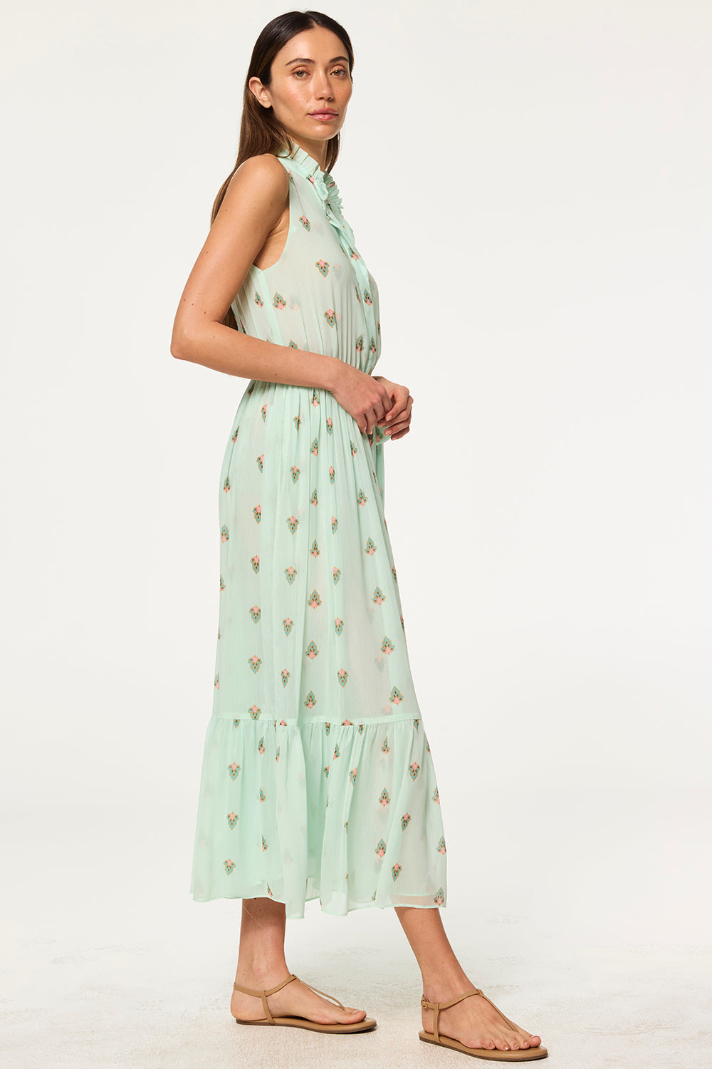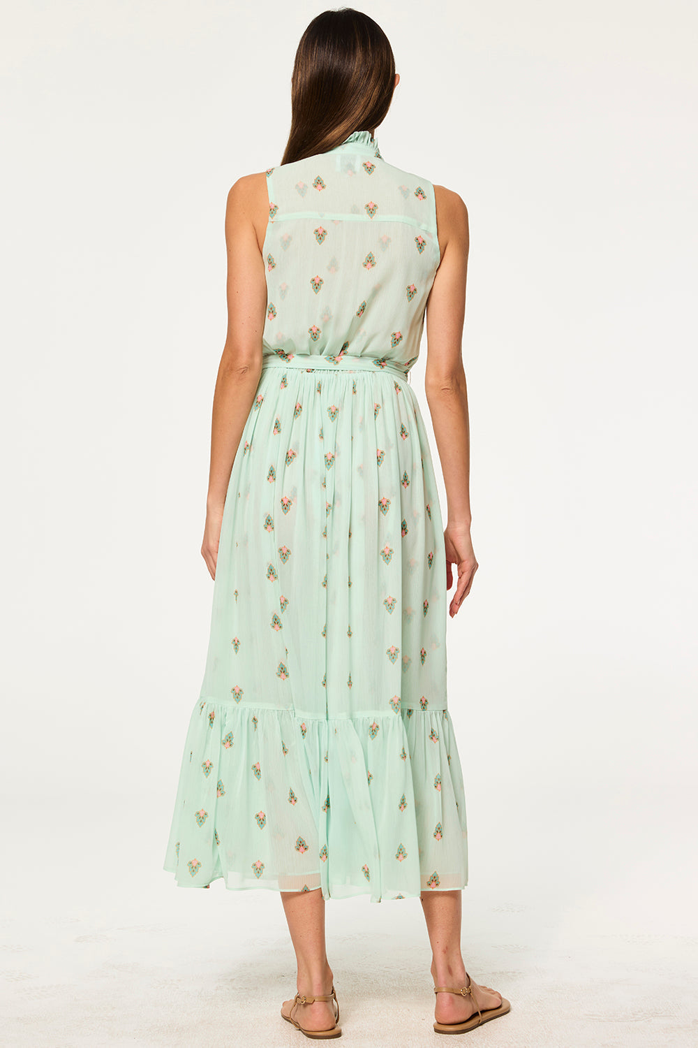 Thebez is an effortless and timeless midi dress cut from our airy Bohemian print chiffon in fresh mint. Designed with an elasticated waist and optional self-tie belt, this sleeveless silhouette features a ruffle-trimmed stand collar and a covered button front that extends to a wide ruffle hem. Finished with double side-slit pockets and self-lining for easy wear, it’s the perfect balance of charm and comfort.