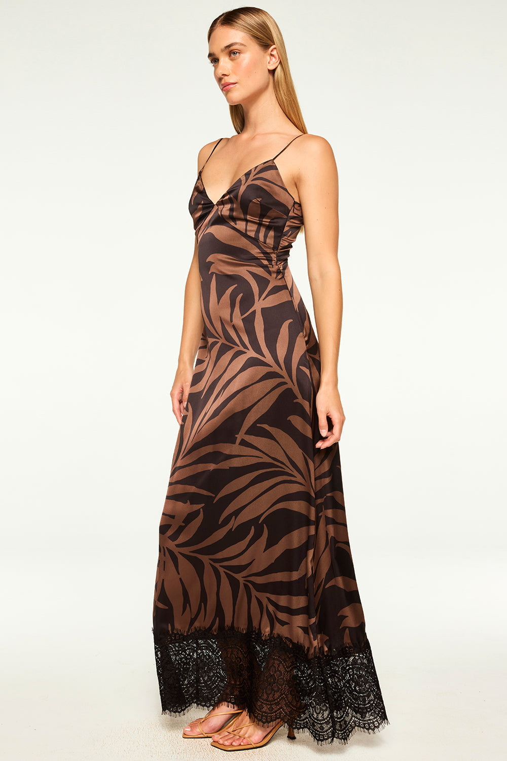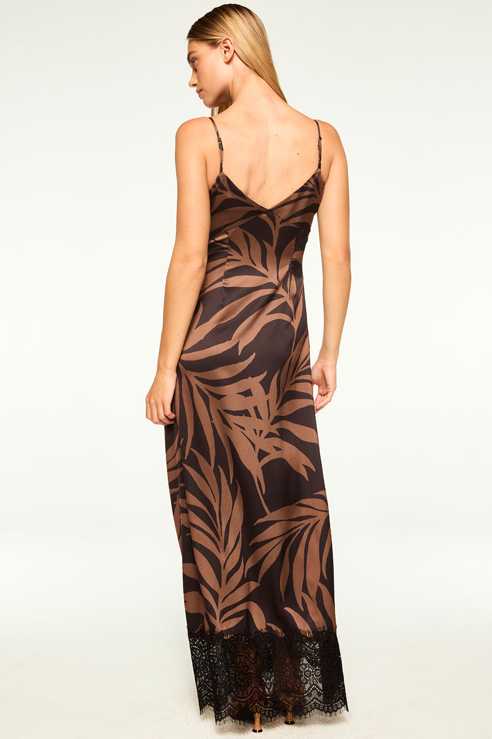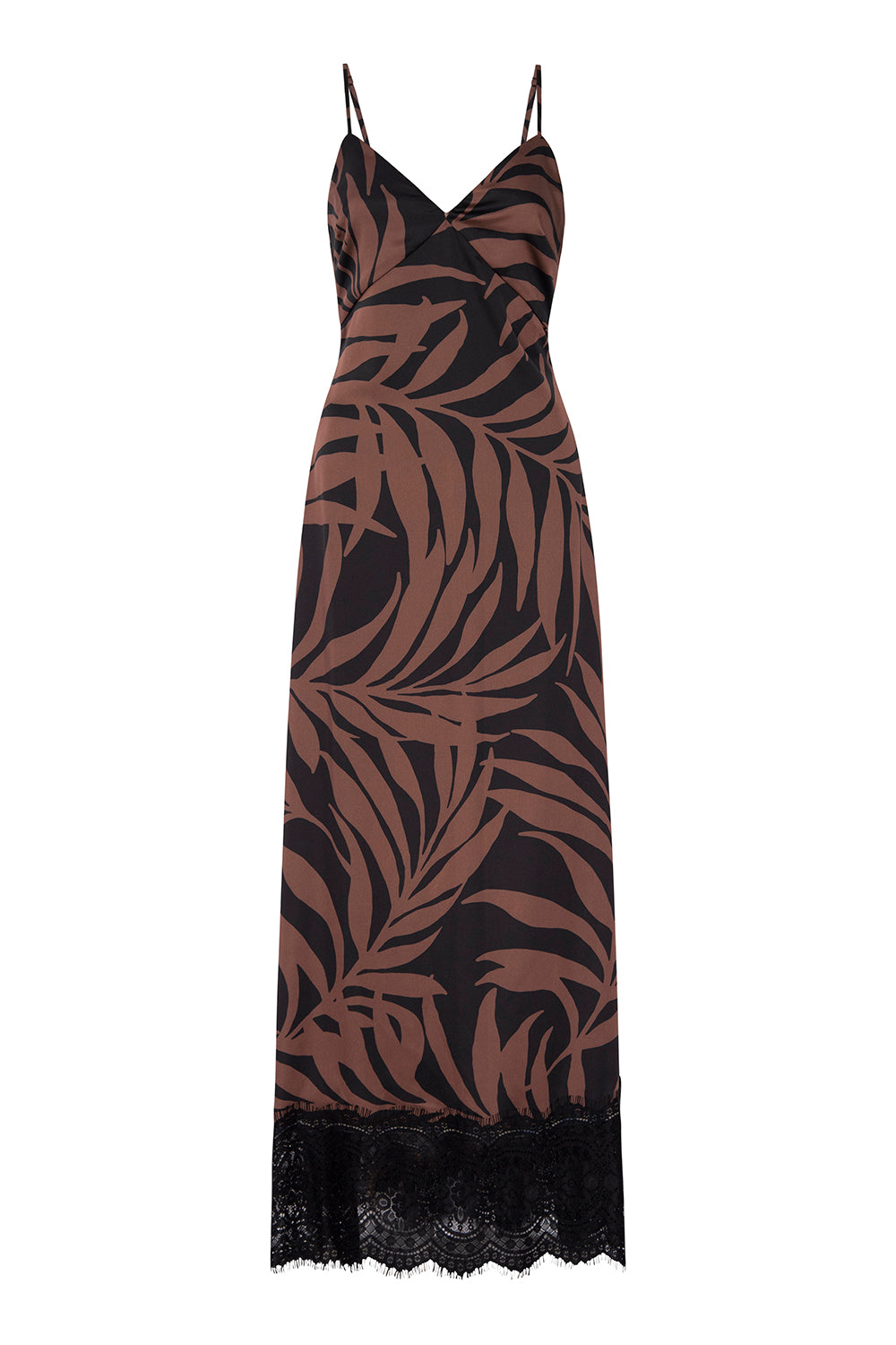 Tova is a maxi length slip dress in our gorgeous chocolate and black Palm Frond print satin finished with a wide black lace hem. Adjustable spaghetti straps and a v neckline. Top with our black Joanne blazer for a chic date night look.