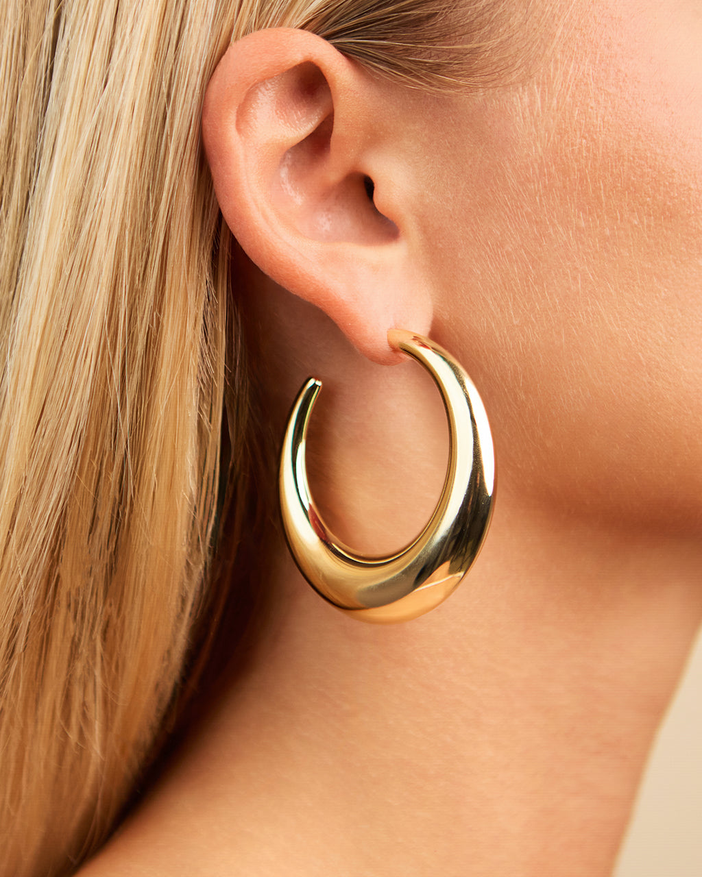 Turn heads no matter where you are! These sleek open hoop earrings are sure to add shine to all of your favorite looks. Available in gold and silver tones.