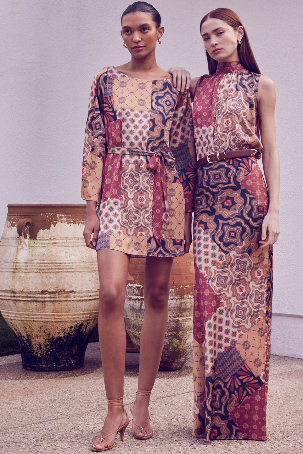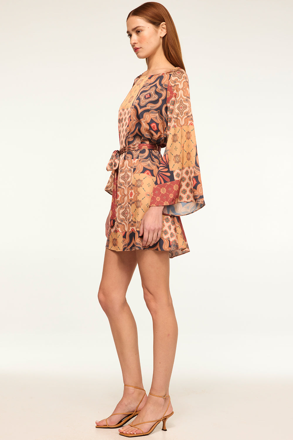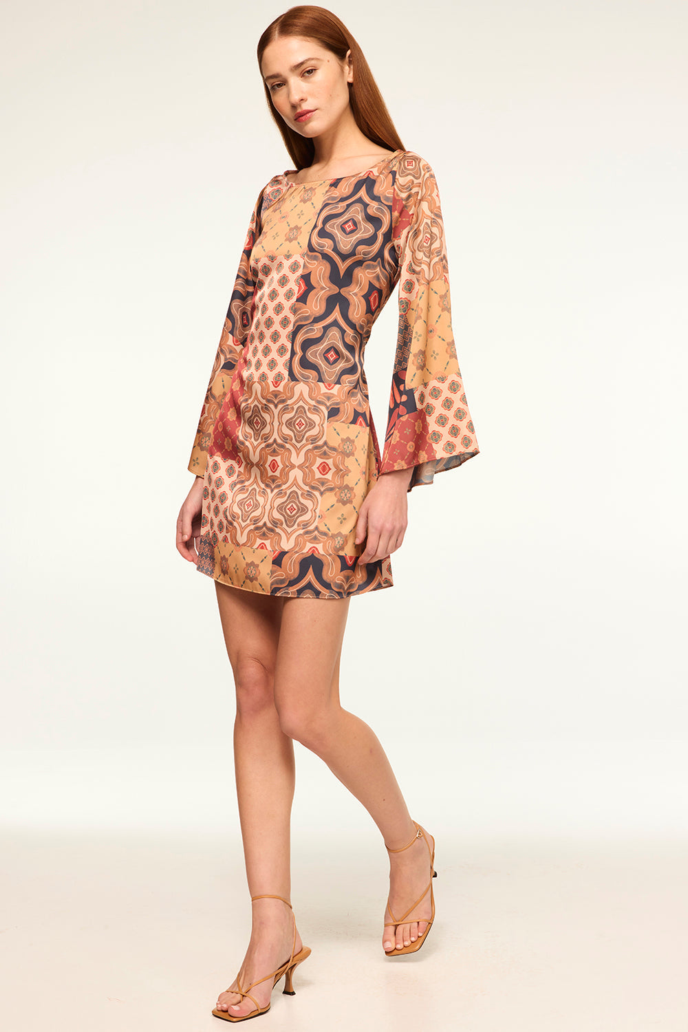A chic update on a classic shift style, our best-selling Twiggy dress is a timeless mini silhouette cut from our fall-ready Surreal Patchwork print satin. A boat neckline leads into long bell sleeves and an adjustable tie waist. Remove the belt and pair with flats for an easy daytime look that seamlessly transitions to the perfect dinner look.