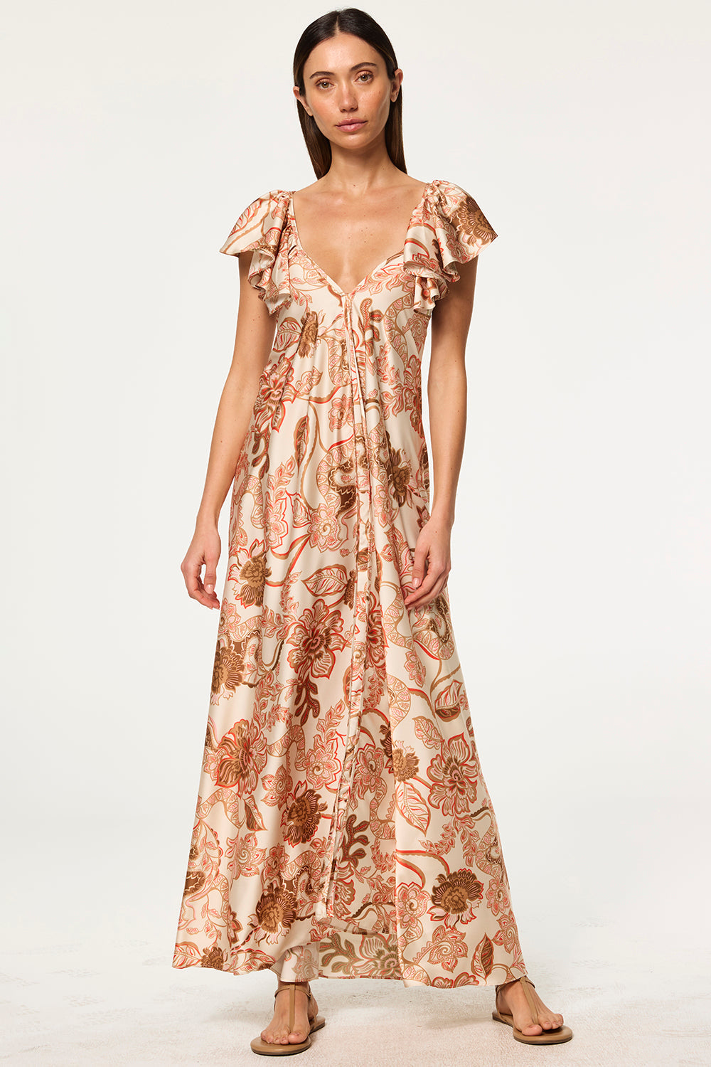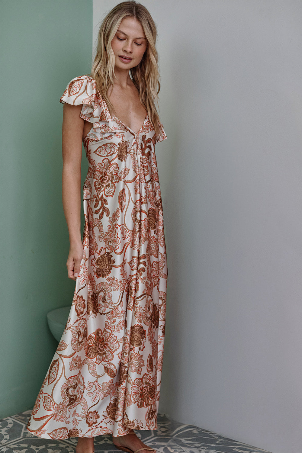 Our new Velora dress is an effortlessly feminine maxi cut from beautiful Summer Batik satin that transitions easily into the next season. Ruffled short sleeves drape the shoulders for an almost sleeveless feel, while a deep V neckline flows into an easy, ankle-grazing skirt. The ruffled shoulders lead into a low back with an adjustable crisscross tie for a customizable fit. The perfect dress for all your getaways and special moments.