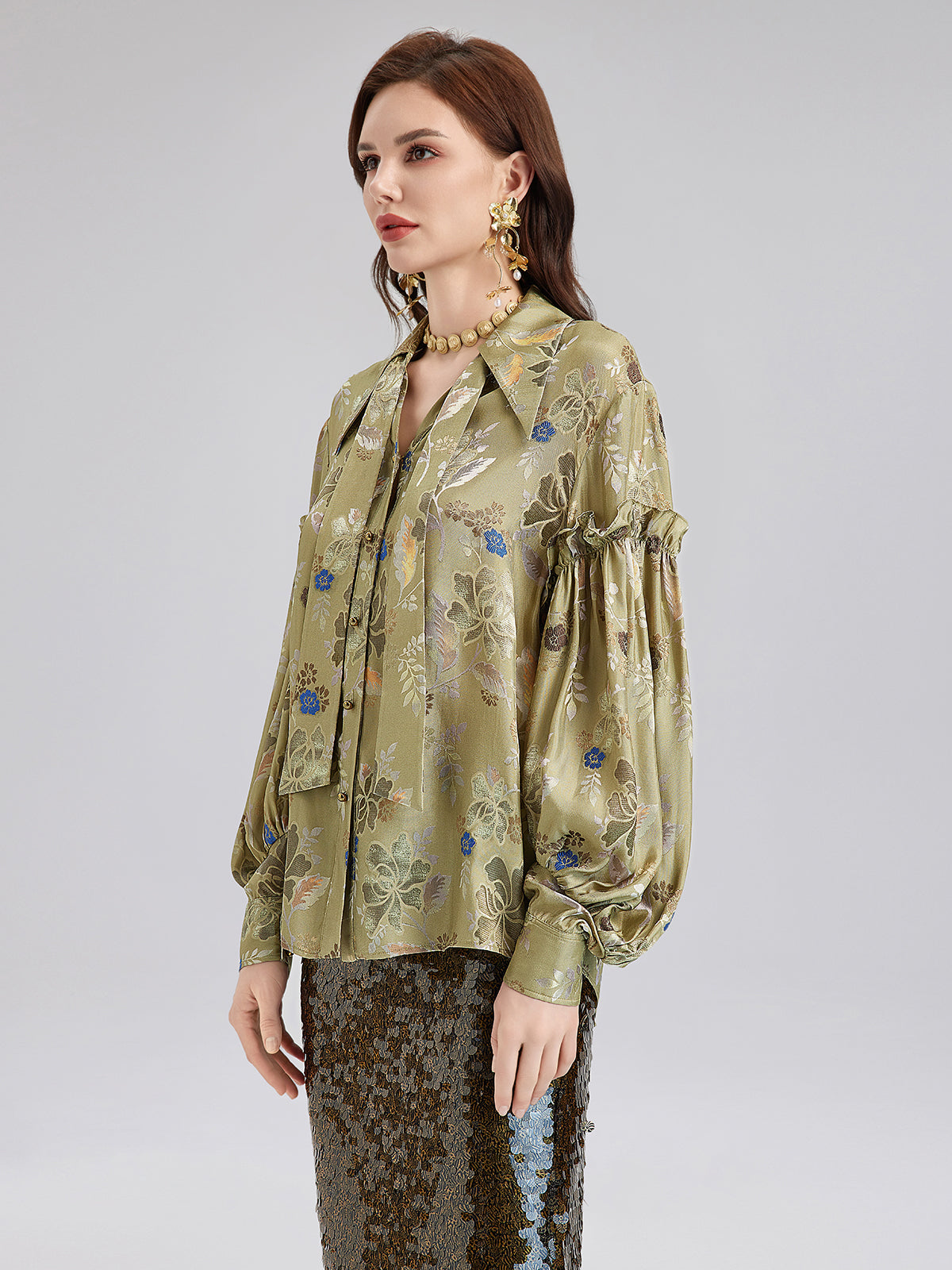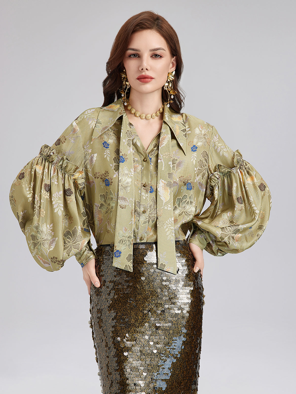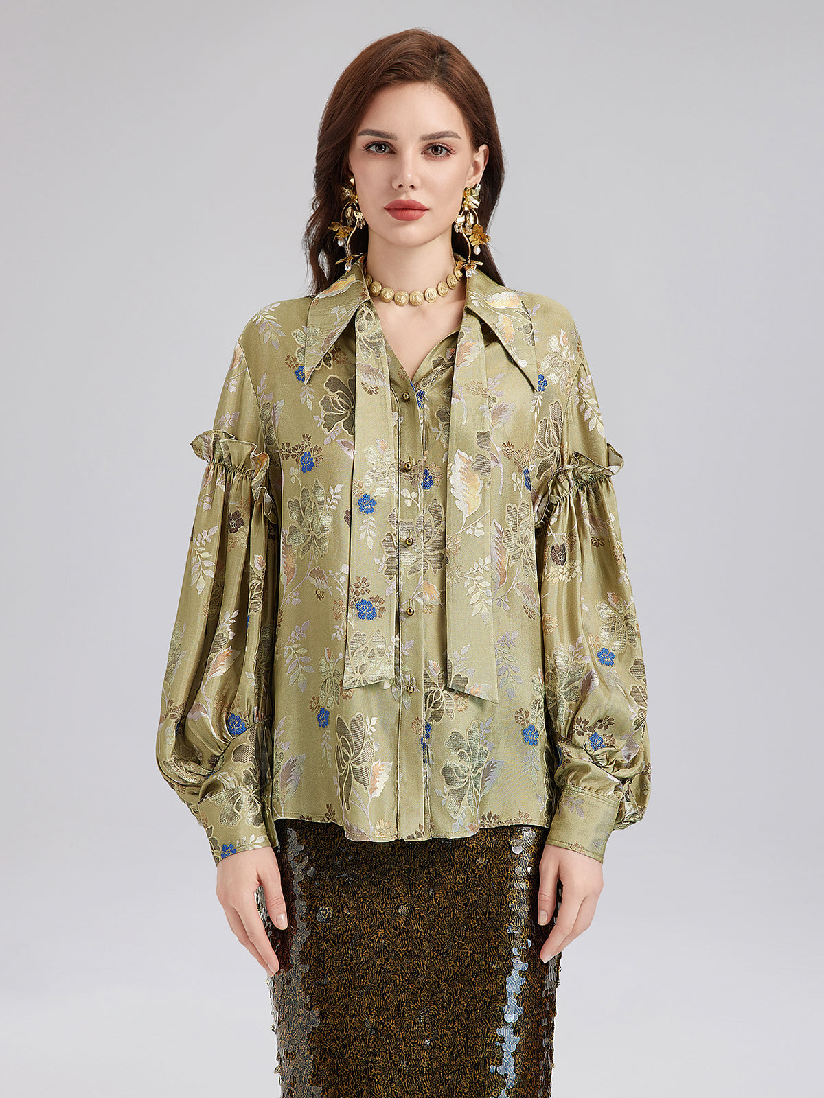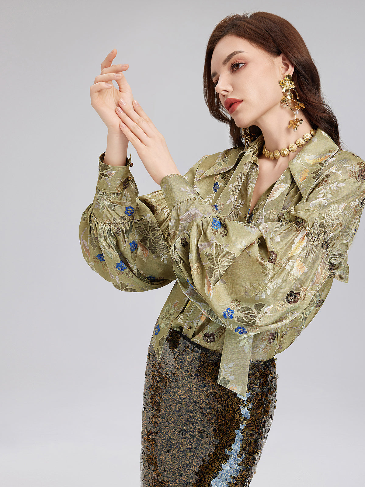 Crafted from premium glossy viscose jacquard with a refined texture, structured yet fluid silhouette with a flowing hem. Adjustable tie-neck and ruffled cuffs enhance the romantic, vintage feel. The cuffs are adorned with 3D ruffled edges, creating a vintage, royal atmosphere. Relaxed fit suits all shapes.