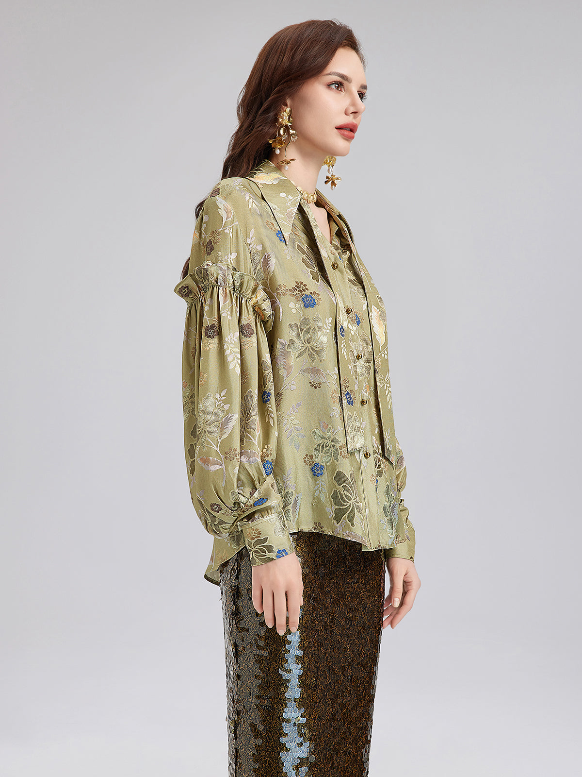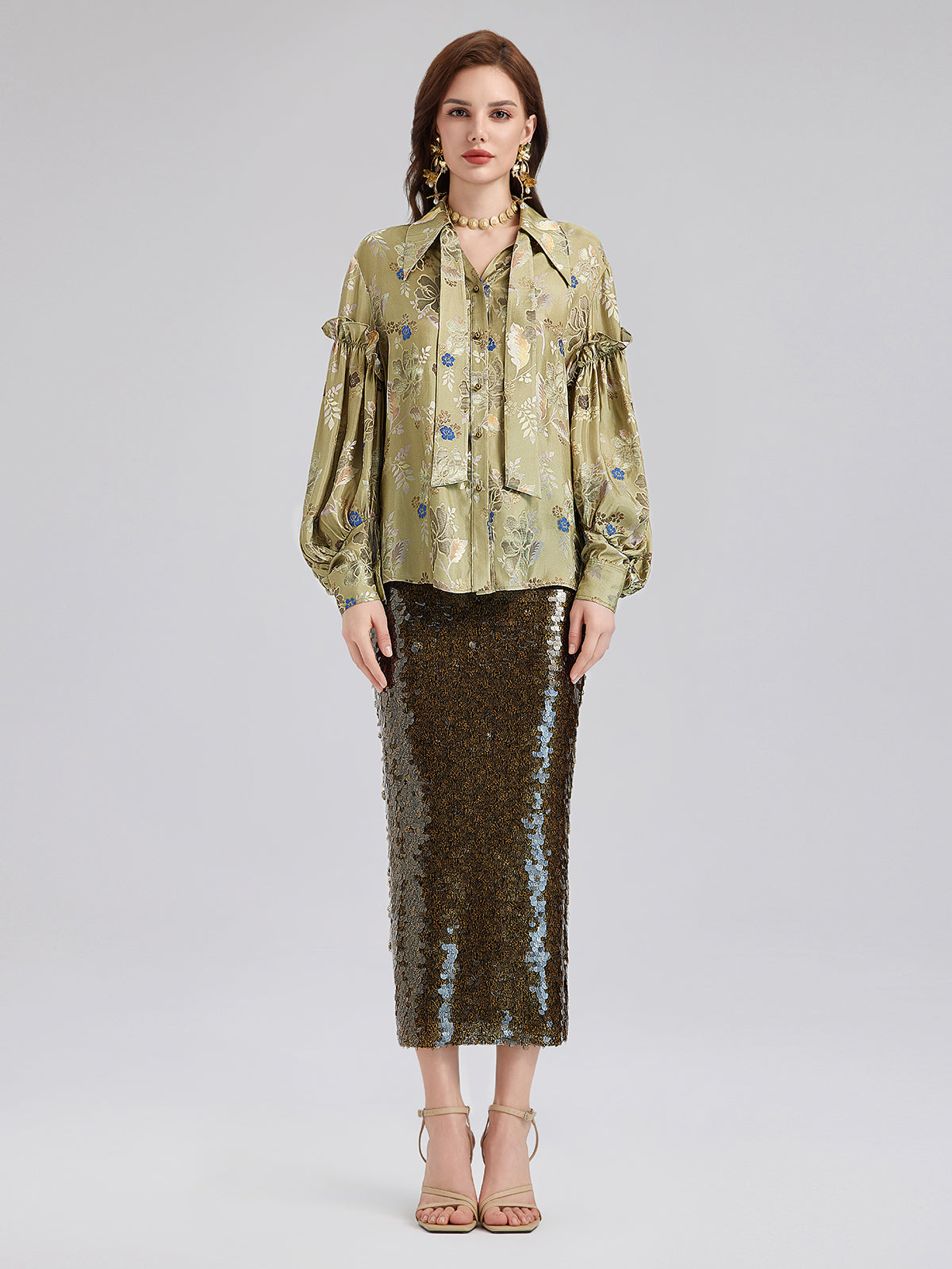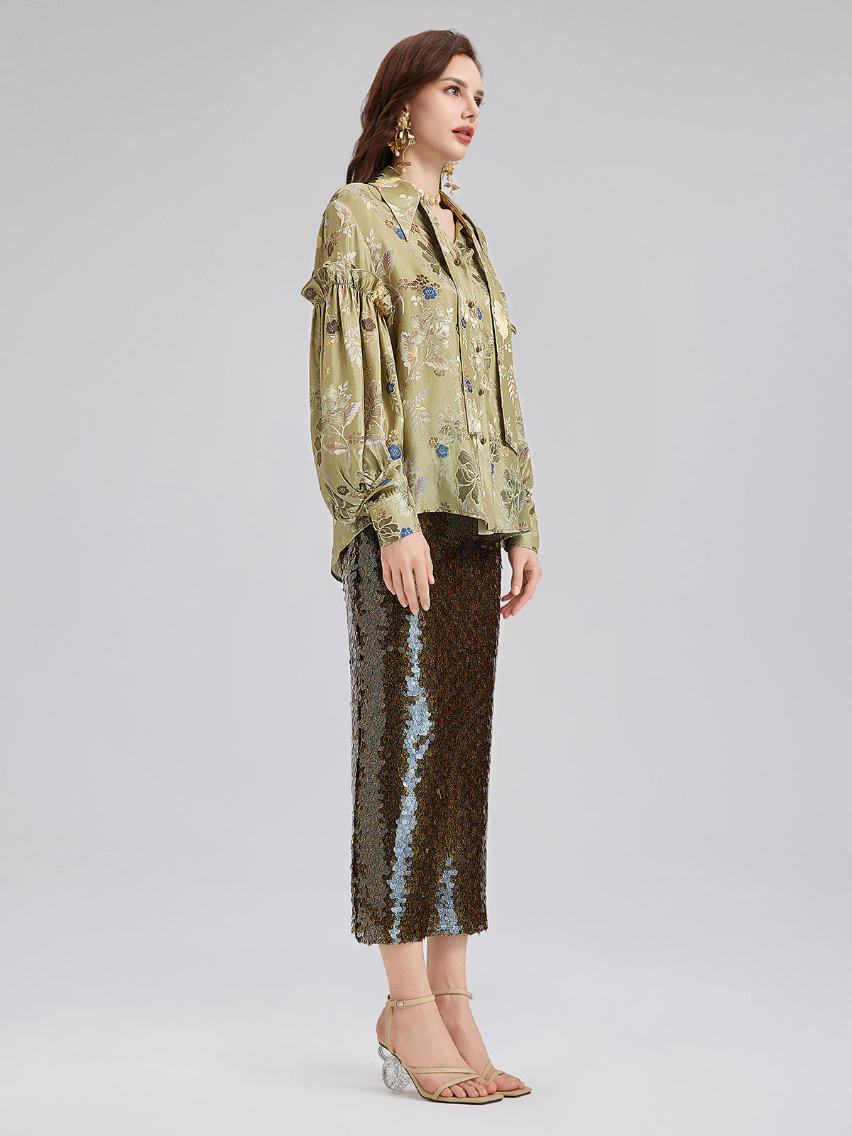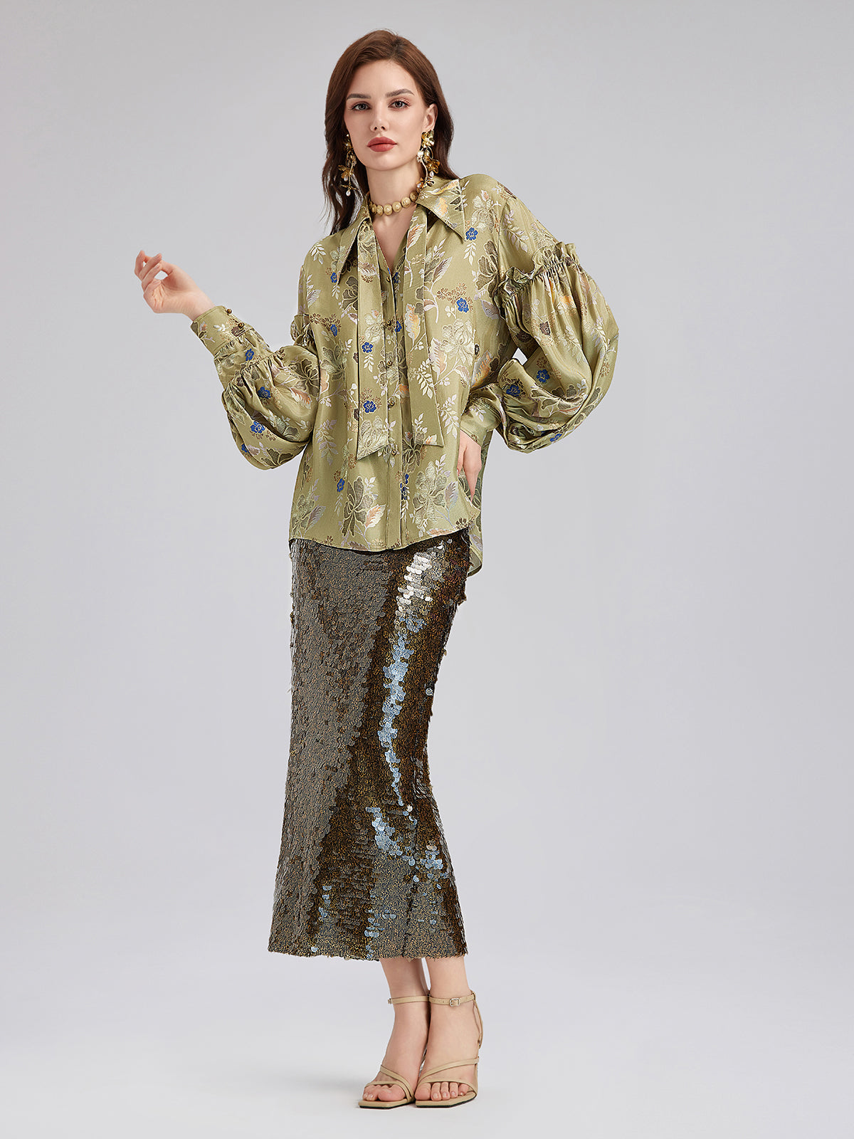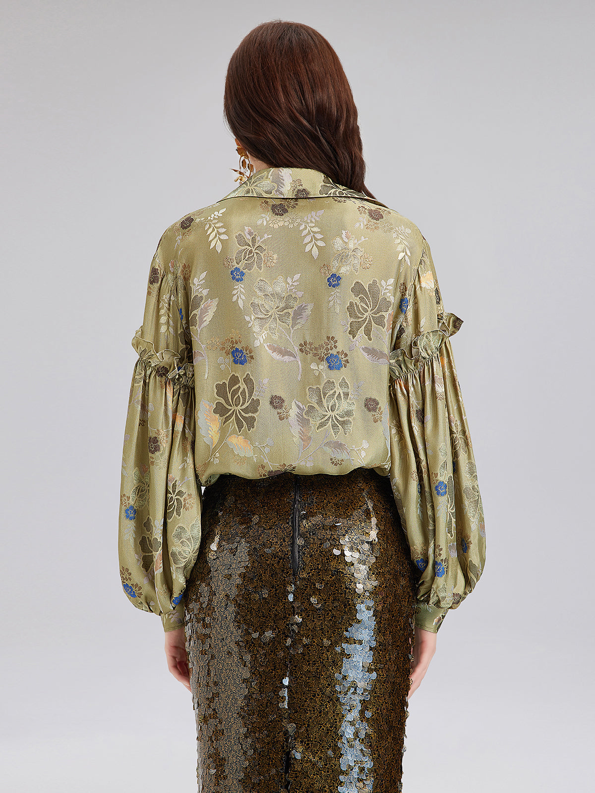 Crafted from premium glossy viscose jacquard with a refined texture, structured yet fluid silhouette with a flowing hem. Adjustable tie-neck and ruffled cuffs enhance the romantic, vintage feel. The cuffs are adorned with 3D ruffled edges, creating a vintage, royal atmosphere. Relaxed fit suits all shapes.