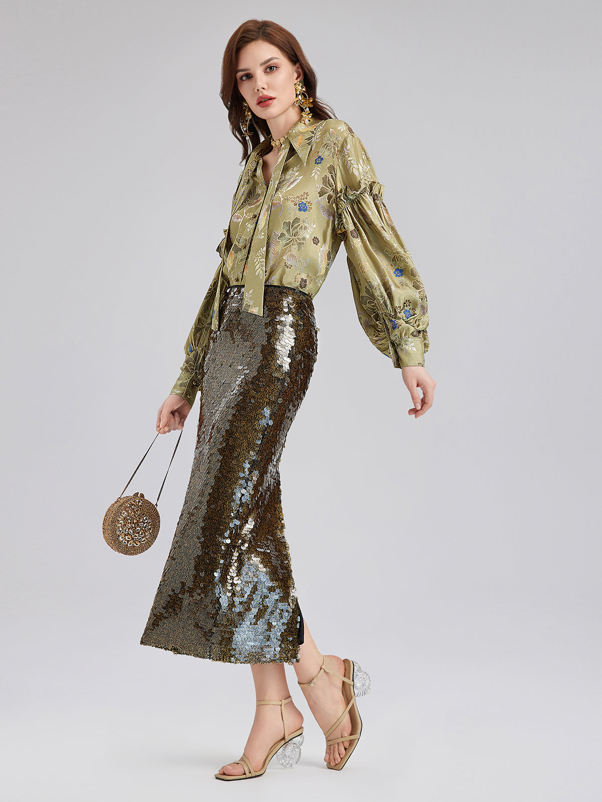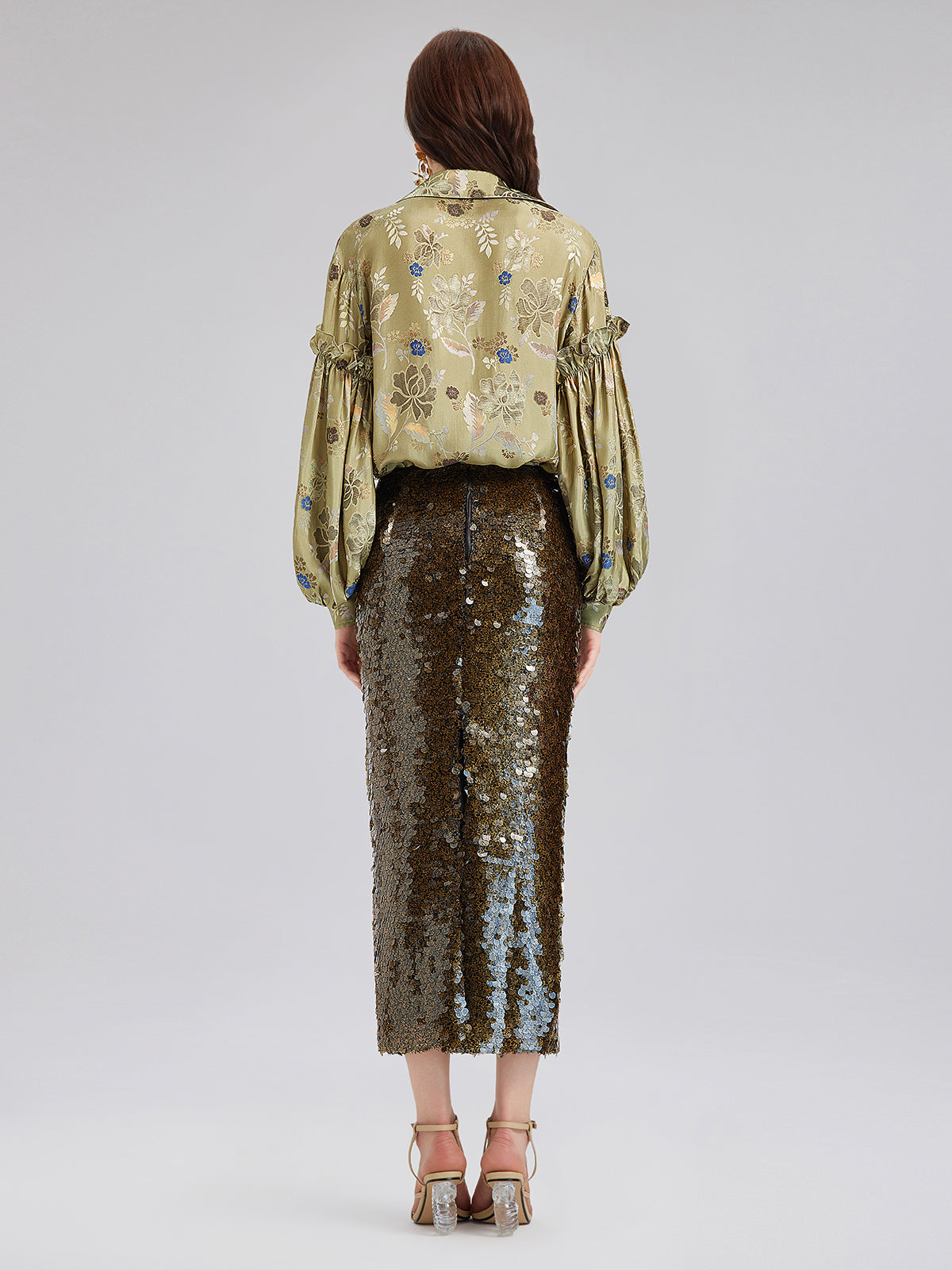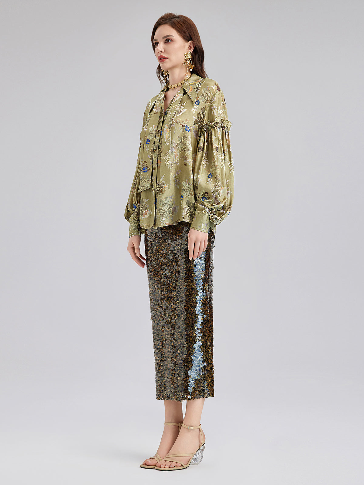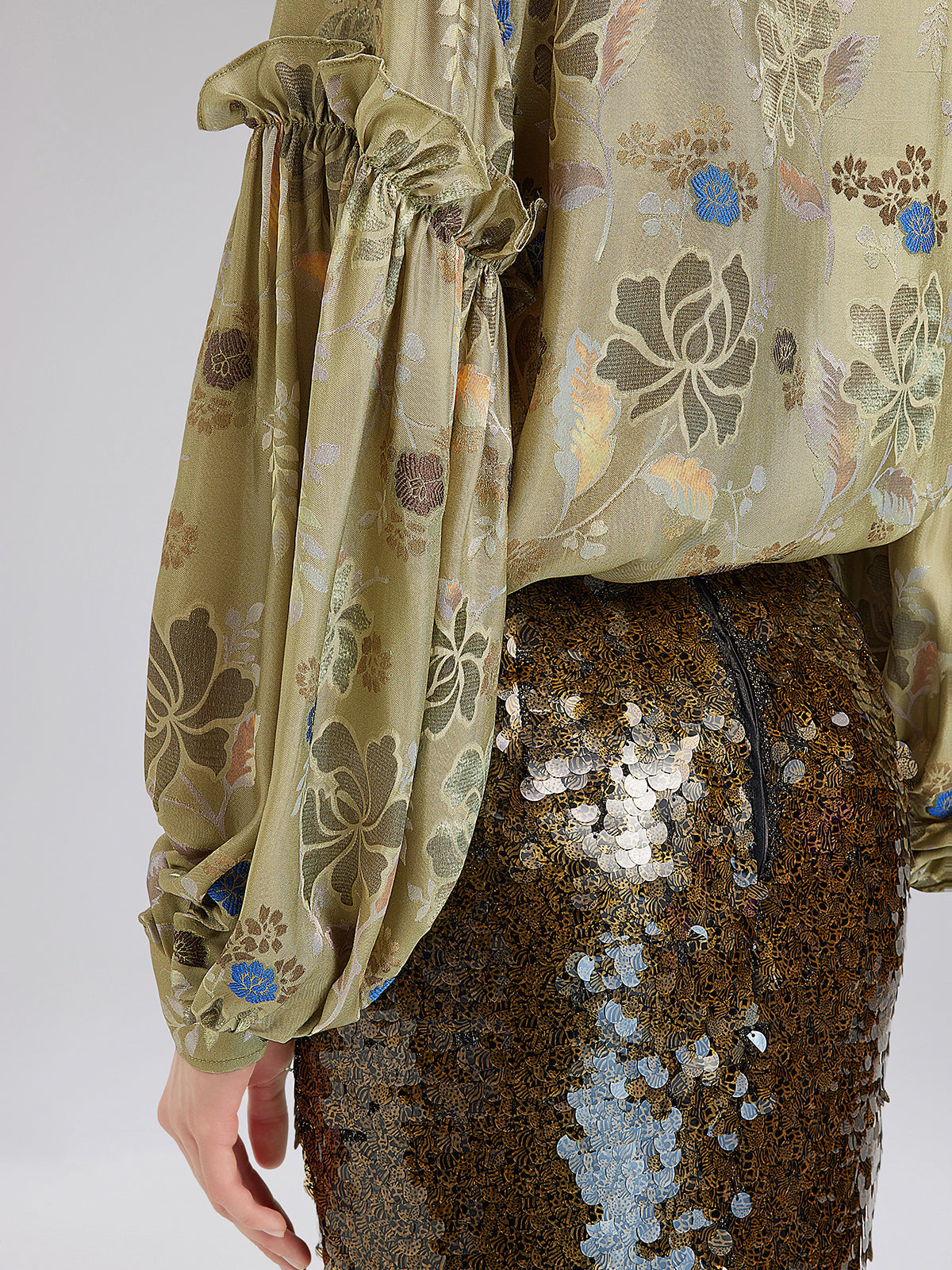 Crafted from premium glossy viscose jacquard with a refined texture, structured yet fluid silhouette with a flowing hem. Adjustable tie-neck and ruffled cuffs enhance the romantic, vintage feel. The cuffs are adorned with 3D ruffled edges, creating a vintage, royal atmosphere. Relaxed fit suits all shapes.