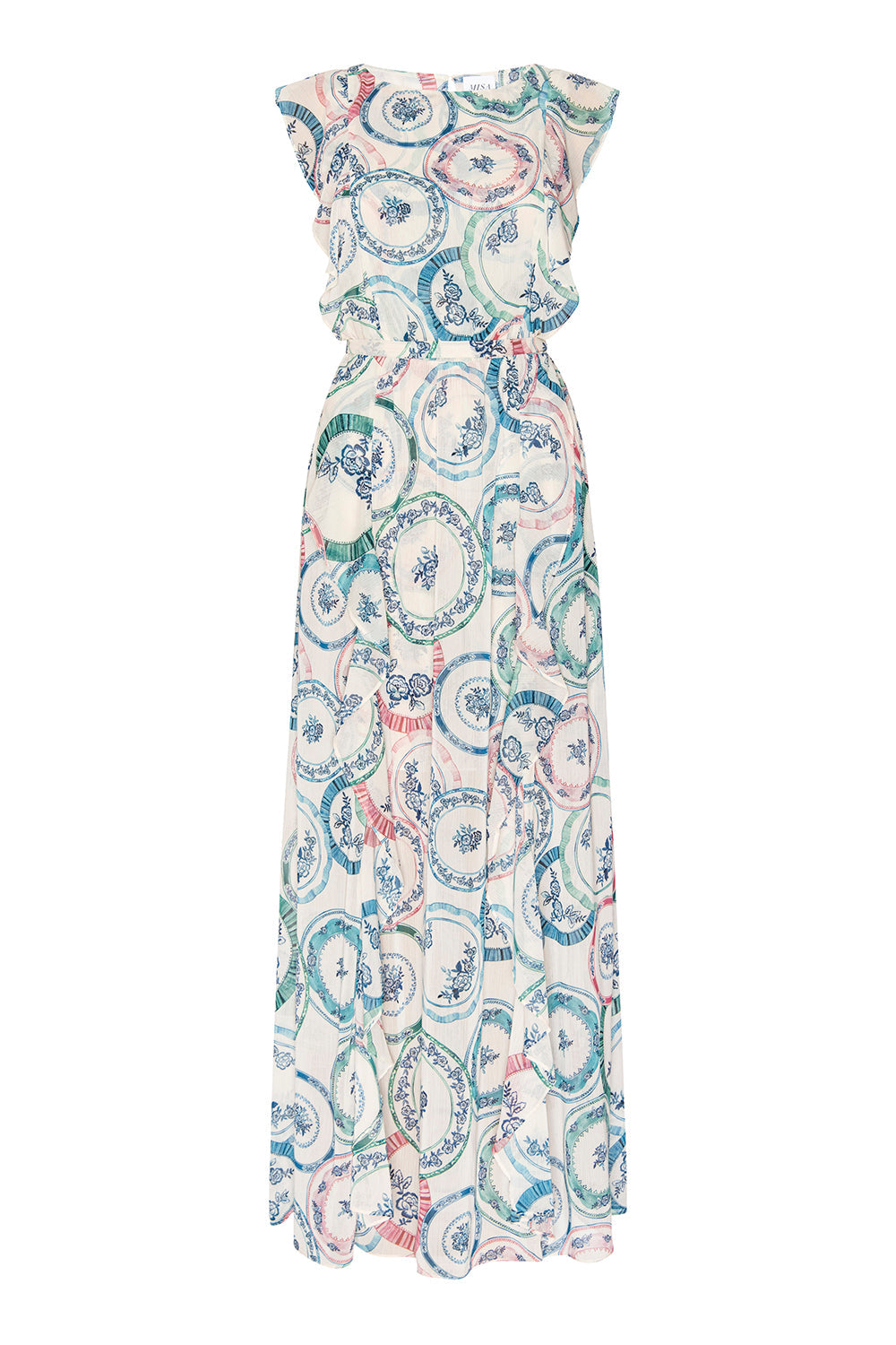 The Virginia dress is a flowing maxi silhouette cut from airy Prismatic Plates–printed chiffon. Double-lined for coverage, it features a high neckline and sleeveless bodice, fitted at the bust and trimmed with a cascading ruffle that extends to the skirt and hem. A gently pleated skirt flows from a defined waist, creating soft movement with every step. Optional self-tie belt. Finished with a hidden keyhole back closure, this style pairs effortlessly with flat sandals or can be dressed up with heels for any occasion.